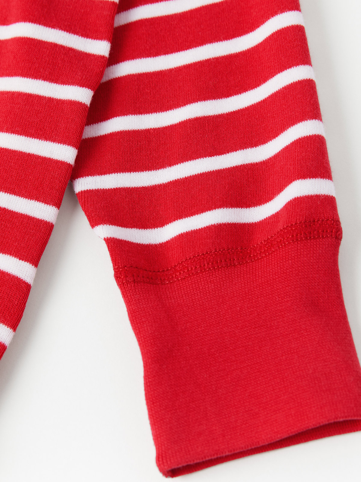 Organic cotton bodysuit in Polarn O. Pyret stripes for baby. Snaps at the shoulder and the crotch facilitate dressing and diaper changing.