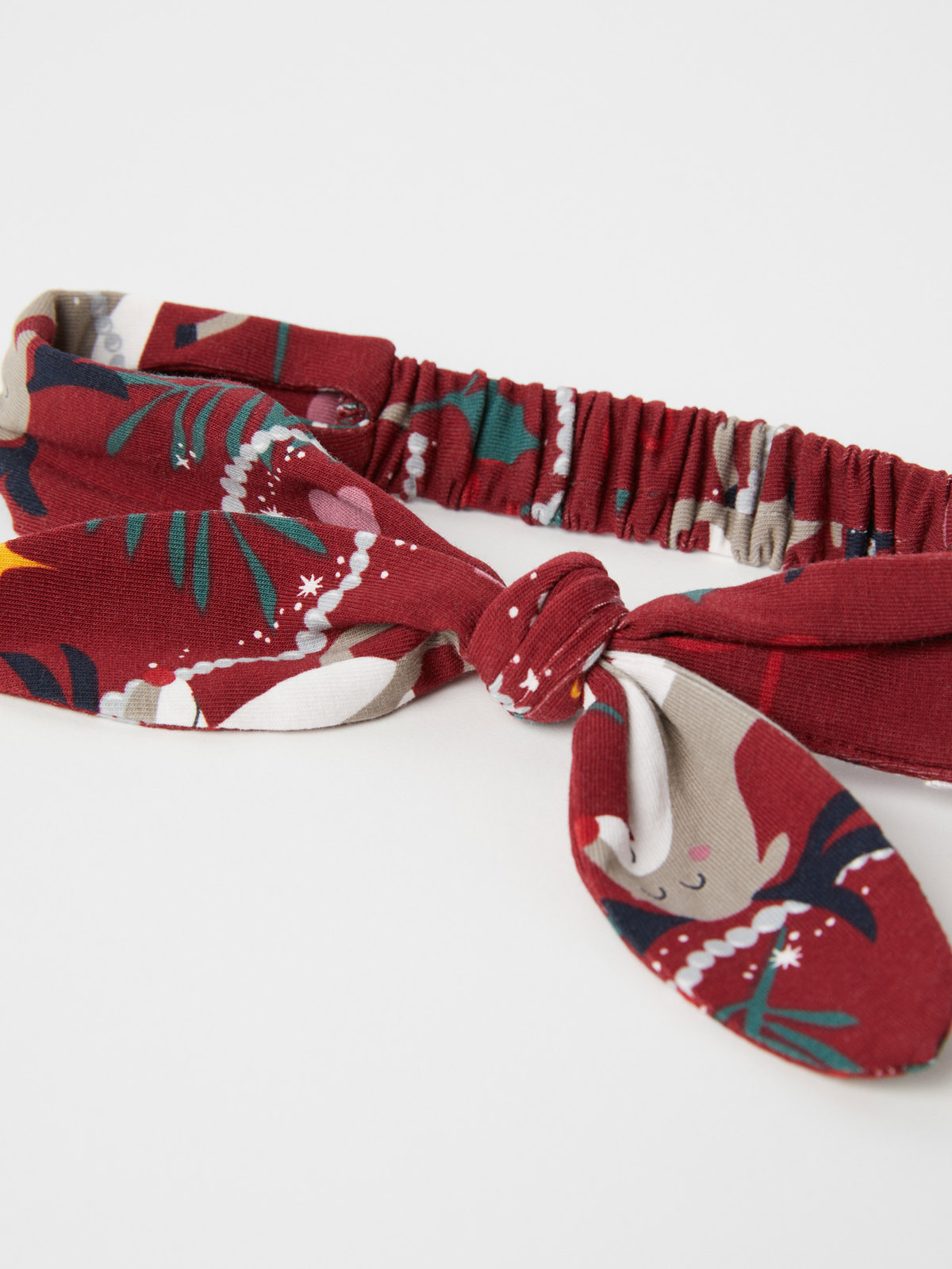 Achtung! Dieses Produkt hat einen Fabrikationsfehler. Elastisches Haarband aus weichem Baumwolltrikot mit weihnachtlich inspiriertem Muster ist mit einer bezaubernden Schleife verziert.