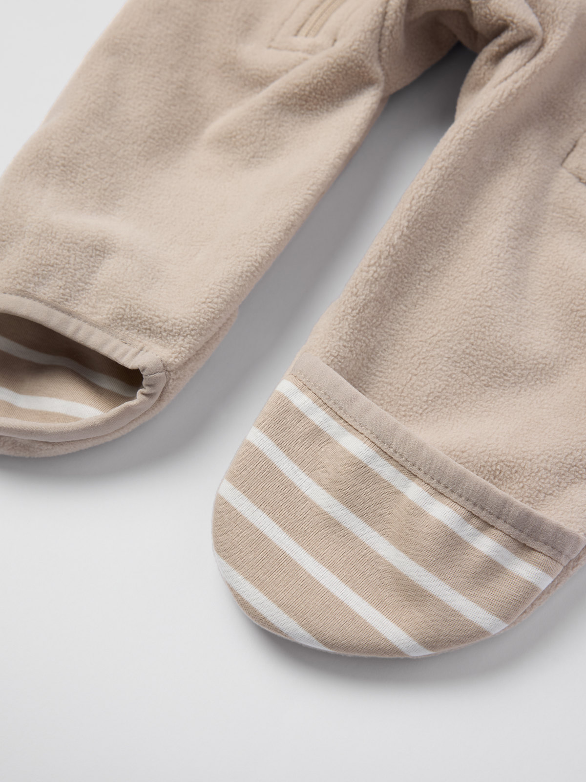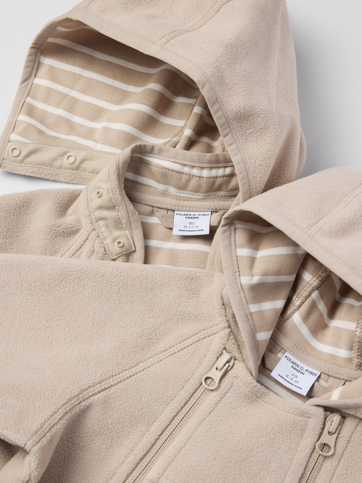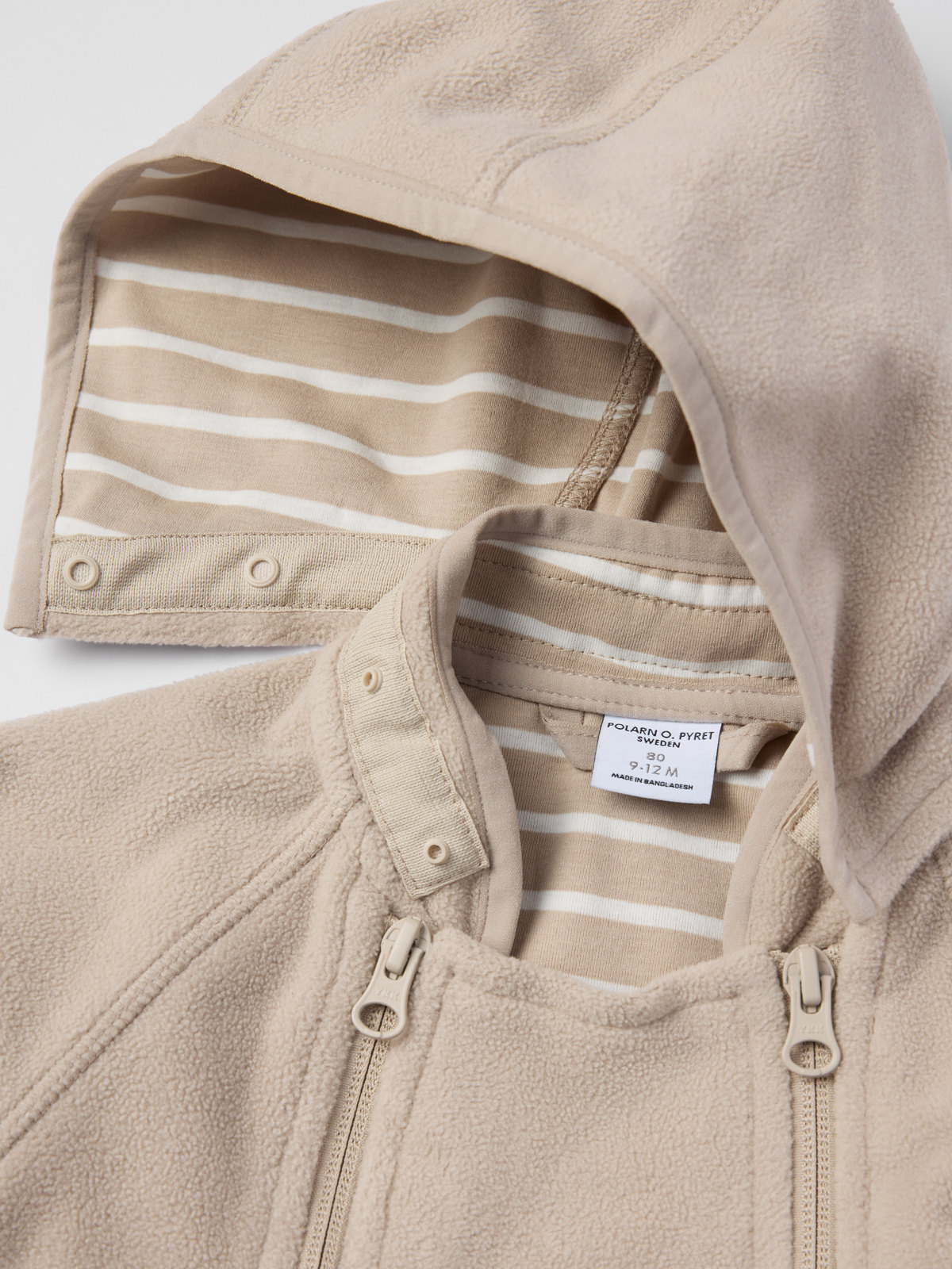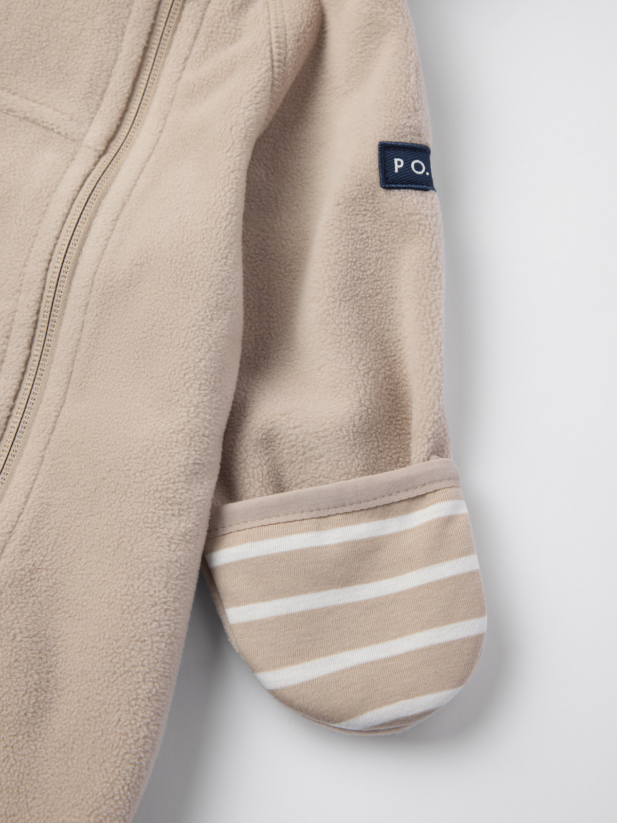 Winddichter, wasserabweisender Windfleece-Overall für Babys. Perfekt im Kinderwagen! Der Overall aus recyceltem Polyester ist atmungsaktiv und mit gemütlichem Trikot aus 100 % Bio-Baumwolle mit unseren klassischen Streifen gefüttert. Er hat eine fest angesetzte Kapuze und zwei Reißverschlüsse an der Vorderseite, die das An- und Ausziehen erleichtern.