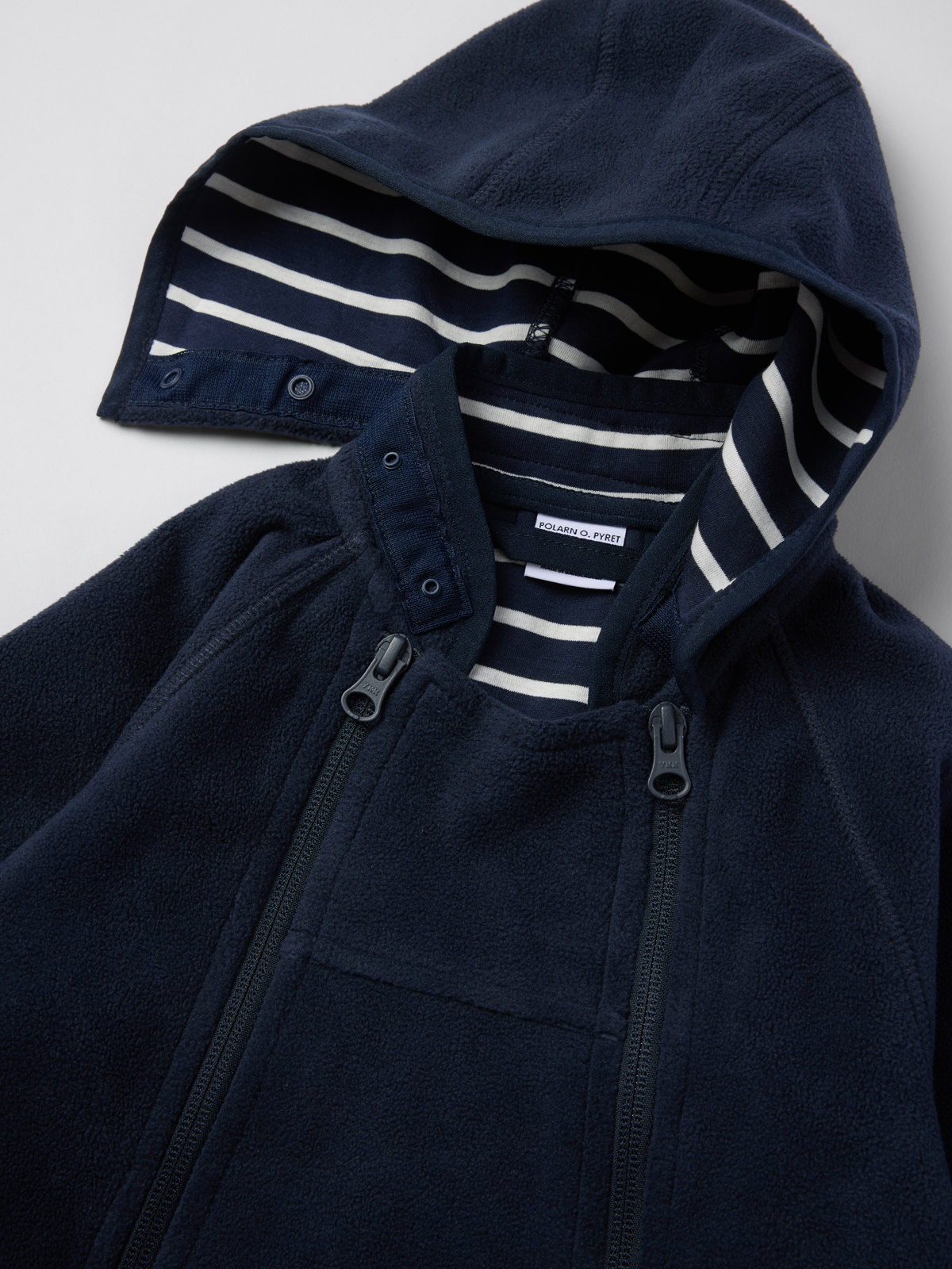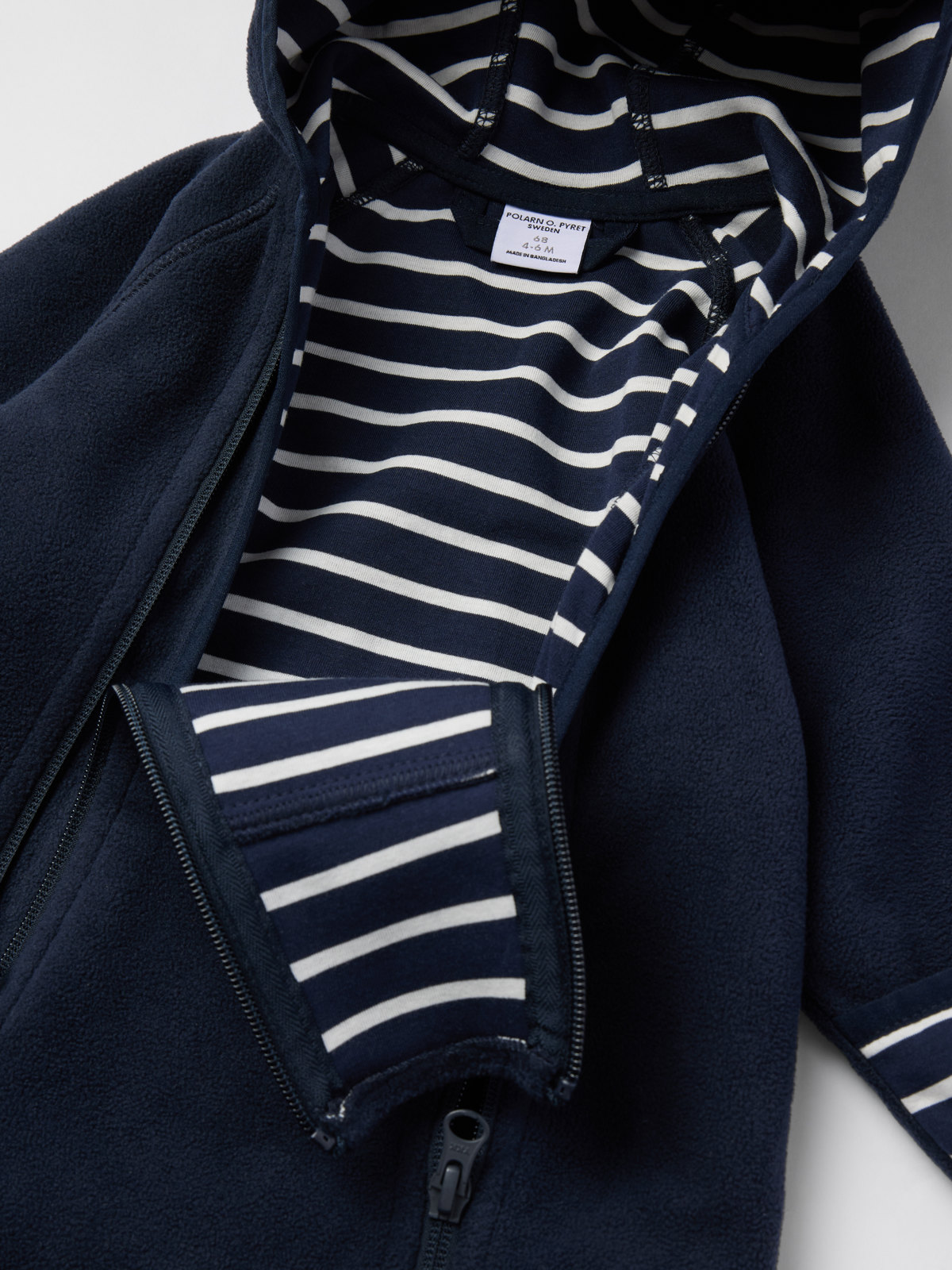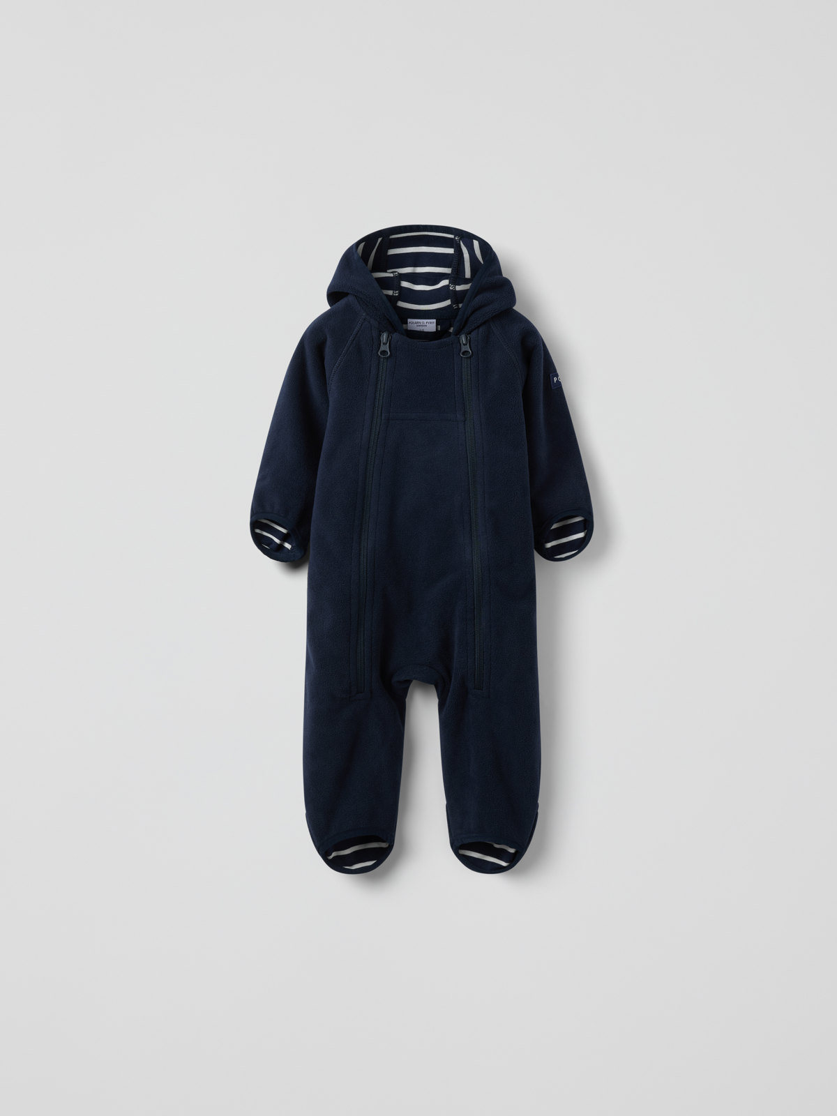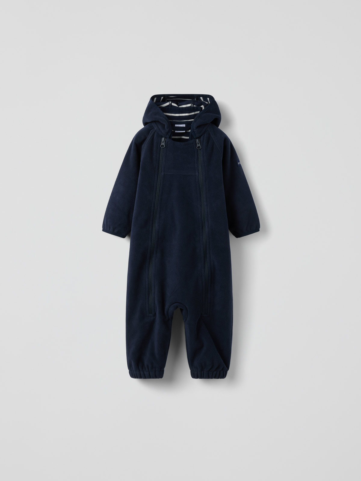 Winddichter, wasserabweisender Windfleece-Overall für Babys. Perfekt im Kinderwagen! Der Overall aus recyceltem Polyester ist atmungsaktiv und mit gemütlichem Trikot aus 100 % Bio-Baumwolle mit unseren klassischen Streifen gefüttert. Er hat eine fest angesetzte Kapuze und zwei Reißverschlüsse an der Vorderseite, die das An- und Ausziehen erleichtern.