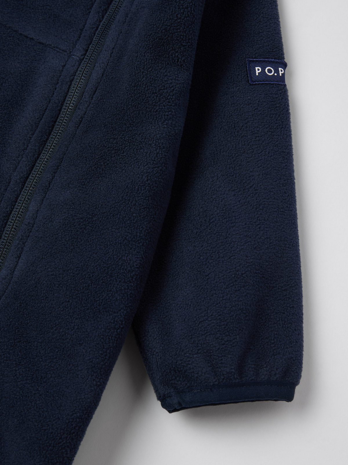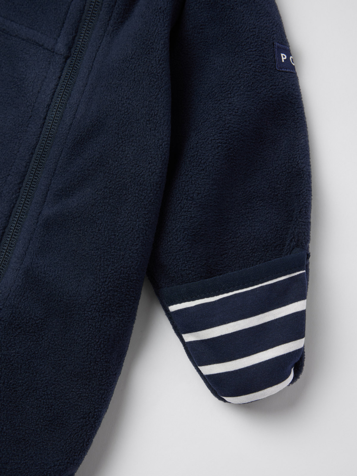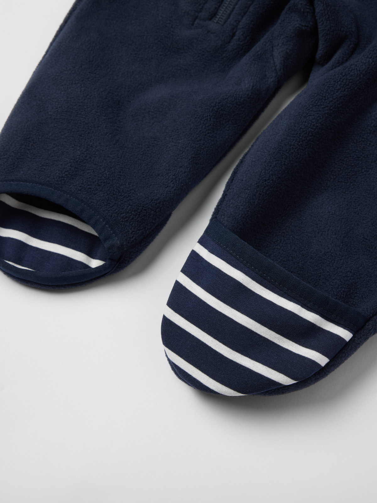 Die Reißverschlüsse sind mit einer inwendigen Windschutzleiste ausgestattet, die vor kaltem Wind schützt. Ein Kinnschutz am oberen Ende verhindert unangenehmes Kratzen an Hals und Wangen. Die abgerundeten Abschlüsse an Ärmeln und Beinen lassen sich umschlagen, sodass die kleinen Hände und Füße schön warm bleiben.