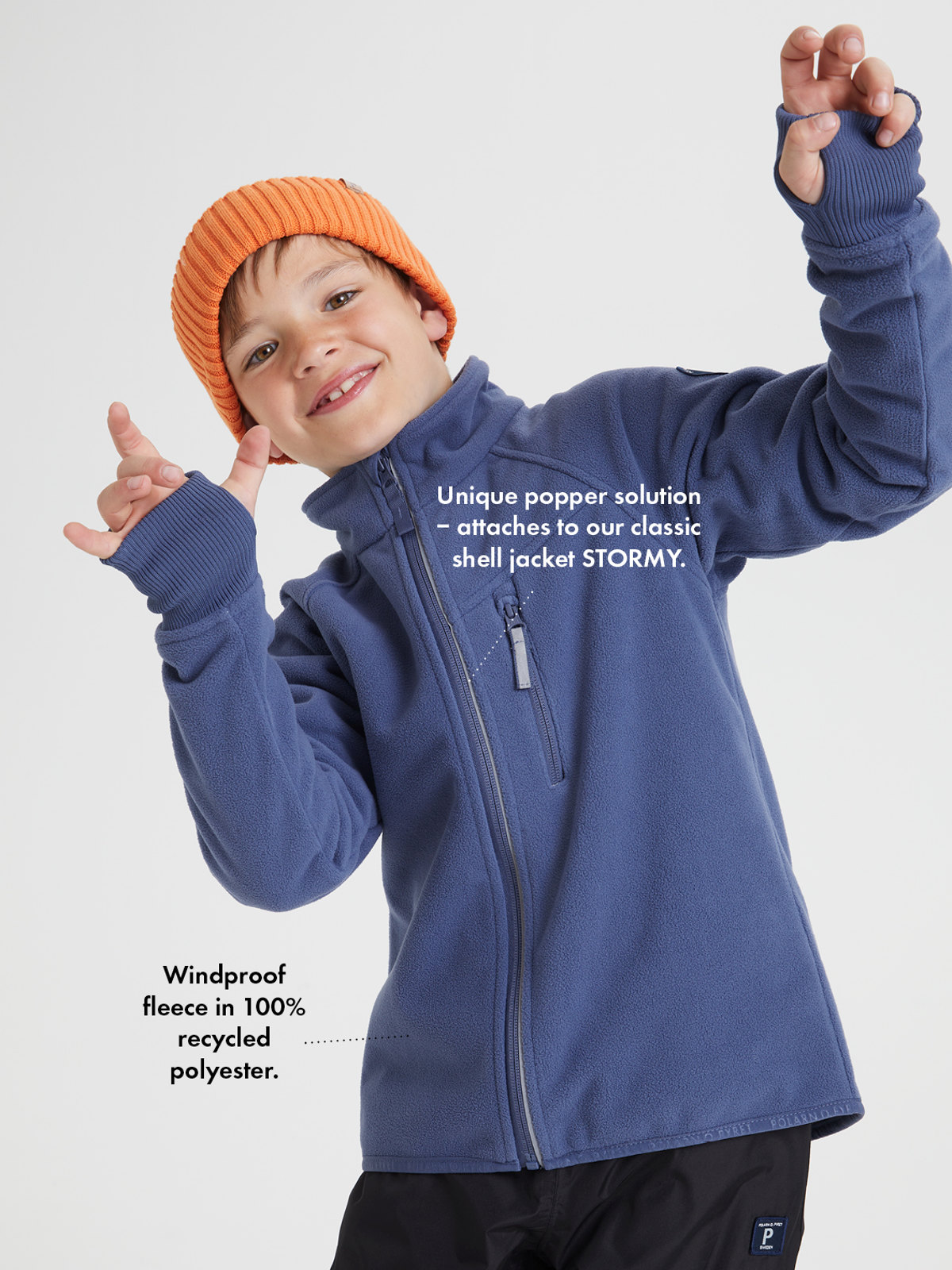 In unserem atmungsaktiven Windfleece aus recyceltem Polyester bleiben Kinder mollig warm und trocken. Die inwendige Windschutzleiste am Reißverschluss schützt vor kalter Luft. Der Kinnschutz am Reißverschluss sorgt dafür, dass an Hals und Wangen nichts kratzt. Dank der praktischen Knopflösung lässt sich die Jacke im Handumdrehen an unsere klassische Shelljacken knöpfen. Unser Windfleece ist zwei Kleidungsstücke in einem. Es kann unter einer Shelljacke (als 2. Schicht) und an milden Tagen als Outdoor-Jacke (als 3. Schicht) getragen werden.