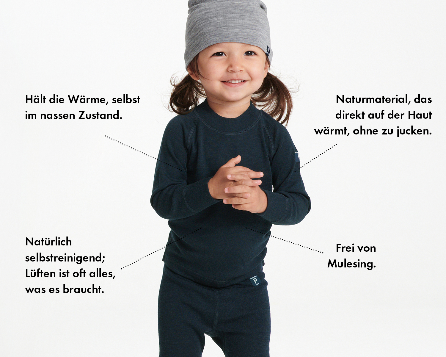 Daher sollte man Materialien wählen, die warm und trocken halten. Wir empfehlen aus diesem Grund Unterwäsche aus Wolle. Wolle ist das Supermaterial der Natur. Es atmet und besitzt die Fähigkeit, richtig gut zu wärmen, selbst, wenn es feucht ist. Darum ist Wolle besonders gut für Neugeborene und kleine Kinder geeignet, die ihre Körpertemperatur noch nicht so gut regulieren können, wie ältere Kinder und Erwachsene.
