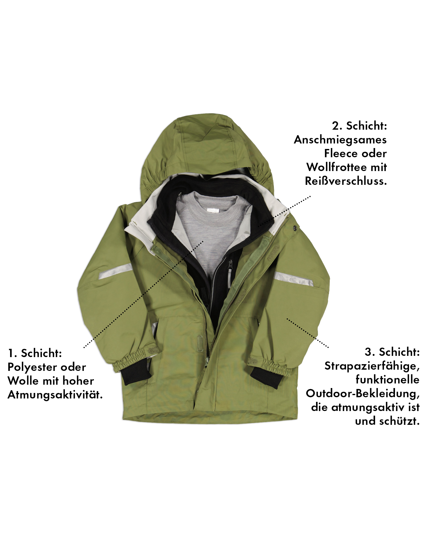 Die Zwischenschicht hat die Funktion einer wärmenden Isolierung. Eine gute Zwischenschicht - oder Isolationsschicht - ist luftig und besitzt gute atmungsaktive Eigenschaften. Sie hält die Wärme und leitet zugleich Feuchtigkeit ab, damit das Kind warm und trocken bleibt, auch wenn es schwitzt.