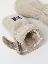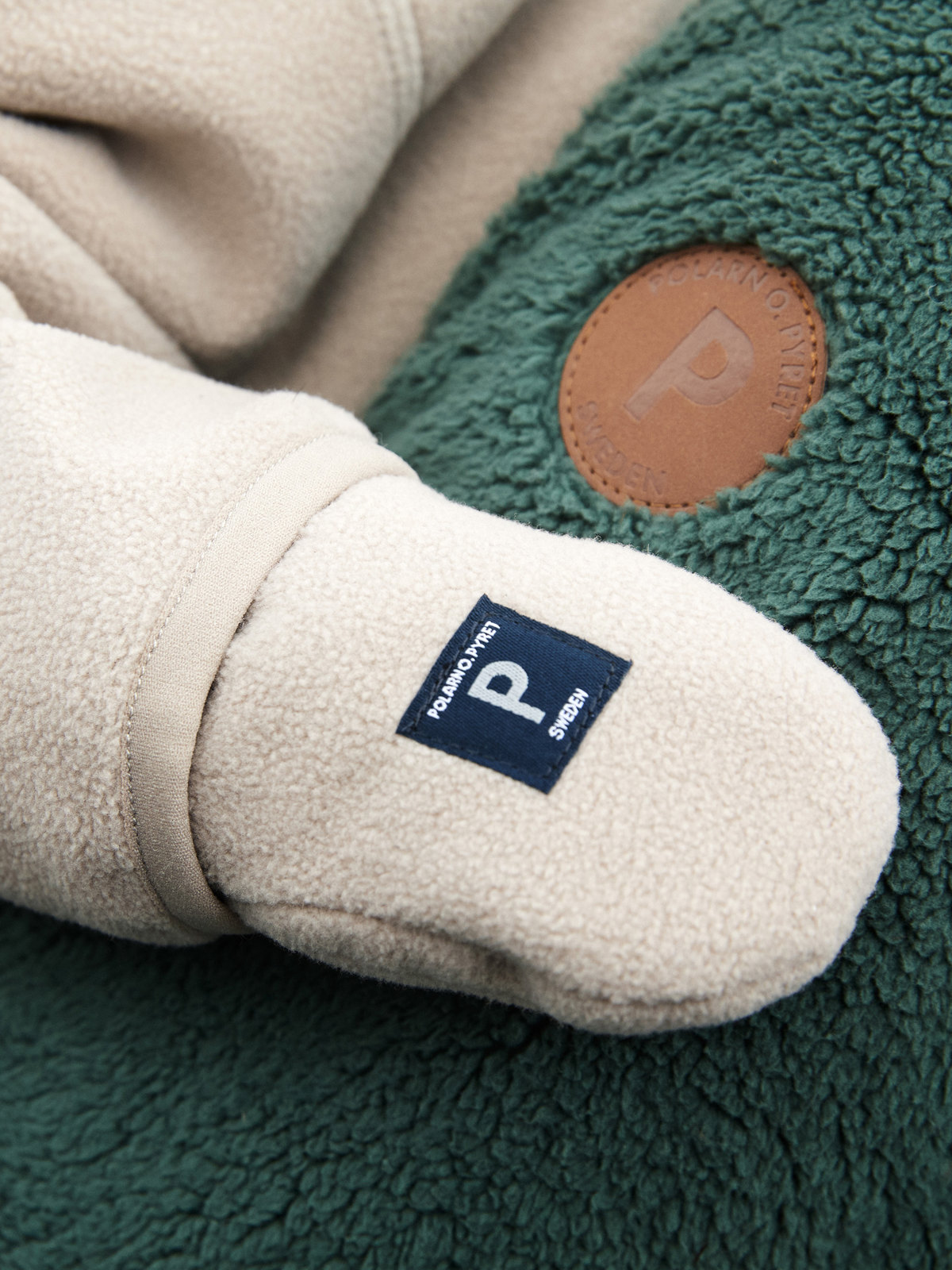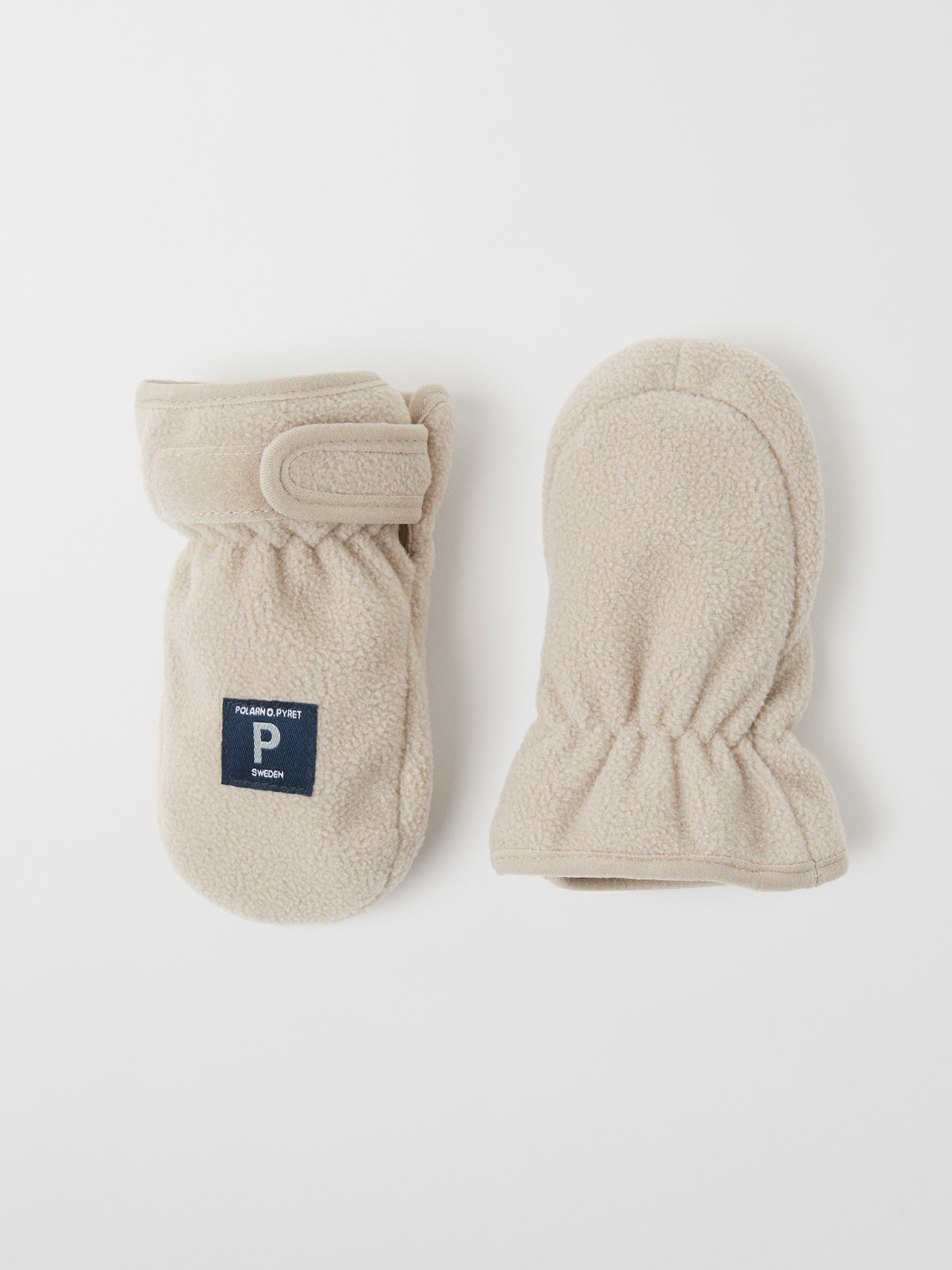 The mittens are made from recycled polyester and have a 100% organic cotton jersey lining. The mittens have a wide opening that makes them easier to put on and take off, and elastic around the wrist, as well as velcro fastening at the front.