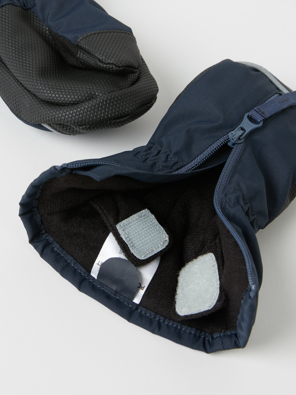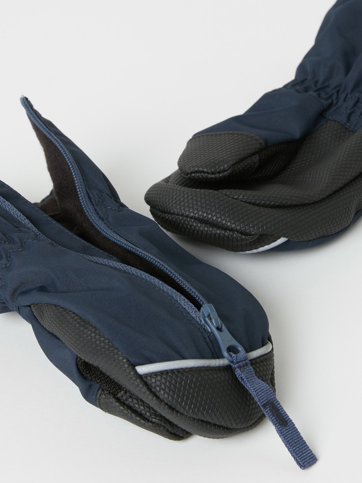 Wind and waterproof mittens. The mittens have a comfy fleece lining and a long zipper on the upper side to make them easy to put on and take off. The mittens have reflectors at the front and a grip-friendly surface on the palms.