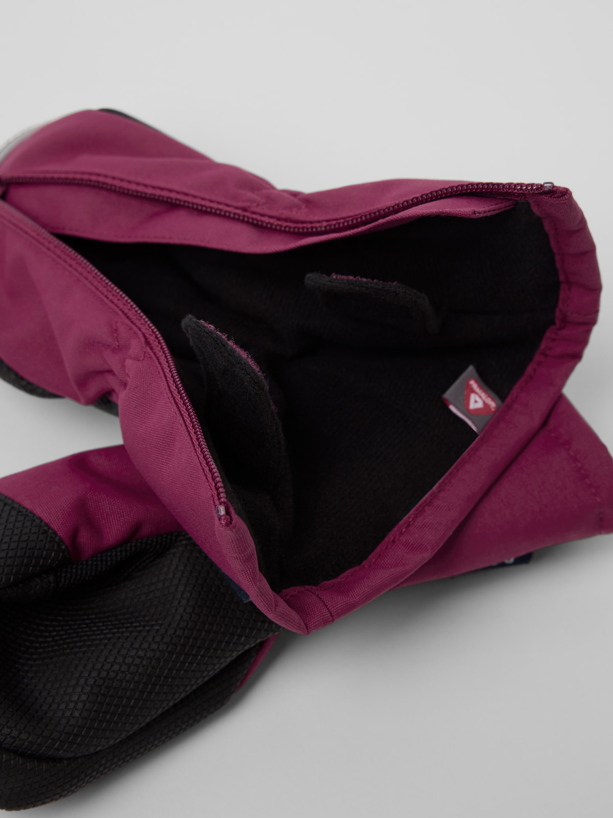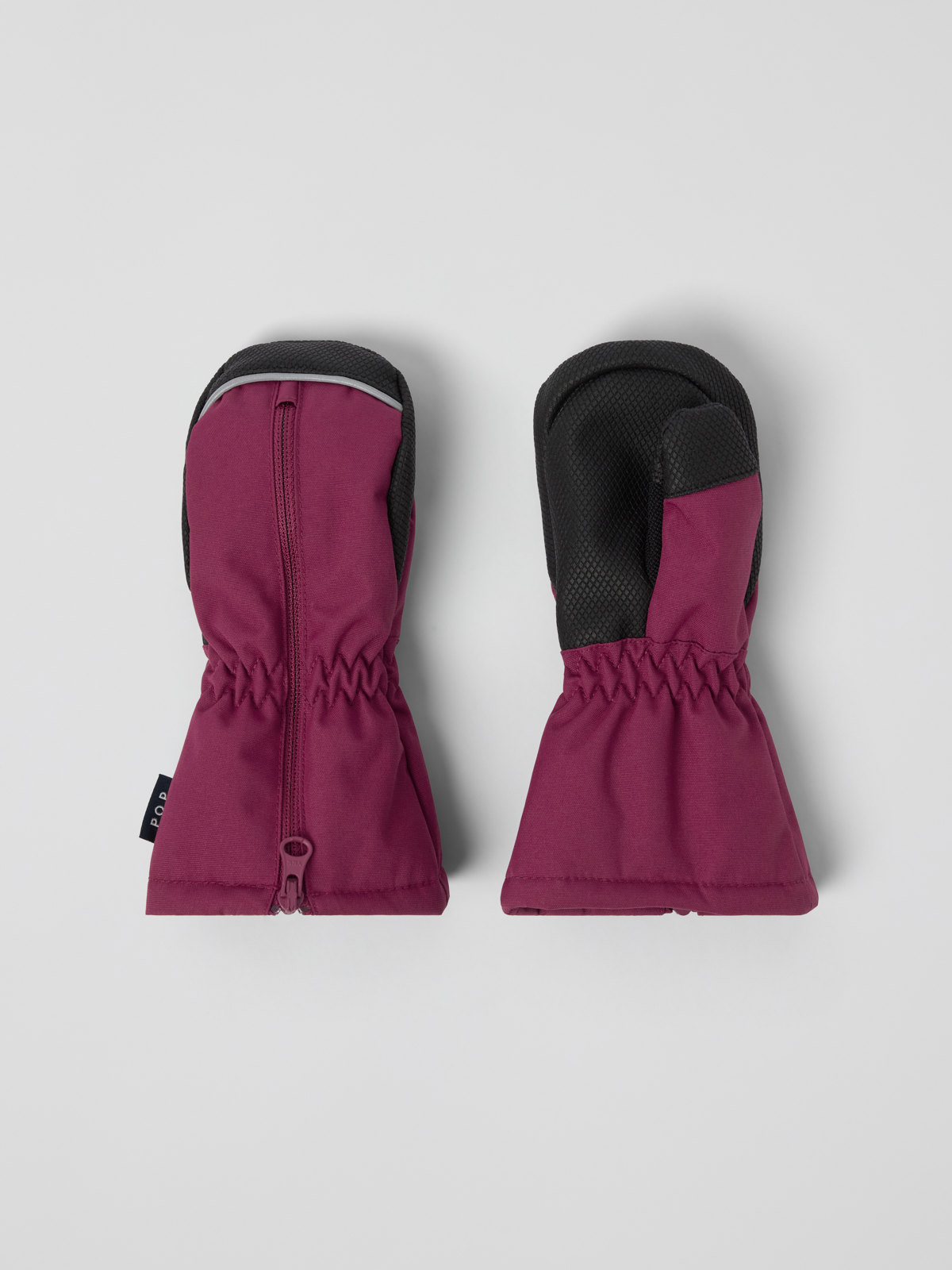 Solid colour mittens in wind- and waterproof fabric, with warm padding and zipper closure – super easy to put on and take off!