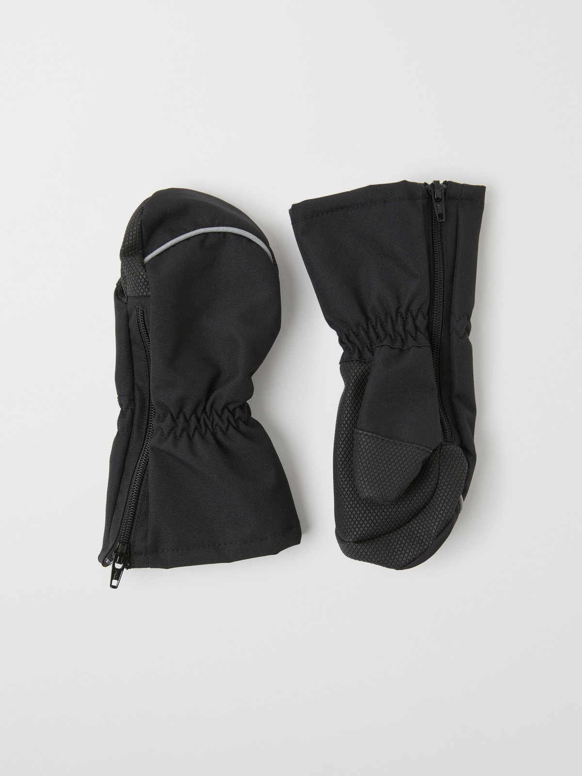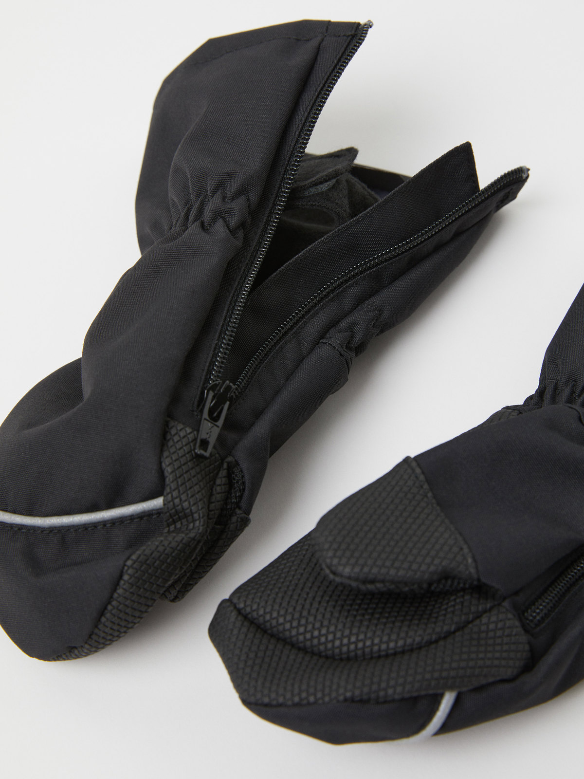 Windproof shell mittens with a side zipper to facilitate dressing. The mittens have an elastic band in soft fleece on the inside that can be fastened around the wrist with Velcro to help them stay in place. They also have a grip friendly surface on the palms, and reflectors on the upperside. The zipper is not waterproof.