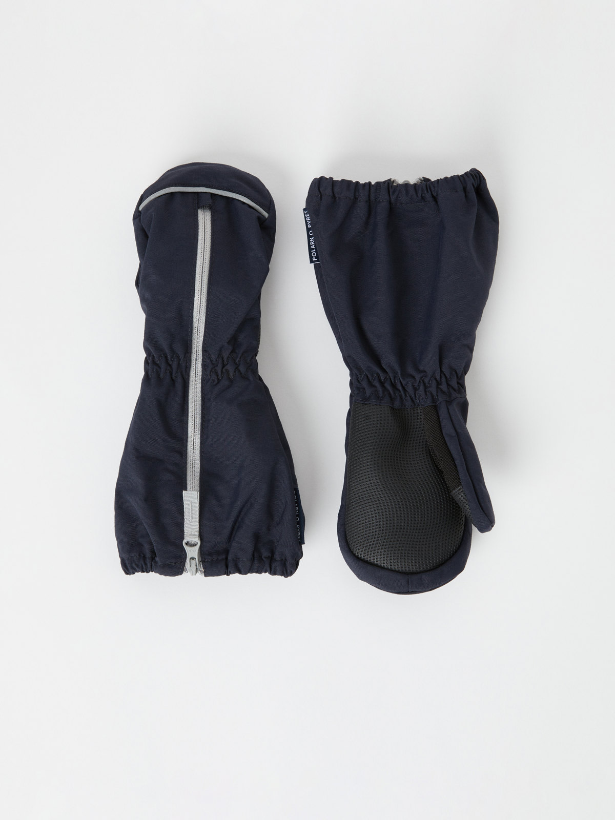 Windproof and waterproof mittens. The mittens have a comfy fleece lining and a long zipper on the upper side to facilitate usage. The mittens feature reflectors and a grip friendly surface on the palms.