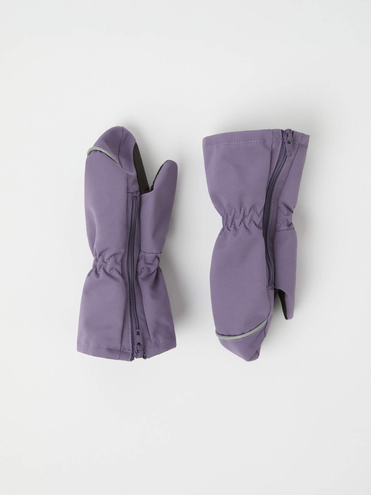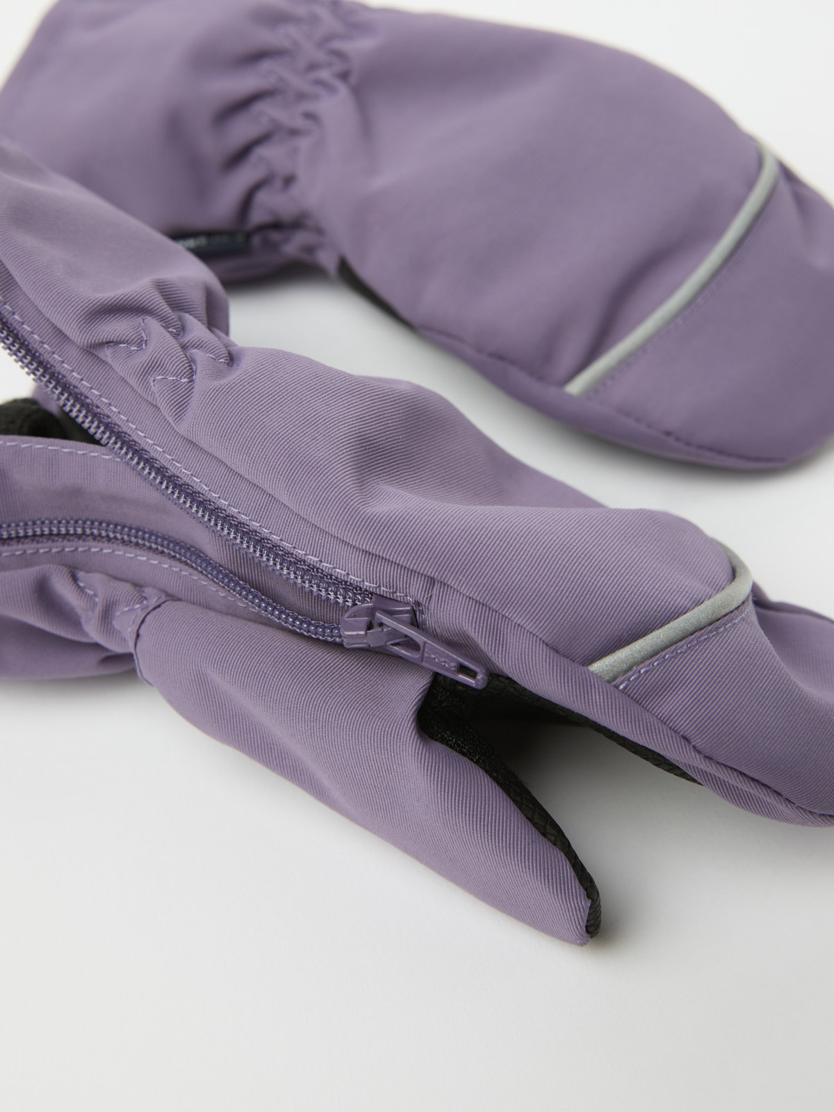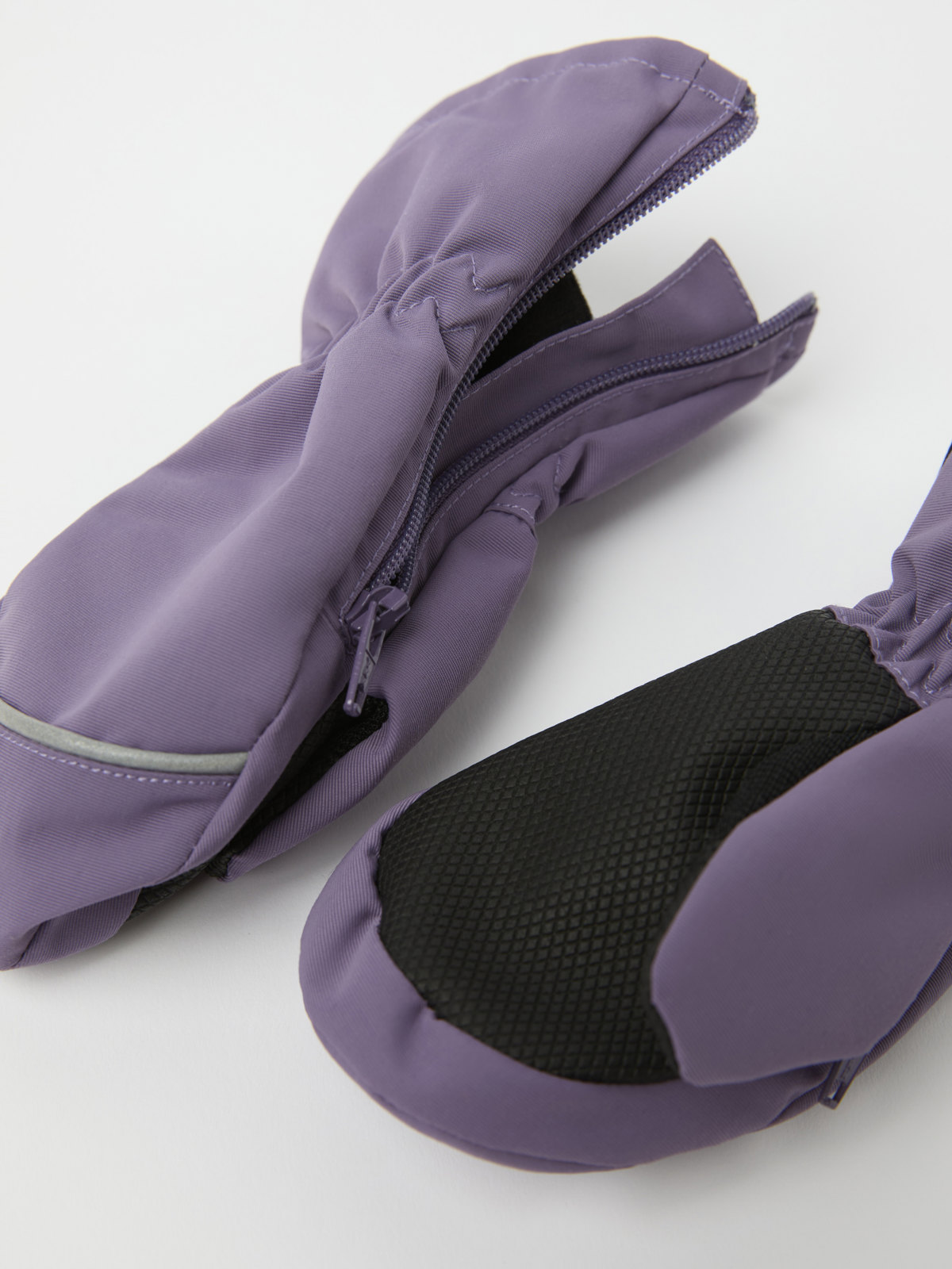 Windproof shell mittens with a side zipper to facilitate dressing.