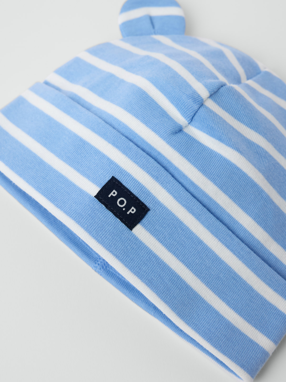 Our classic striped hat in 100% organic cotton jersey for your little one. This hat is adorned with ears and has a foldup brim that can be adjusted to fit baby’s head.