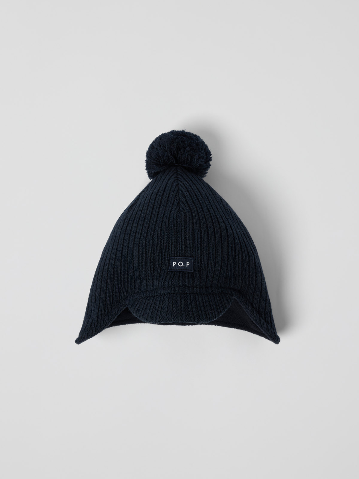 Ribbed hat made from warm wool with a soft fleece lining in recycled polyester. The hat extends well over the ears and features a small brim at the front for extra protection against wind and weather. A decorative pompom sits on top.