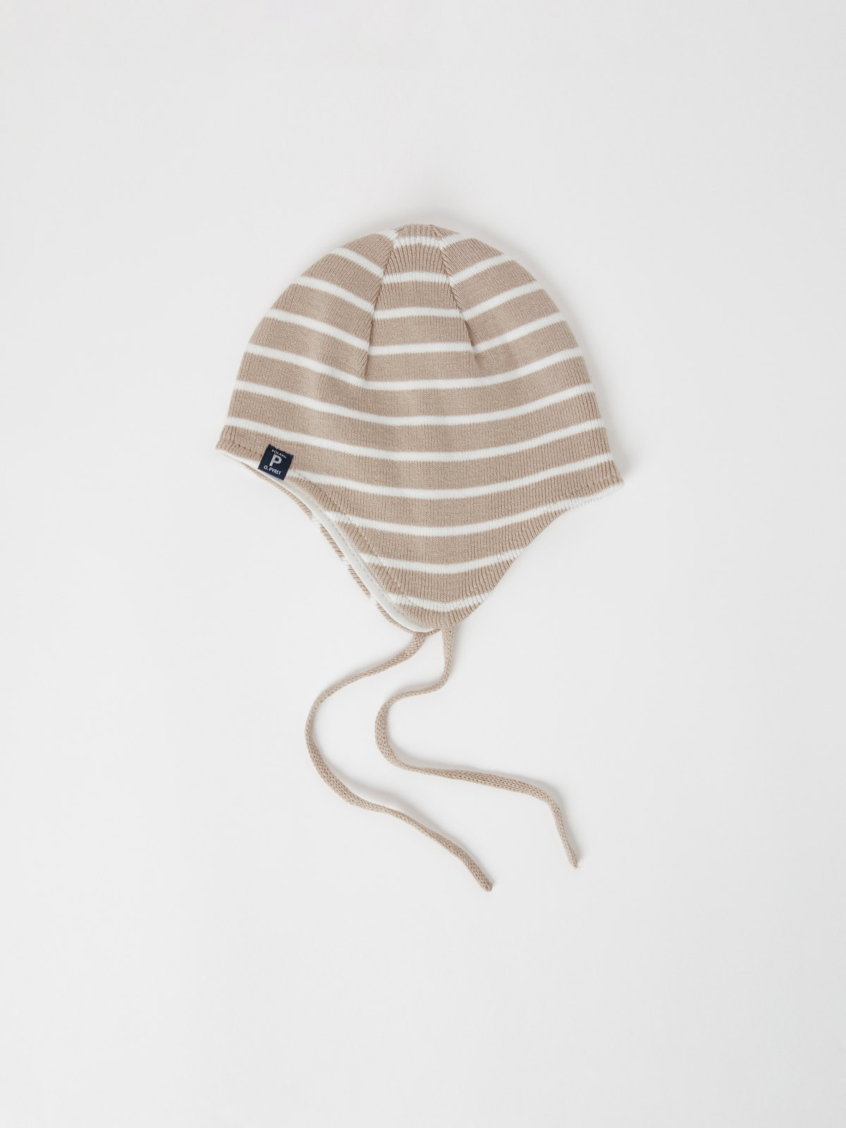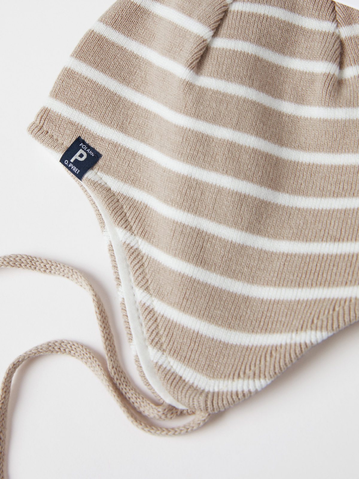 Striped helmet hat in 100% organic cotton The windproof hat has a soft and comfy jersey lining, and goes down over the ears. The tie strings under the chin help to keep the hat in place.