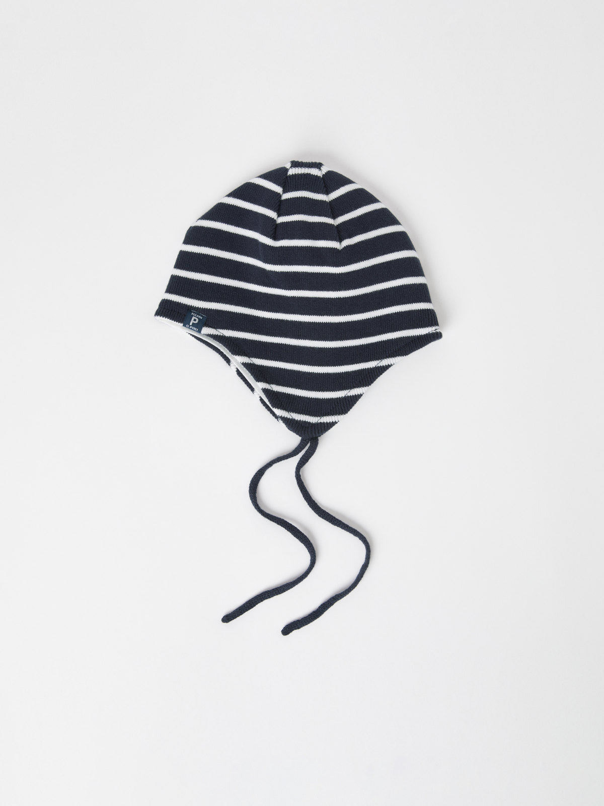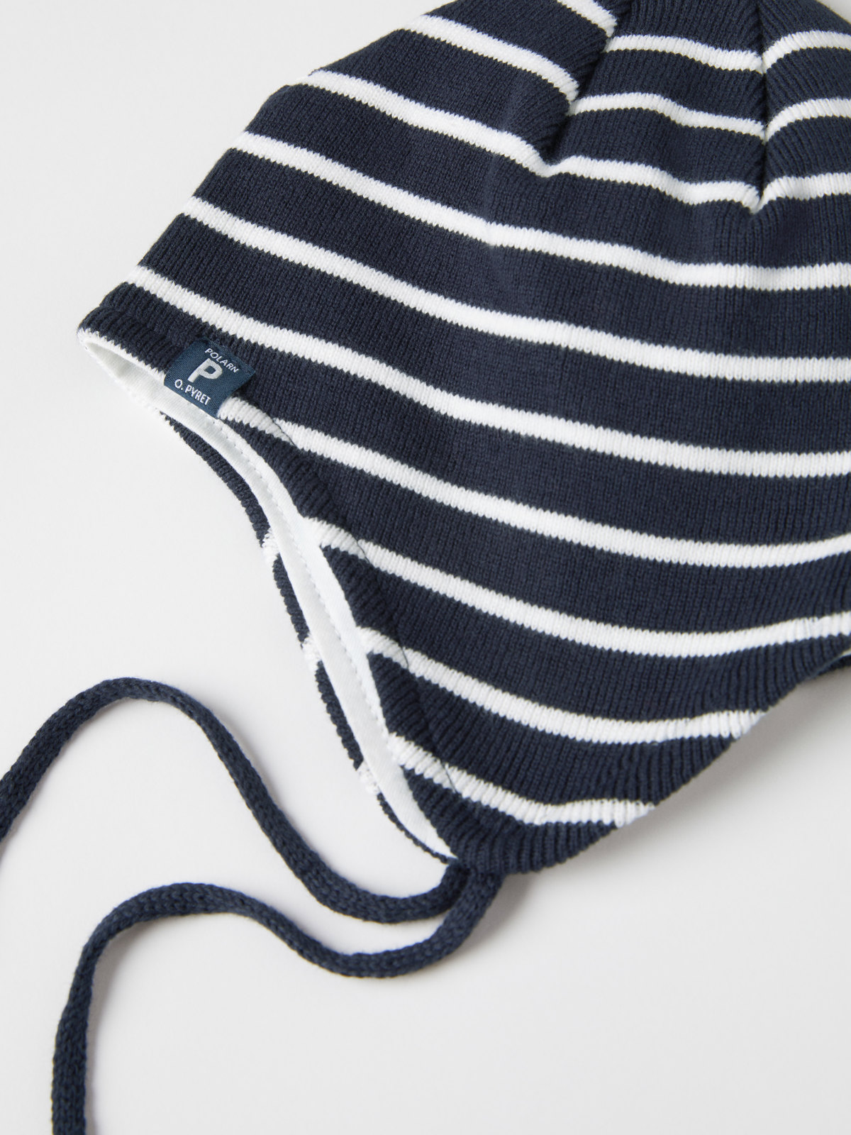 Striped helmet hat in 100% organic cotton The windproof hat has a soft and comfy jersey lining, and goes down over the ears. The tie strings under the chin help to keep the hat in place.