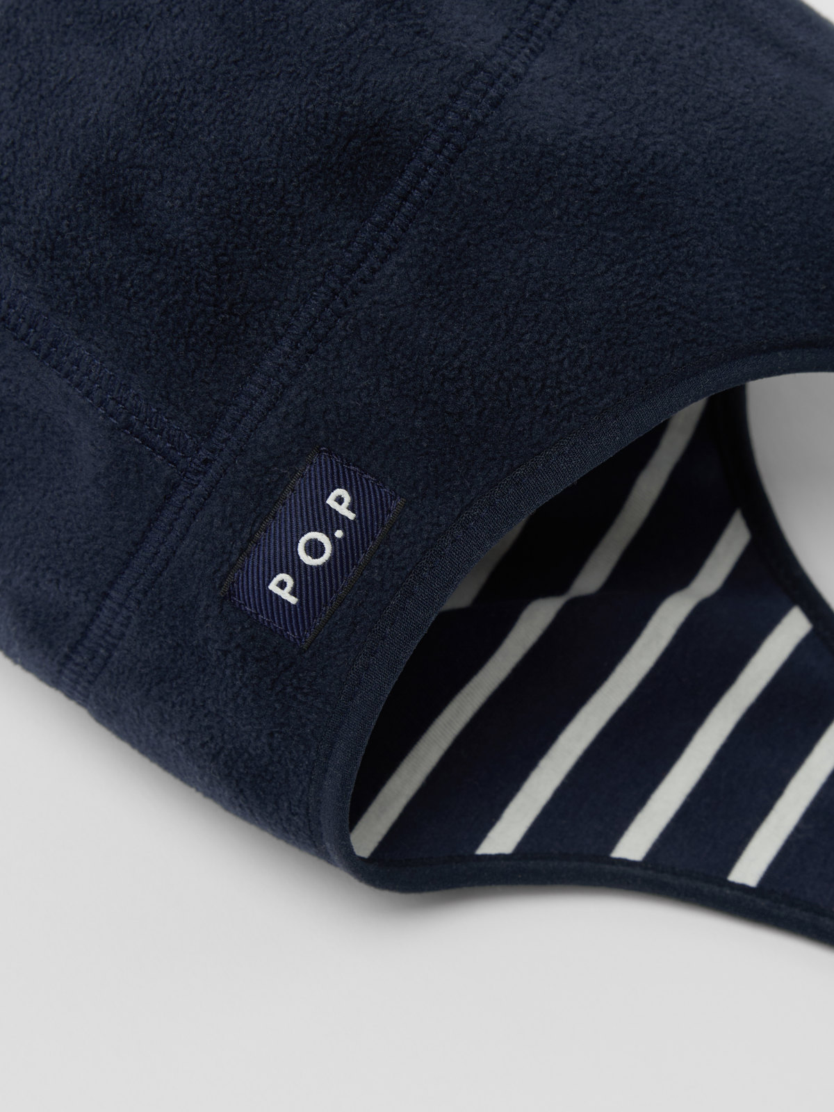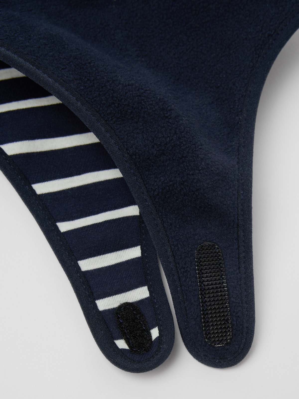 Windproof and water-repellent helmet hat in soft fleece for your little one. The hat is made from recycled polyester and lined with soft organic cotton tricot in our classic stripes. The hat fastens with a Velcro strap under the chin.