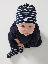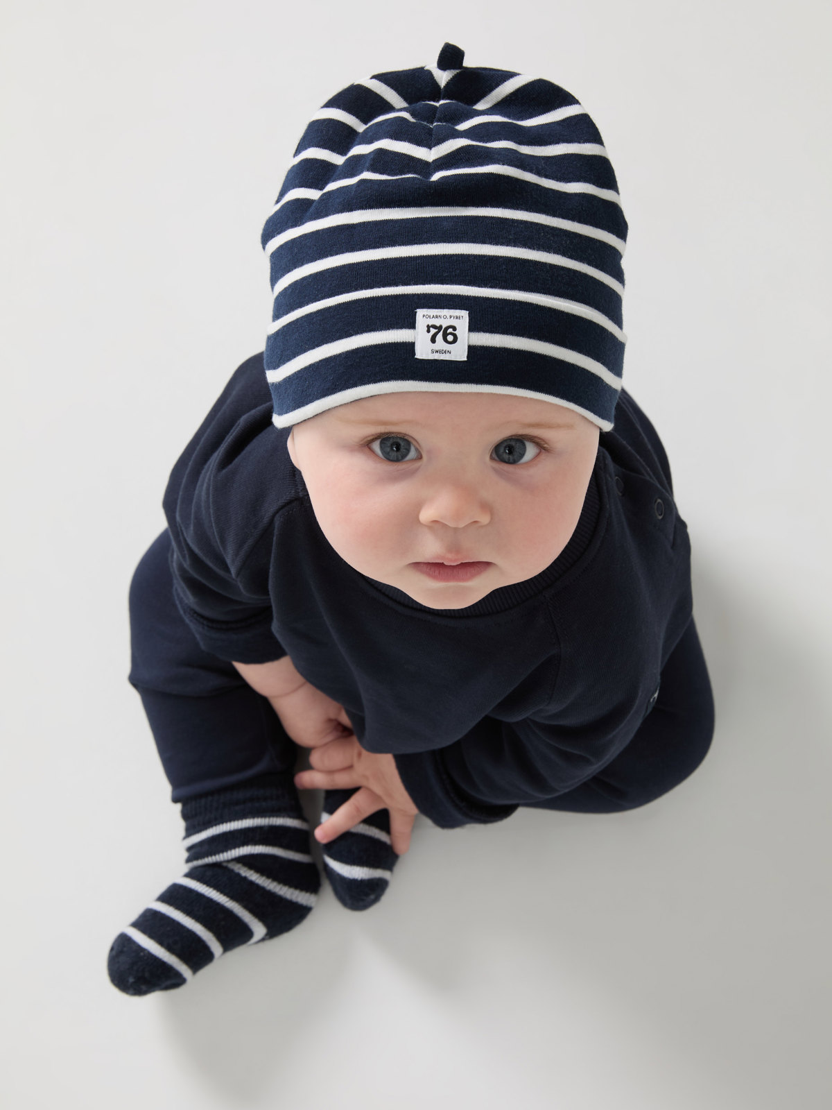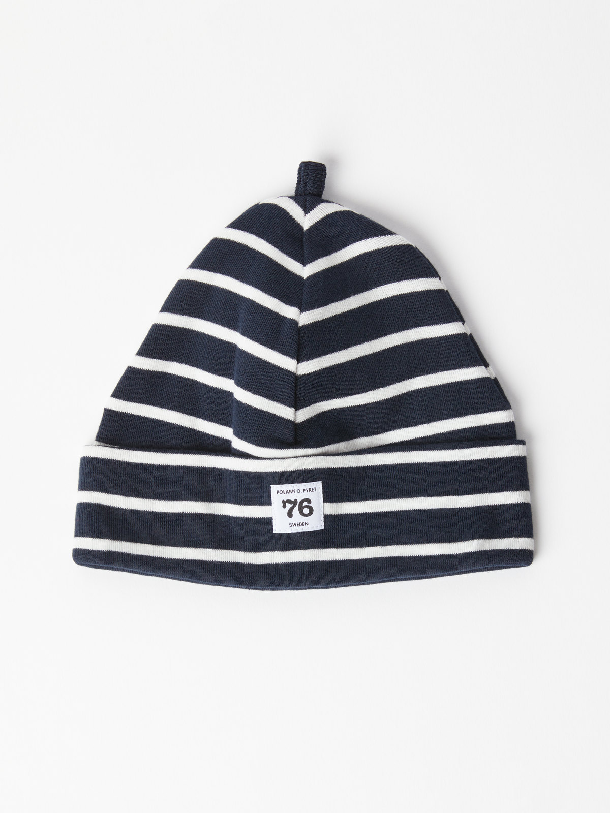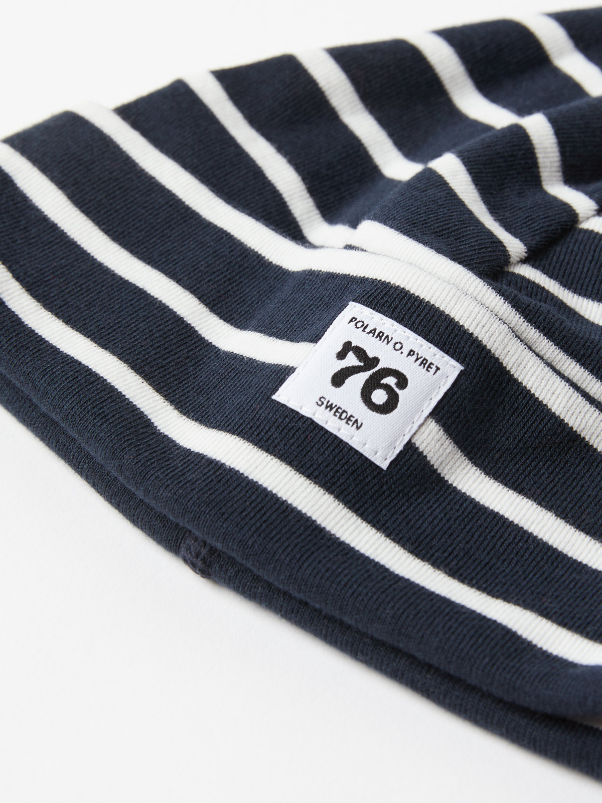 Striped hat for in 100% organic cotton jersey. The beanie has extra soft seams that are gentle on sensitive skin, and a foldup brim that can be adjusted to fit the baby's head.