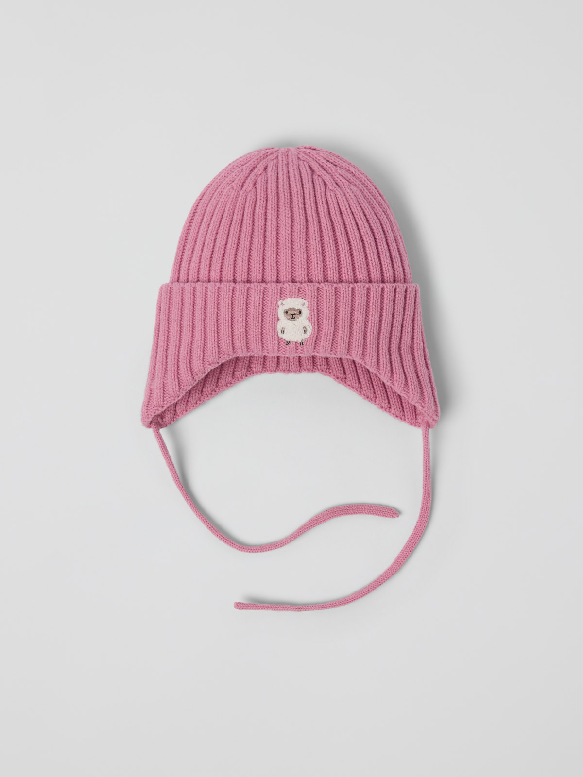 Ribbed knit hat in a soft and warm wool–cotton blend. The hat features a folded edge with a small, cute appliqué at the centre front. It extends slightly over the ears for extra warmth and a comfortable fit. Tie strings help keep it securely in place.