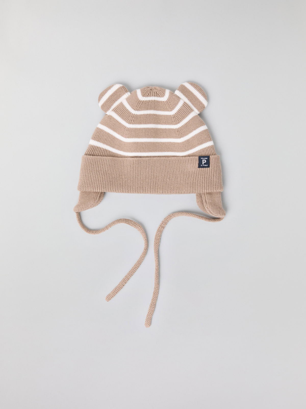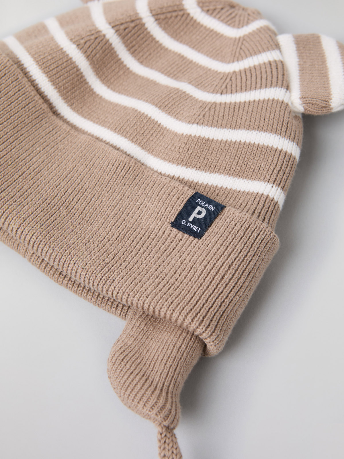 The hat features our classic stripes and integral ears. It also has a ribbed brim and earflaps to keep little ears warm.