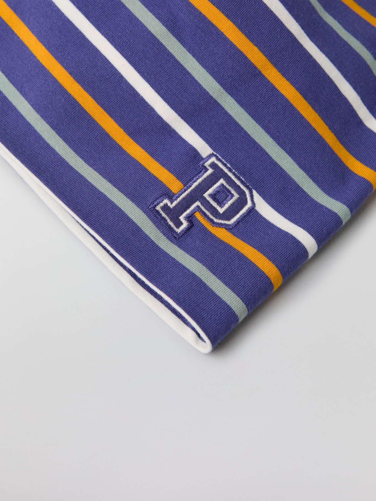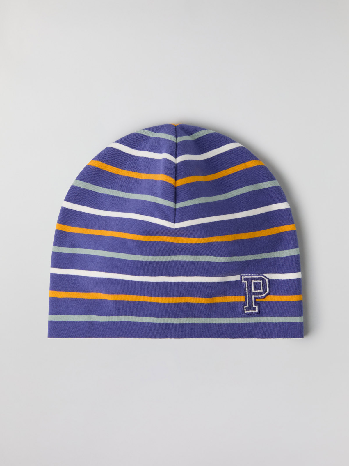 Striped jersey beanie with "P" appliqué