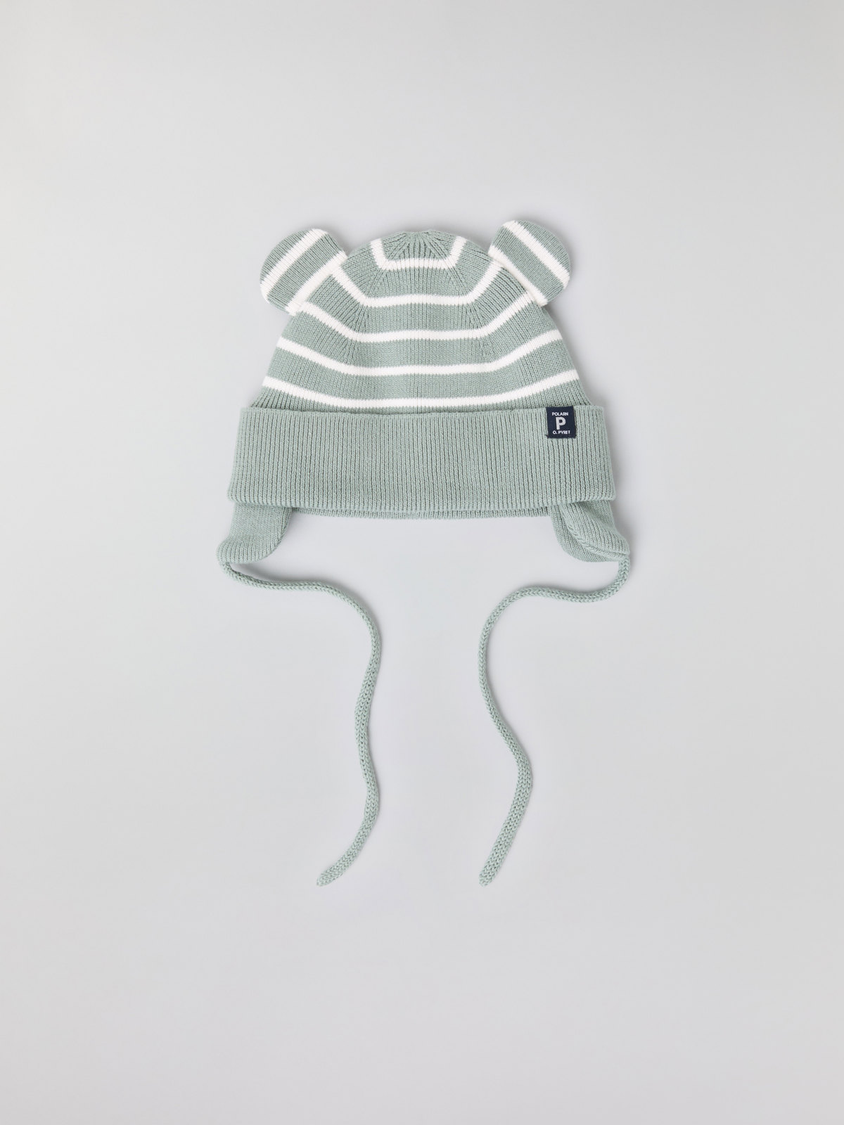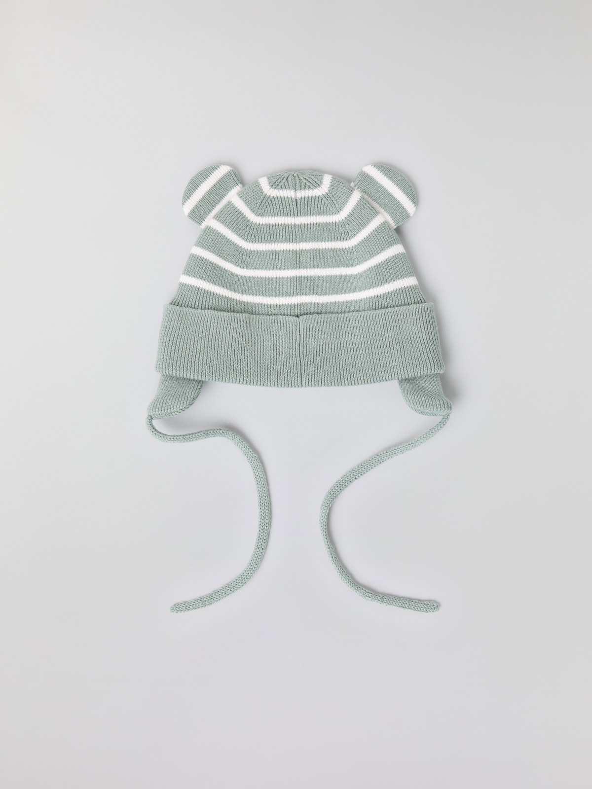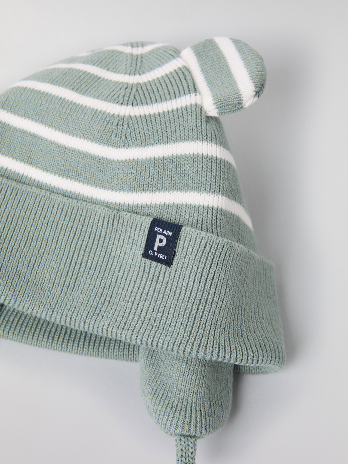 The hat features our classic stripes and integral ears. It also has a ribbed brim and earflaps to keep little ears warm.