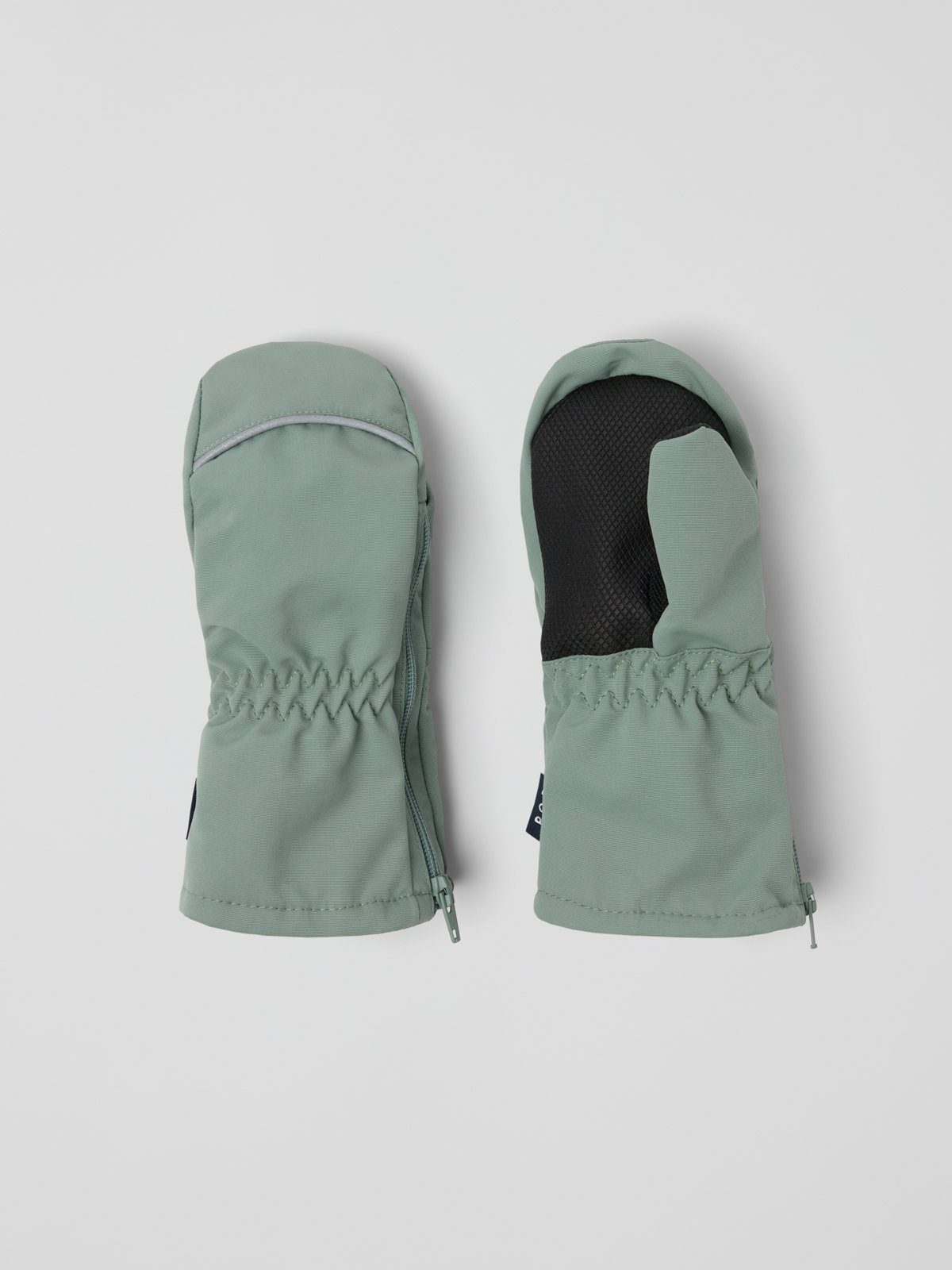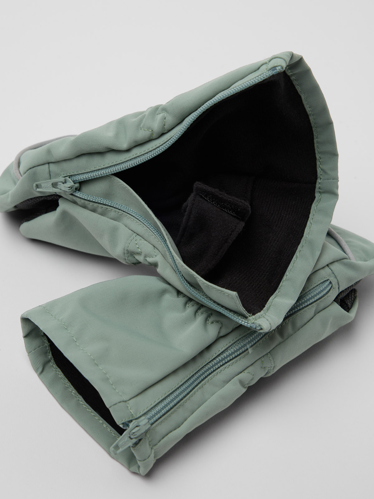 The mittens have an elastic band in soft fleece on the inside that can be fastened around the wrist with Velcro to help them stay in place.