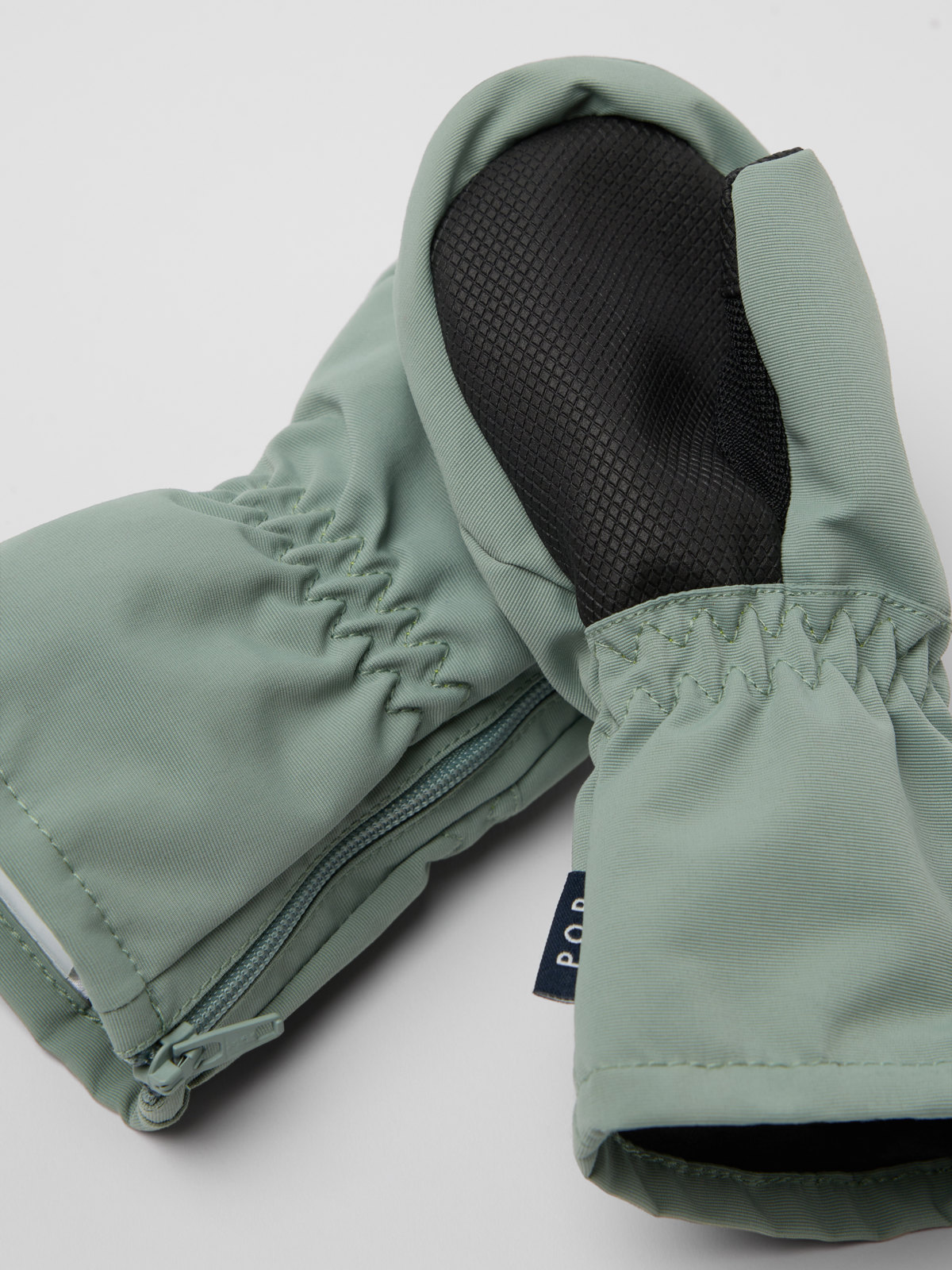 Windproof shell mittens with a side zipper to facilitate dressing.
