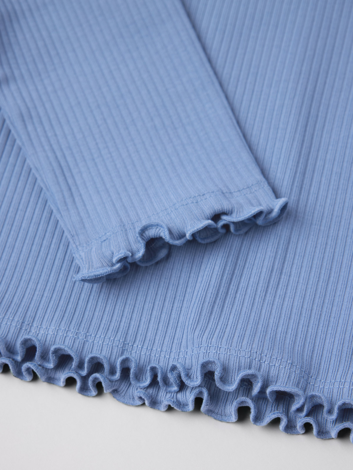 Solid colour, ribbed top in soft organic cotton – perfect for all occasions! The top features a lettuce trim at the wrists and hem.