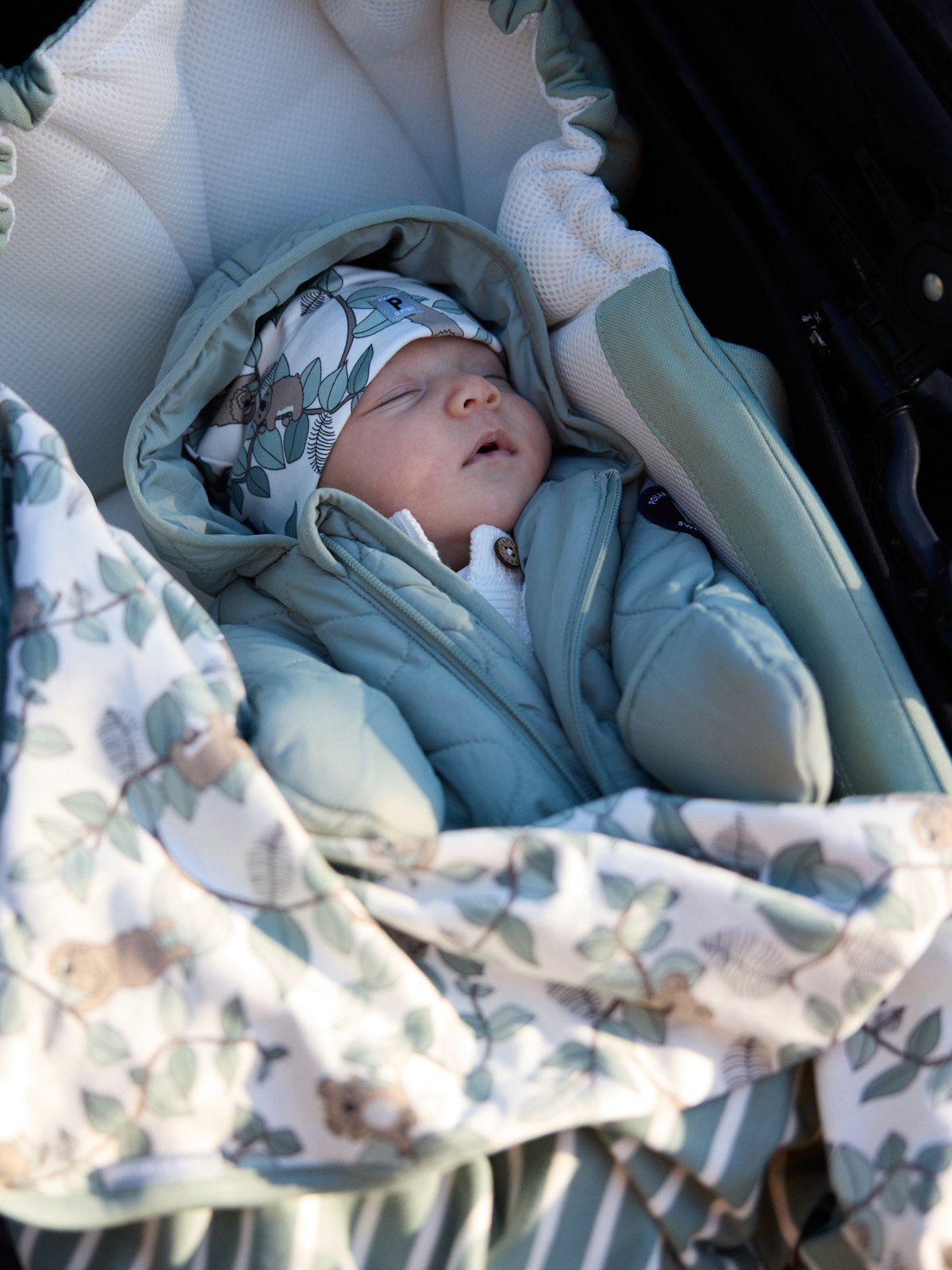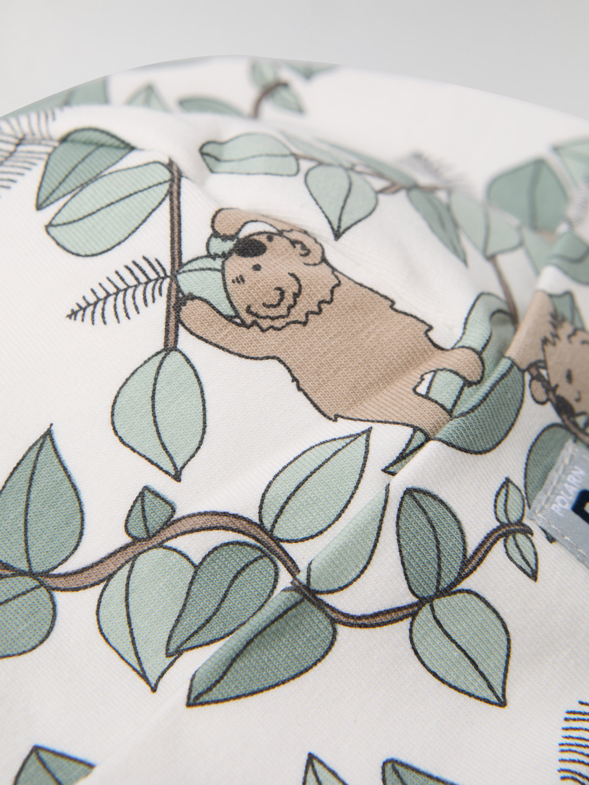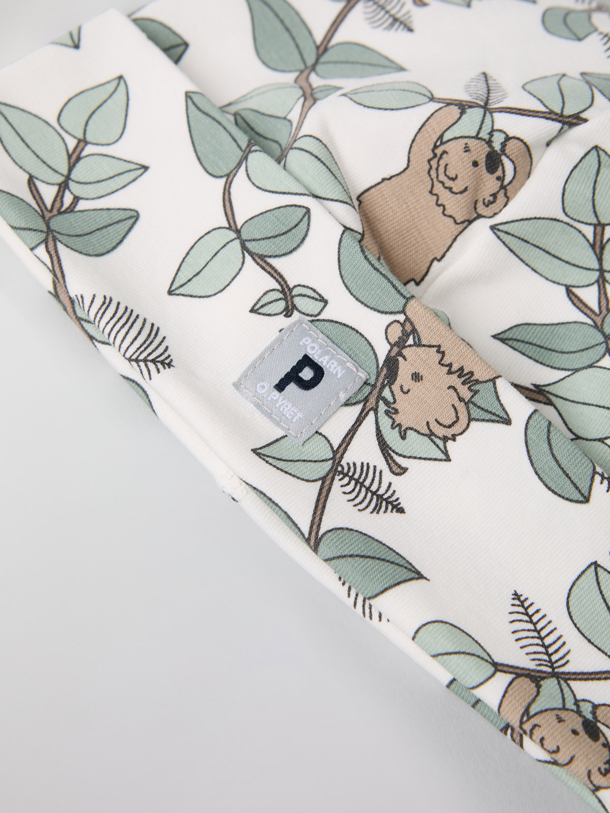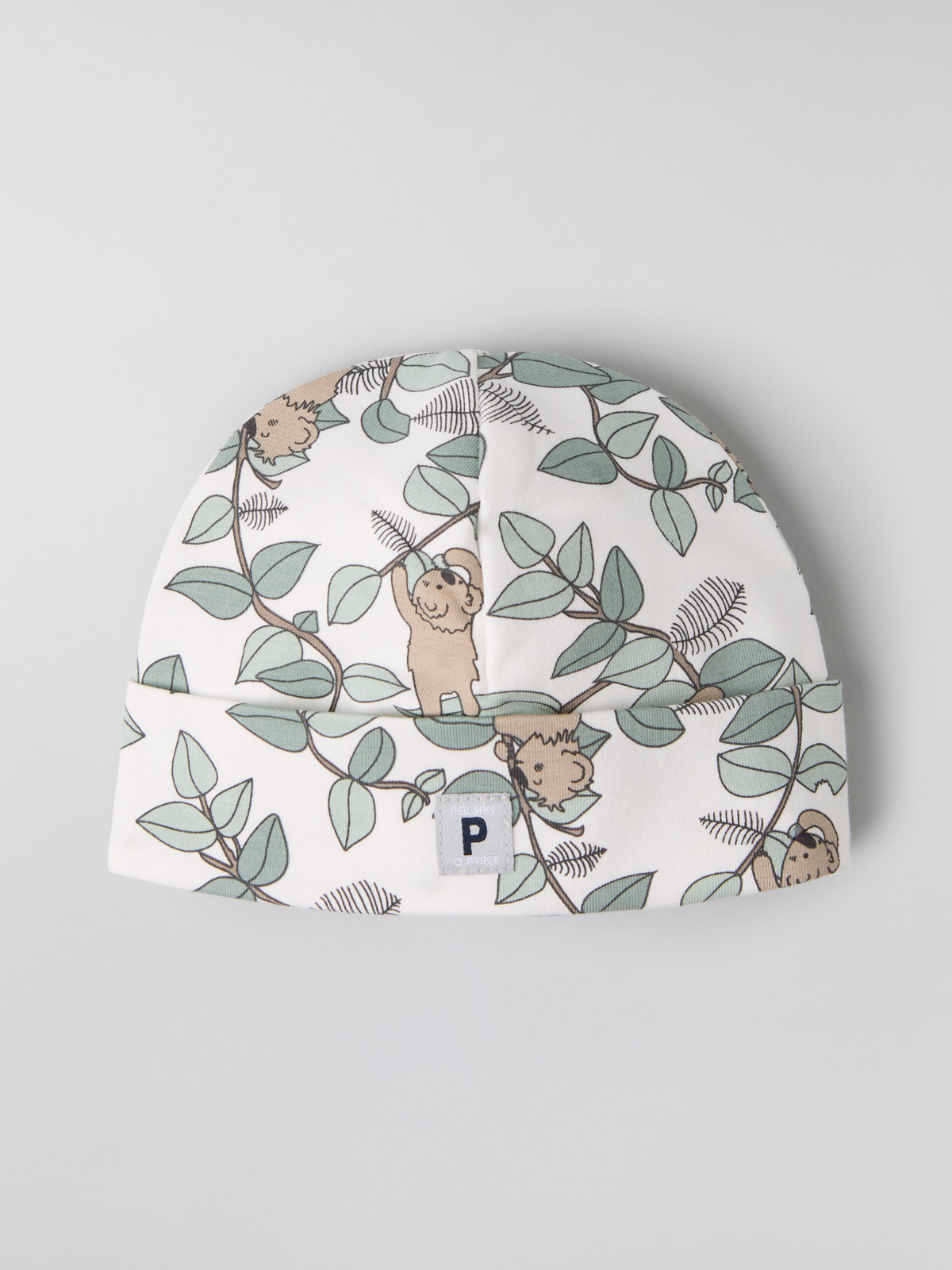 Super-soft beanie for baby in 100% organic cotton jersey with an allover eucalyptus print.
