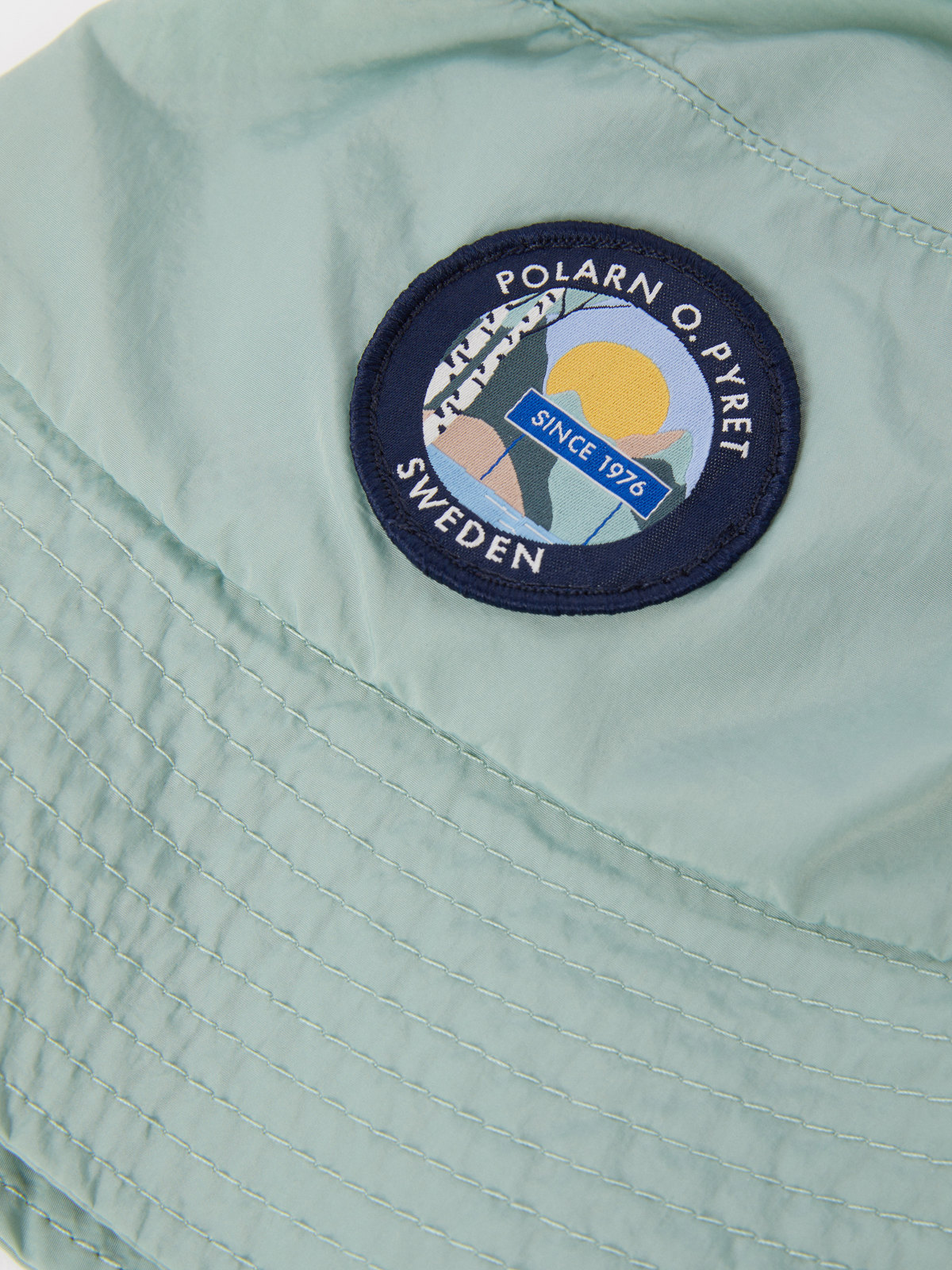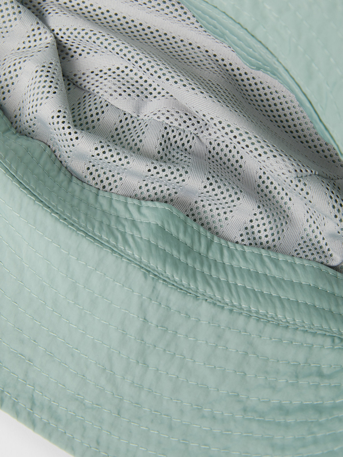 The hat is made from recycled nylon, and has embroidered ventilation holes and an appliqué on the front.