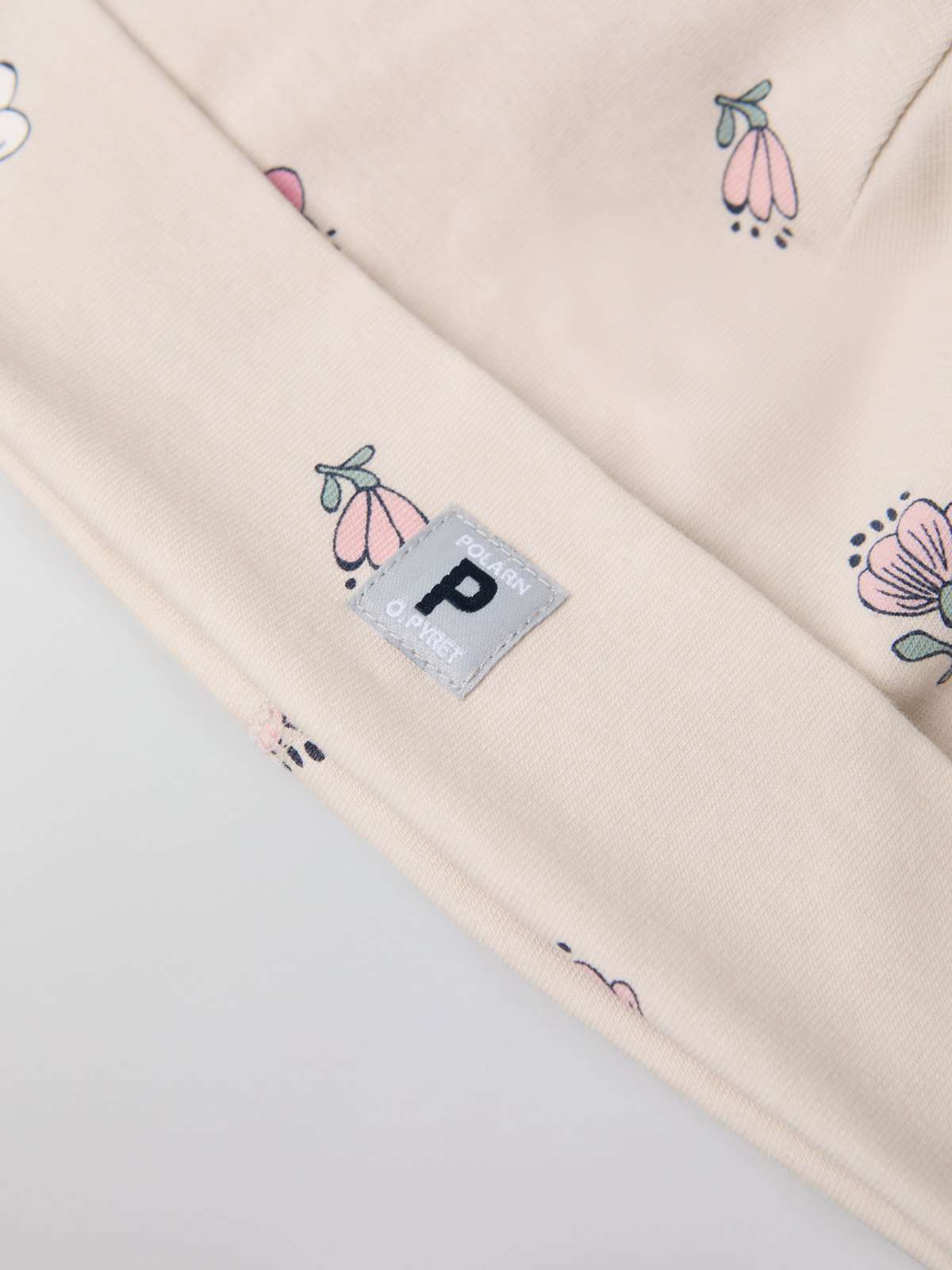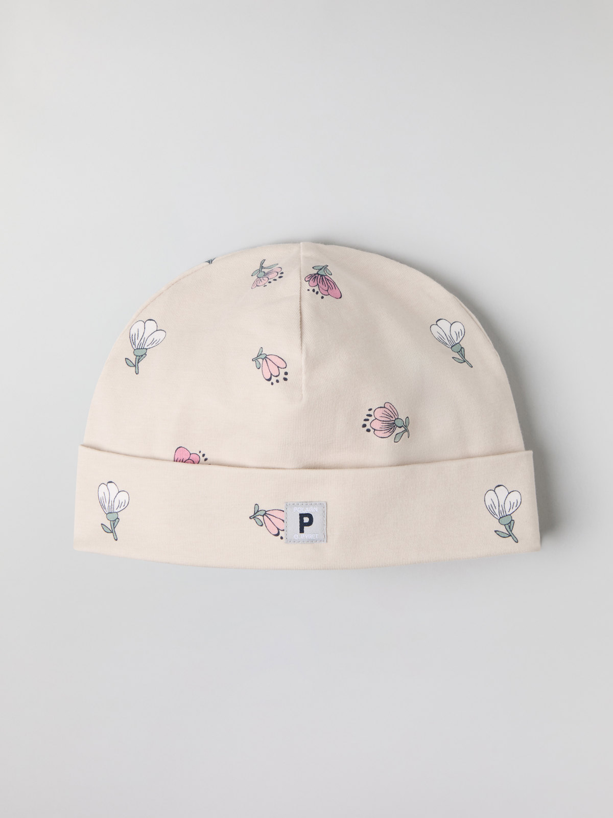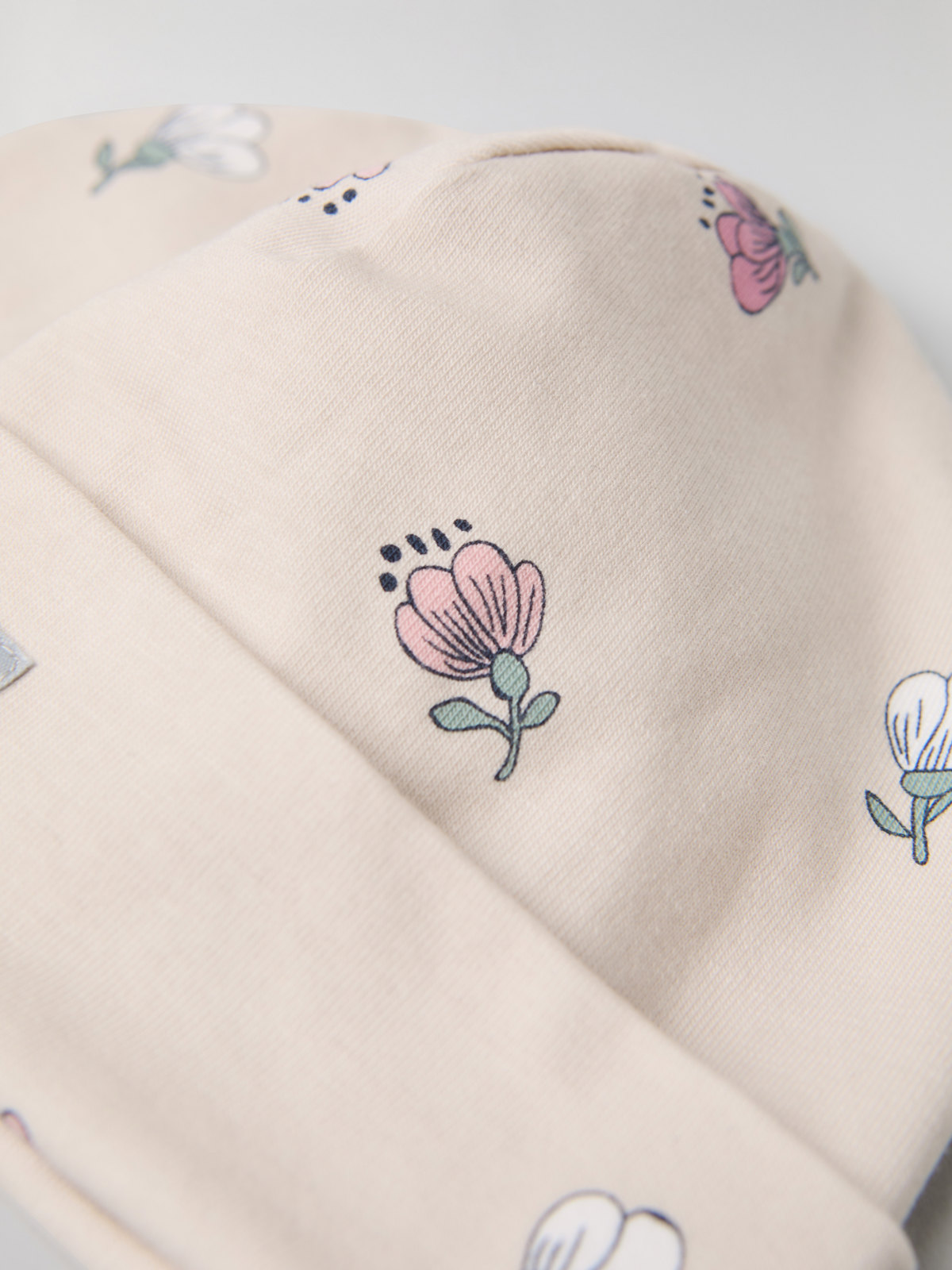 A super-soft beanie for baby in 100% organic cotton jersey with an allover small floral print.