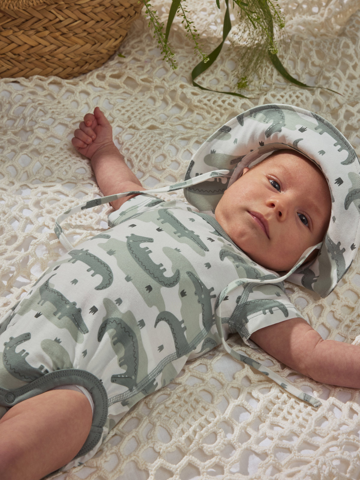 Sun hat in 100% organic cotton – a must-have for little ones in the sun! The sun hat features an allover crocodile print and soft tie straps to keep it in place.
