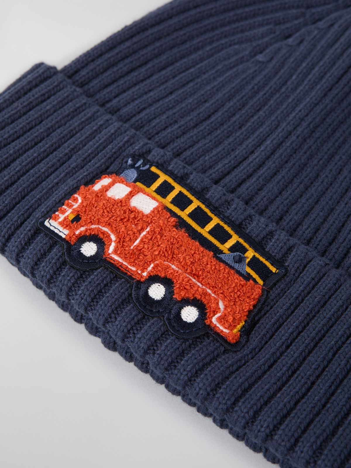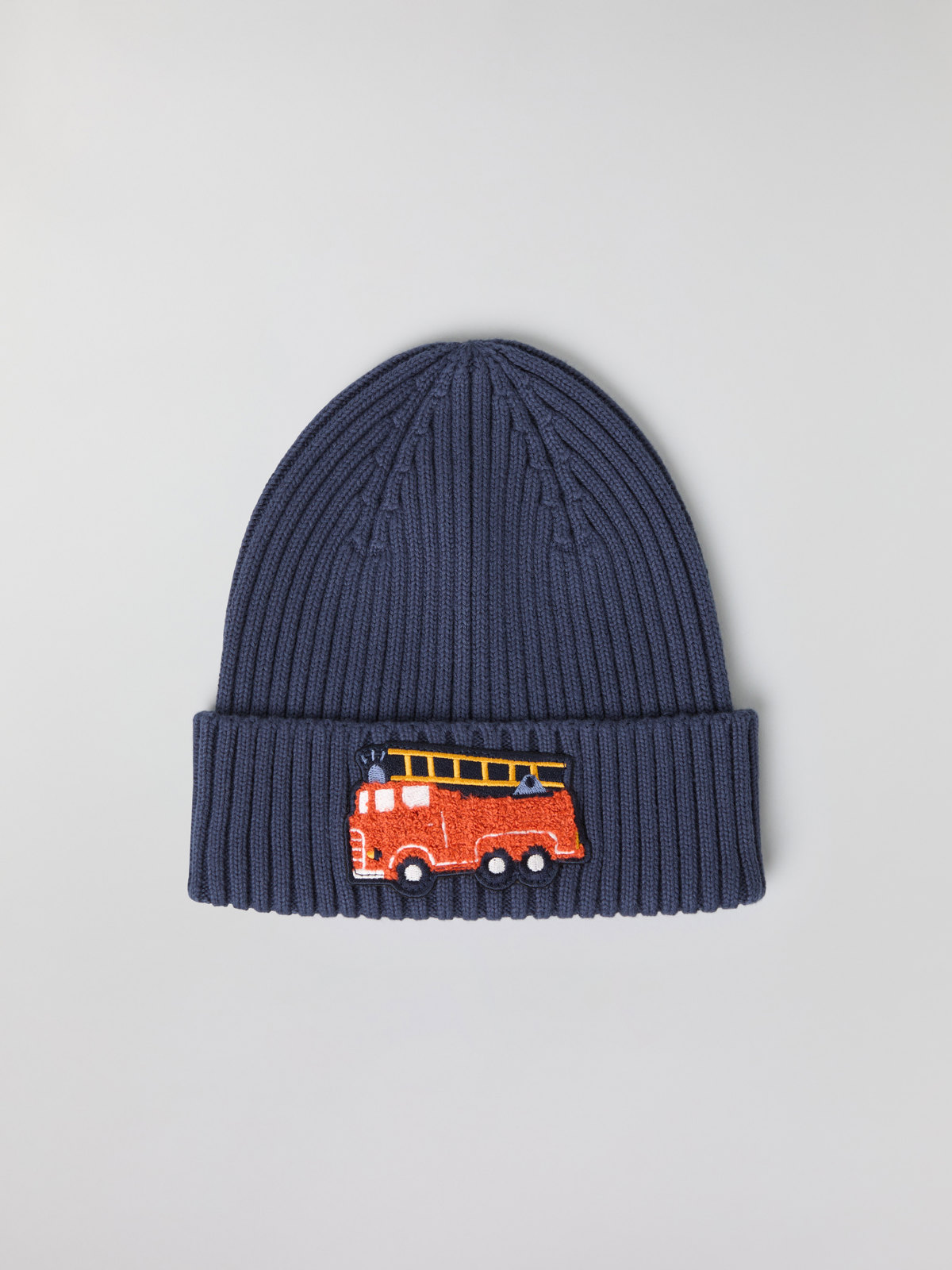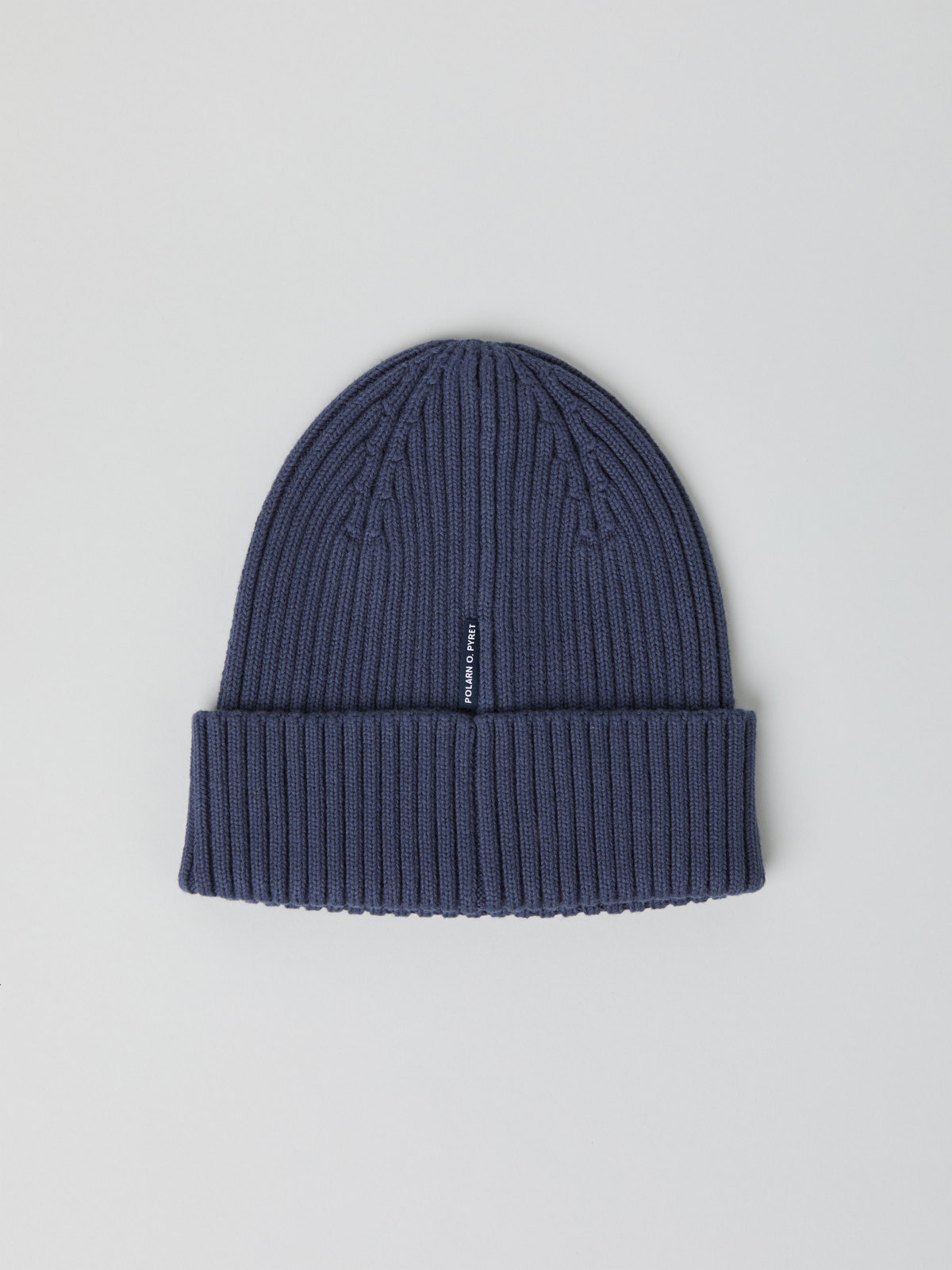 Ribbed beanie in organic cotton – perfect for chilly spring and fall days. The beanie has a turn-up with an embroidered appliqué at the front.