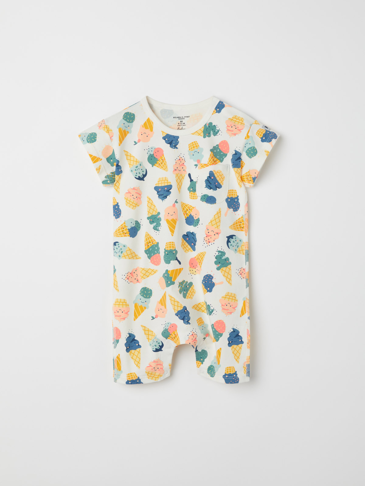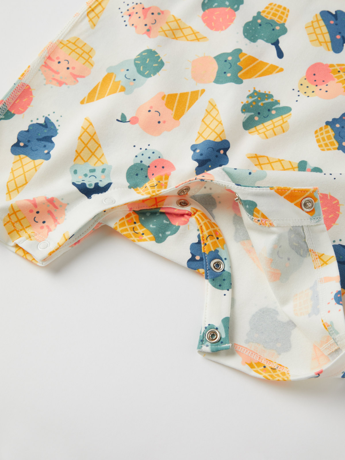 The playsuit features an allover ice-cream print and extra-soft, flatlock seams that are gentle on sensitive skin.