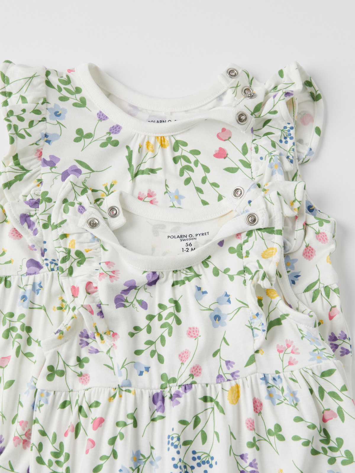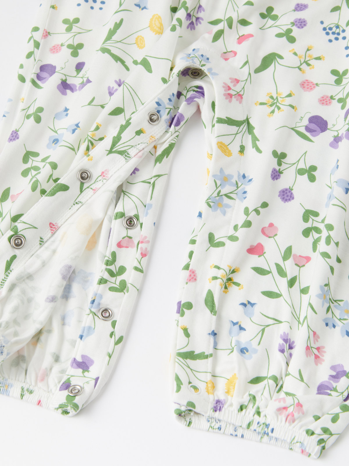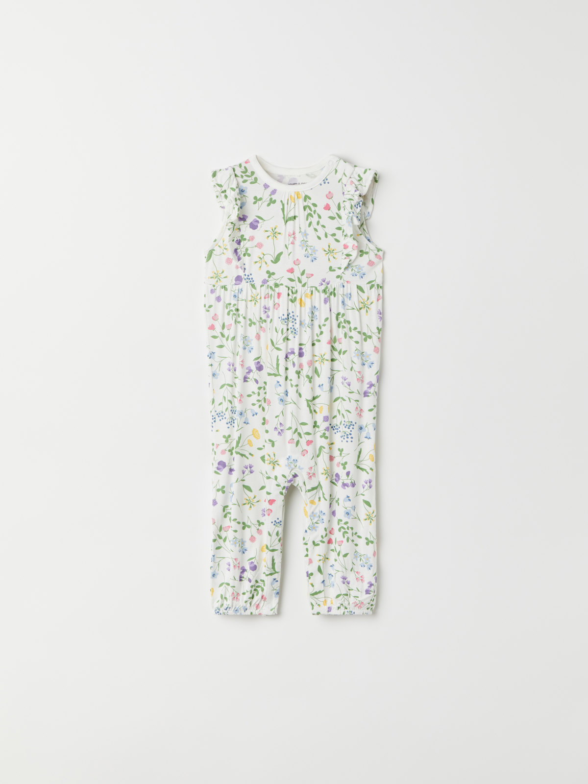 The playsuit features an allover floral print and ruffles at the front that continue over the shoulders to the back.