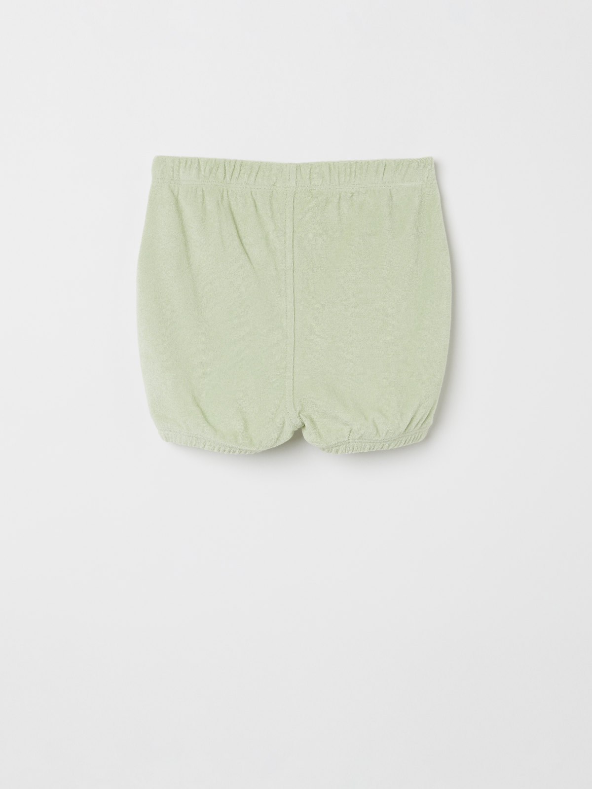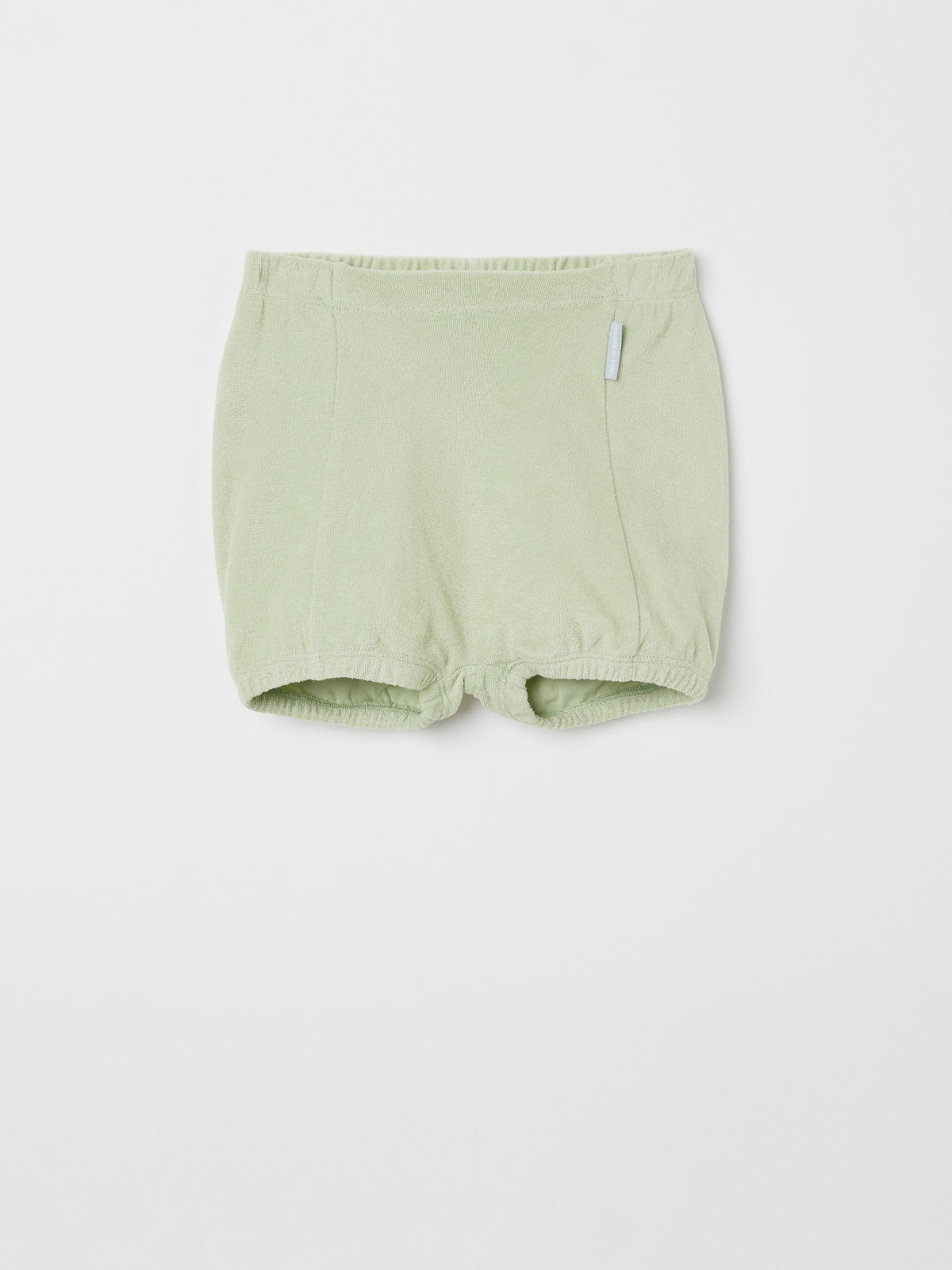 Solid color shorts in soft and comfy 100% organic terry cotton for baby. The garment has a soft, elastic waist and ankle cuffs.