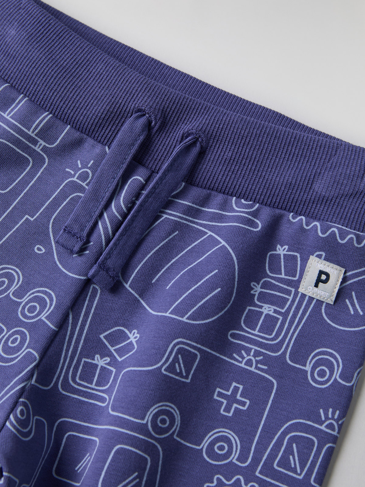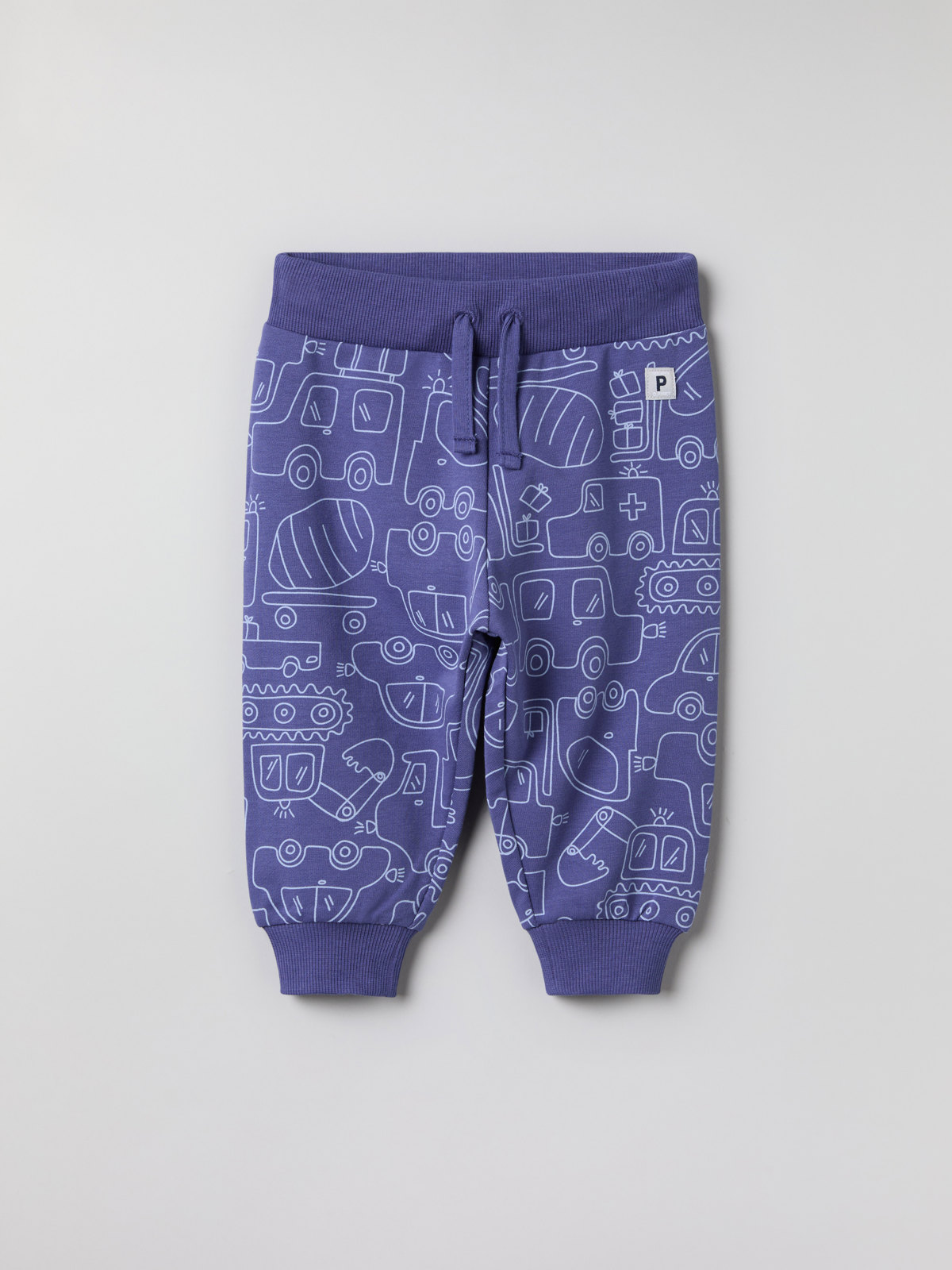 The pants feature an allover car print, and a ribbed waist and ankle cuffs. The waist can also be adjusted with drawstring.