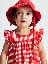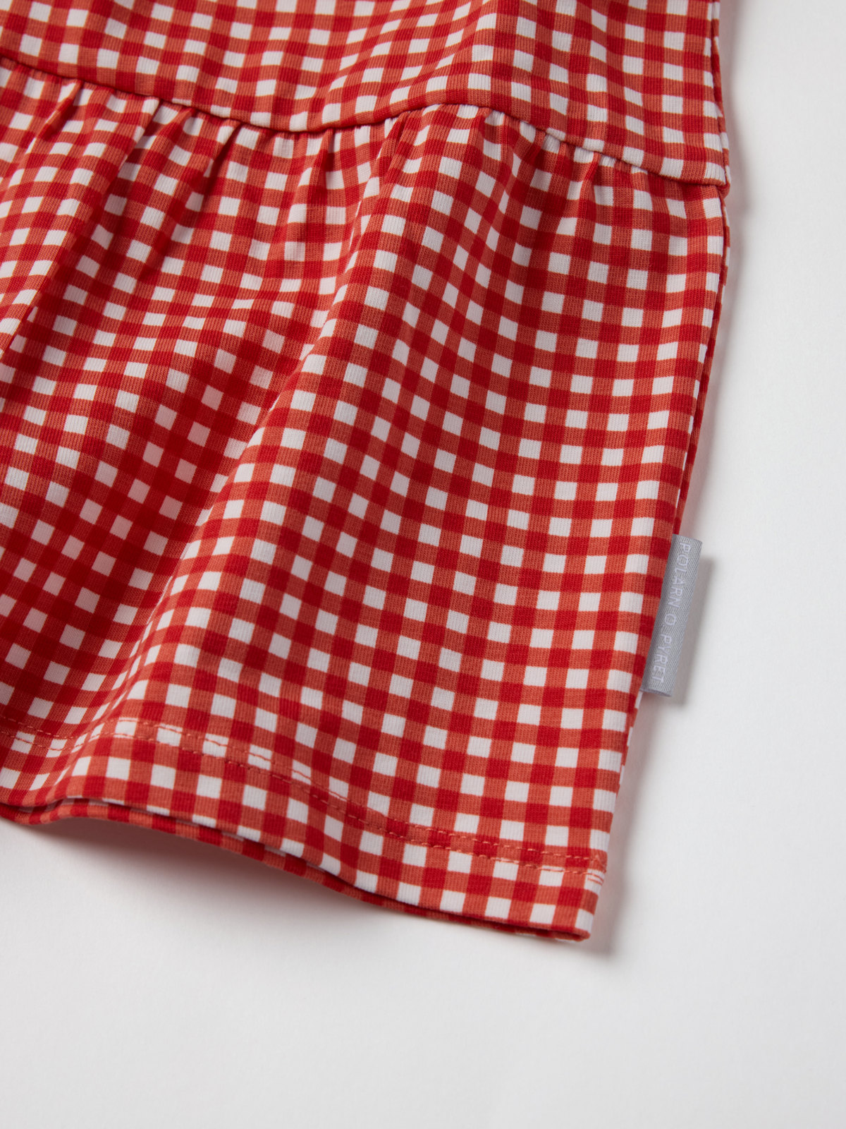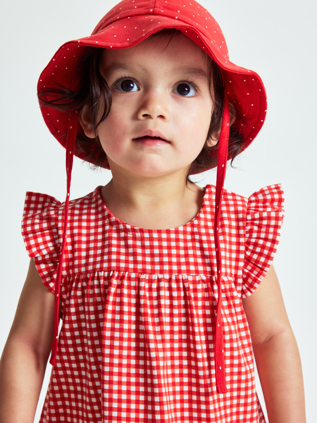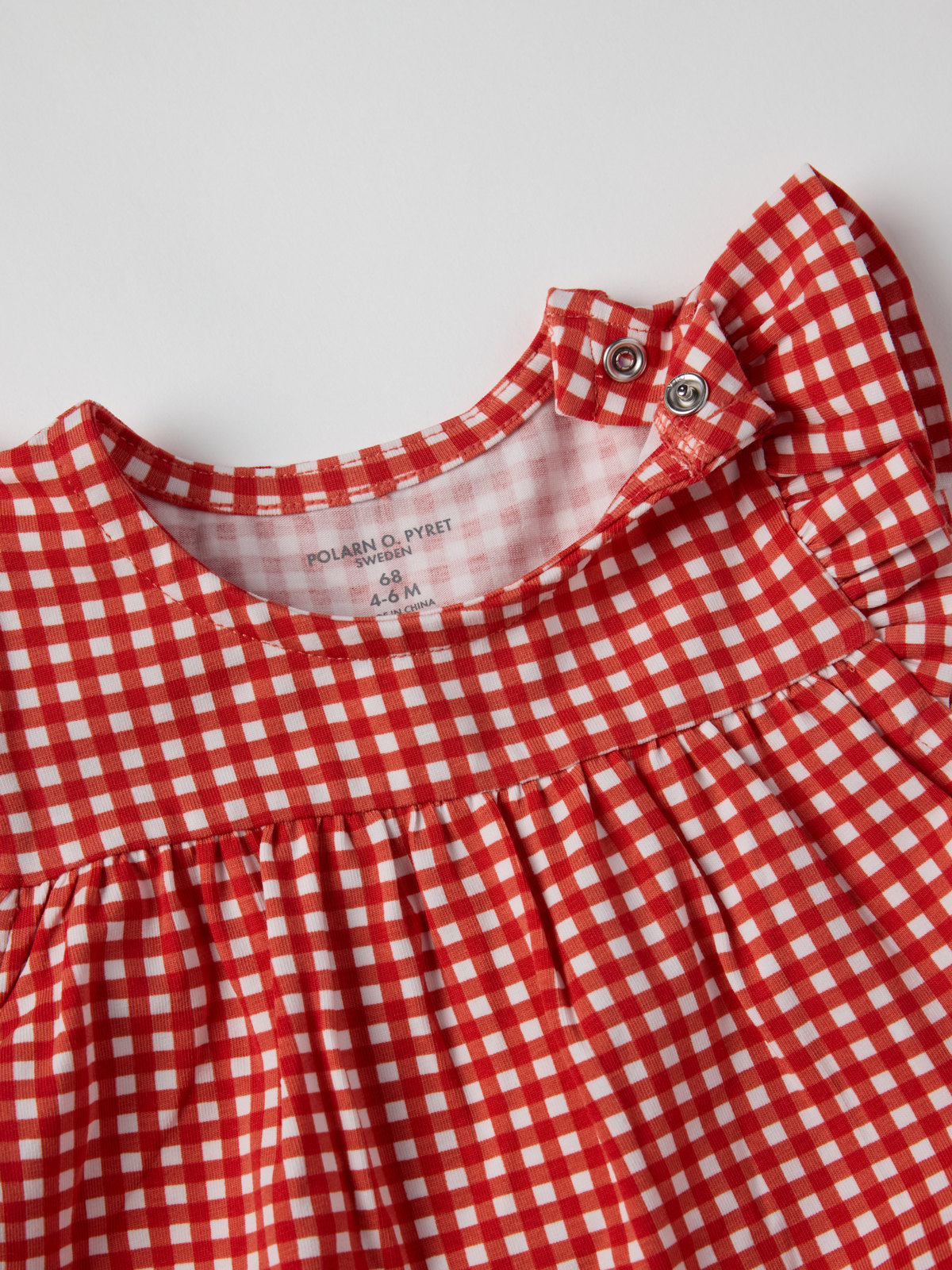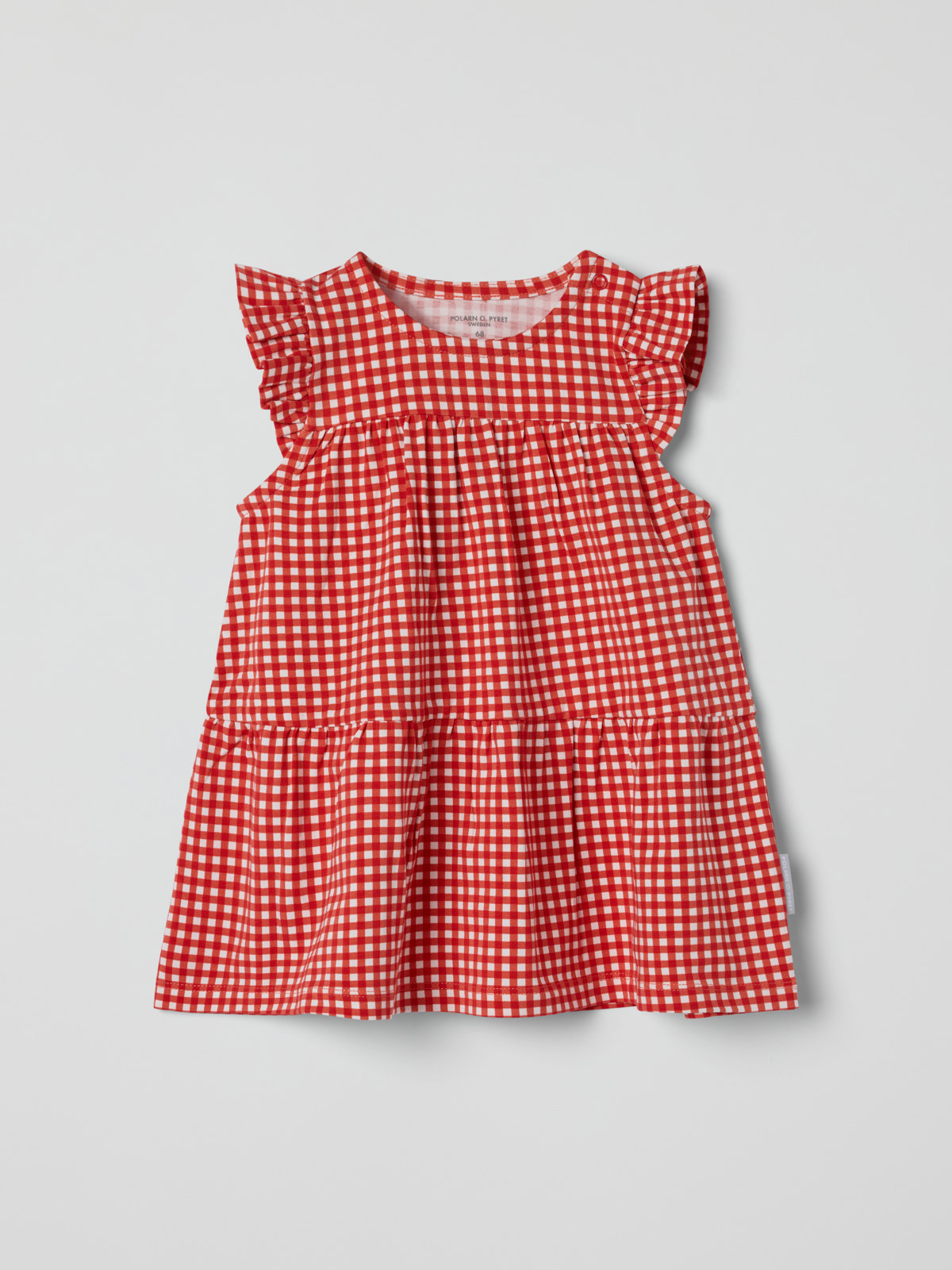 Checked sleeveless dress in soft organic cotton jersey – a lovely, comfy summer favorite! The dress has small ruffles over the shoulders, a loose fit, and a button closure on one shoulder.