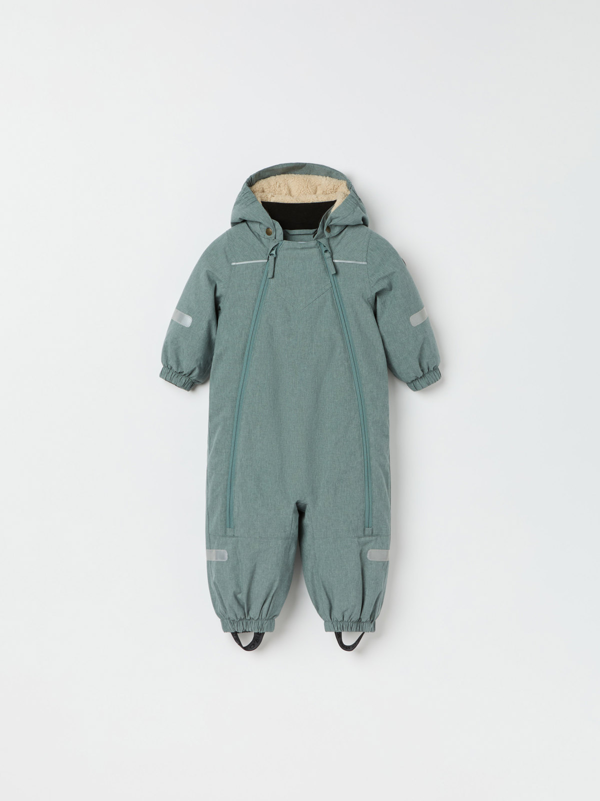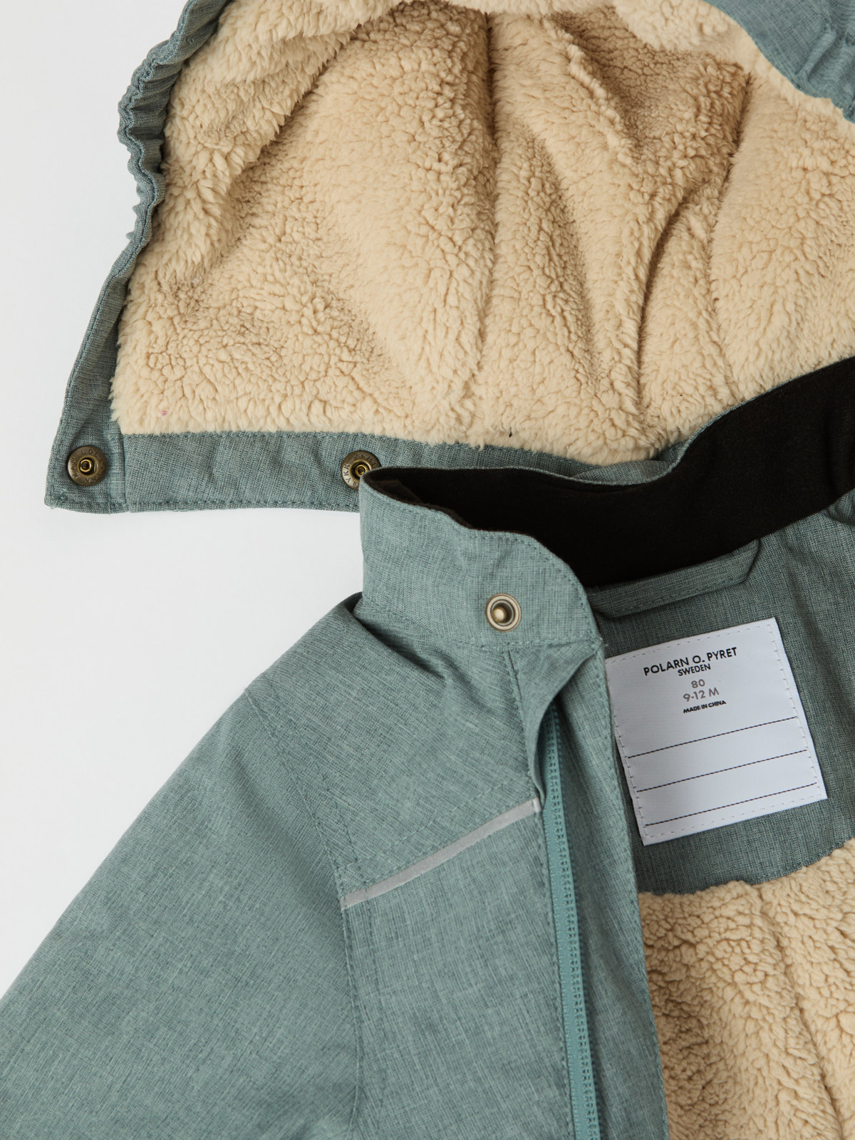 • The adjustable hood is detachable by means of snaps for increased safety; it also has soft pile lining
