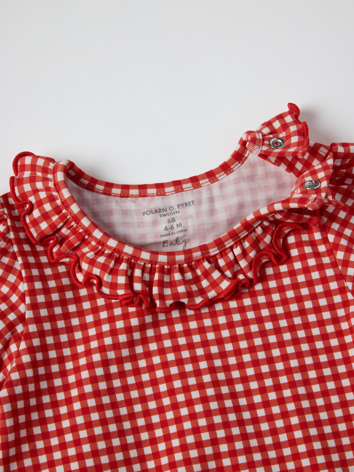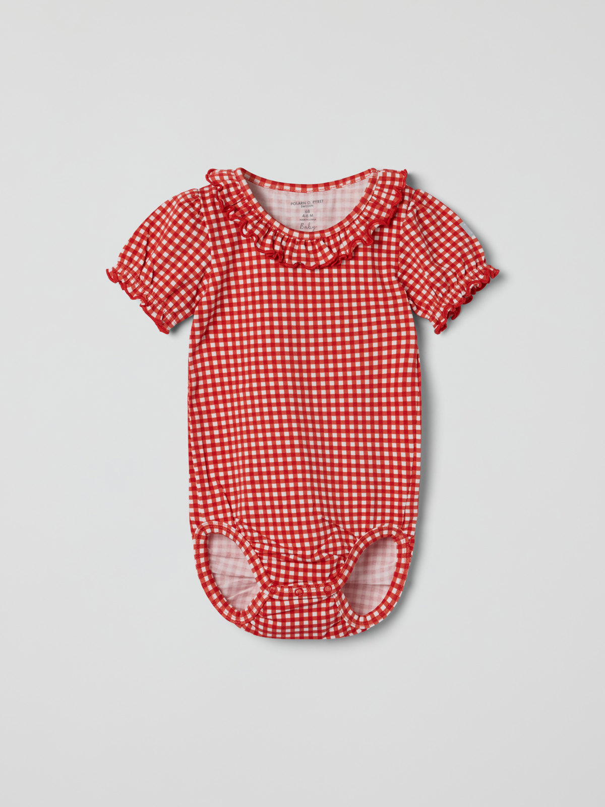 Checked short-sleeved bodysuit in soft organic cotton jersey with cute details – a lovely and soft summer favorite! The bodysuit has ruffles at the neckline and cuffs. The cuffs are also elastic. Snaps at the crotch facilitate dressing.