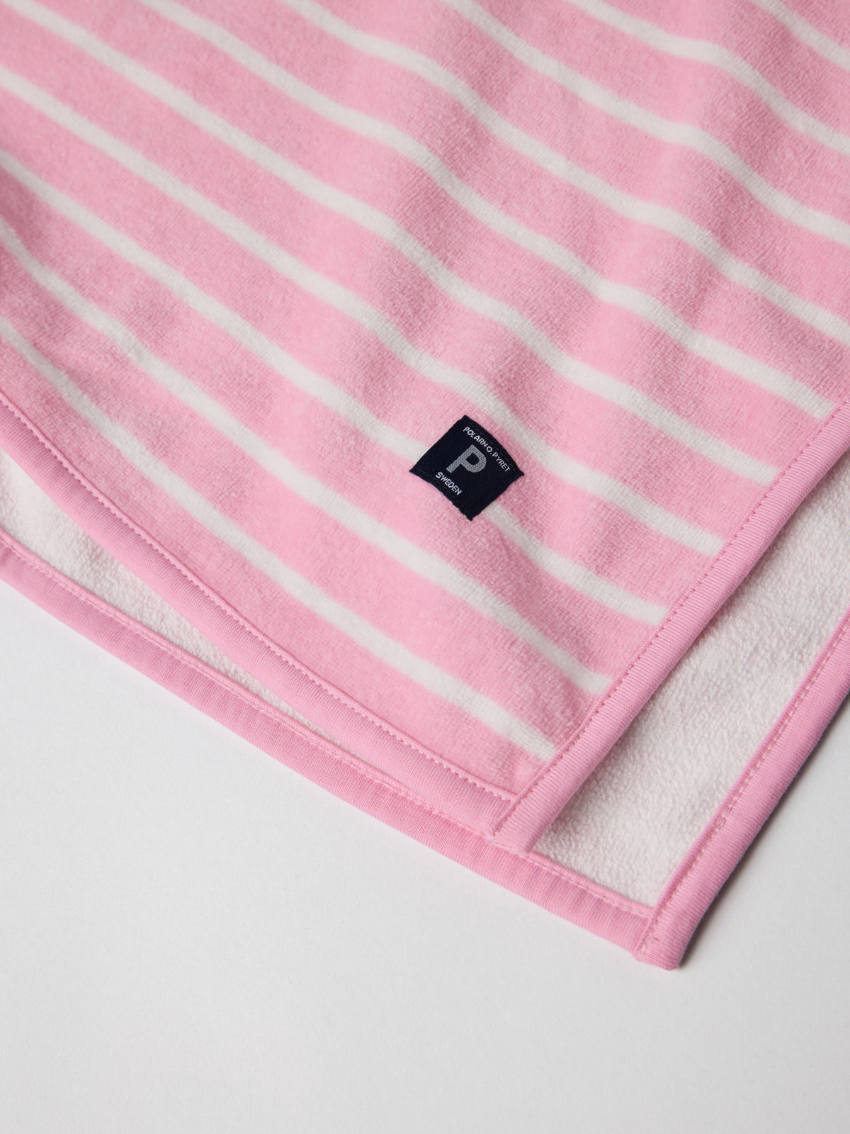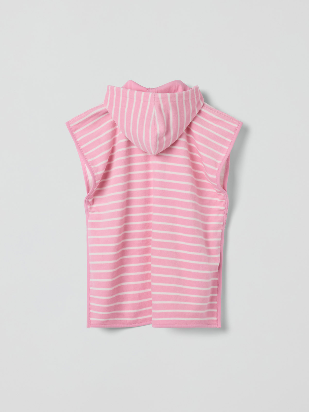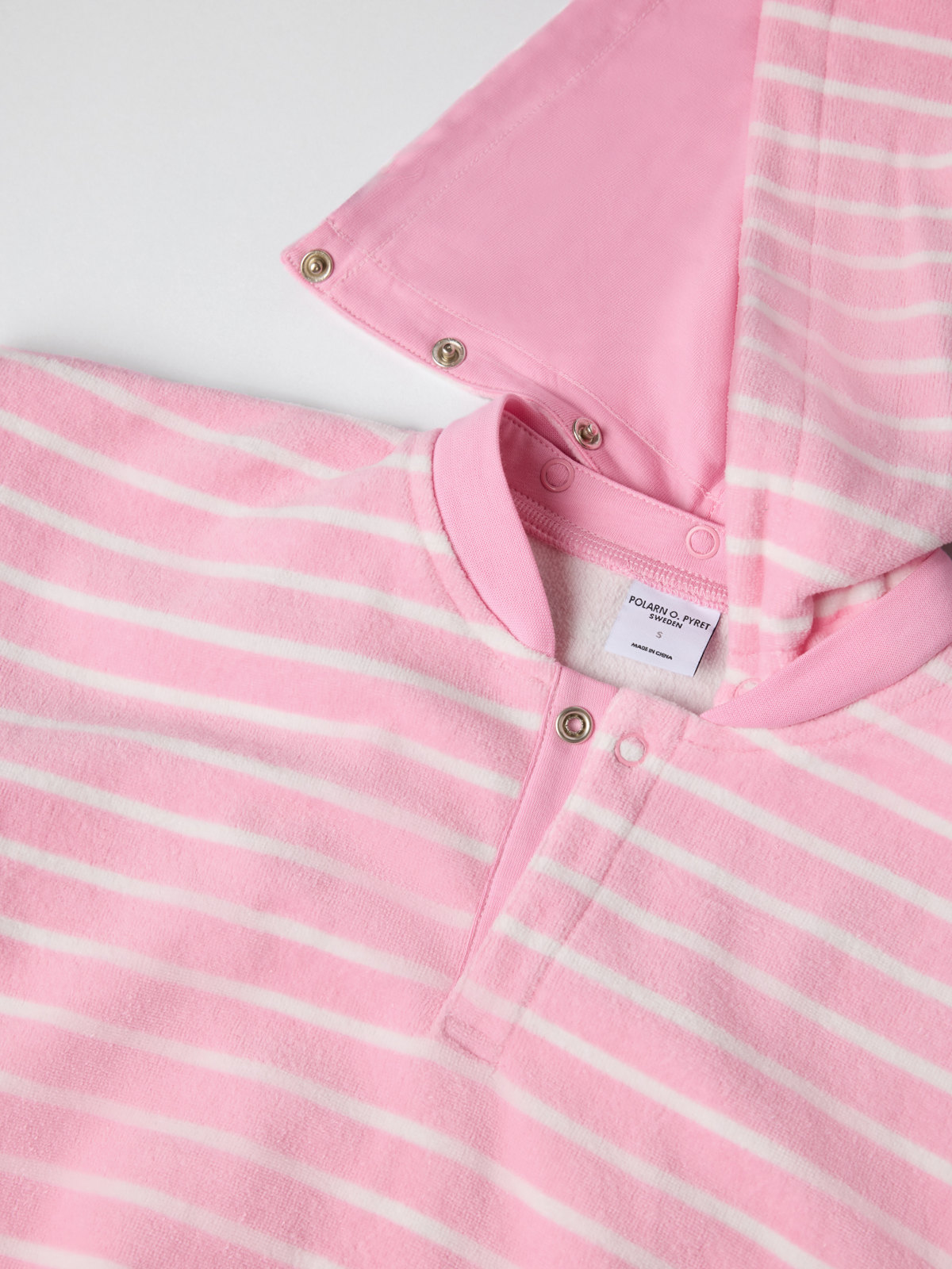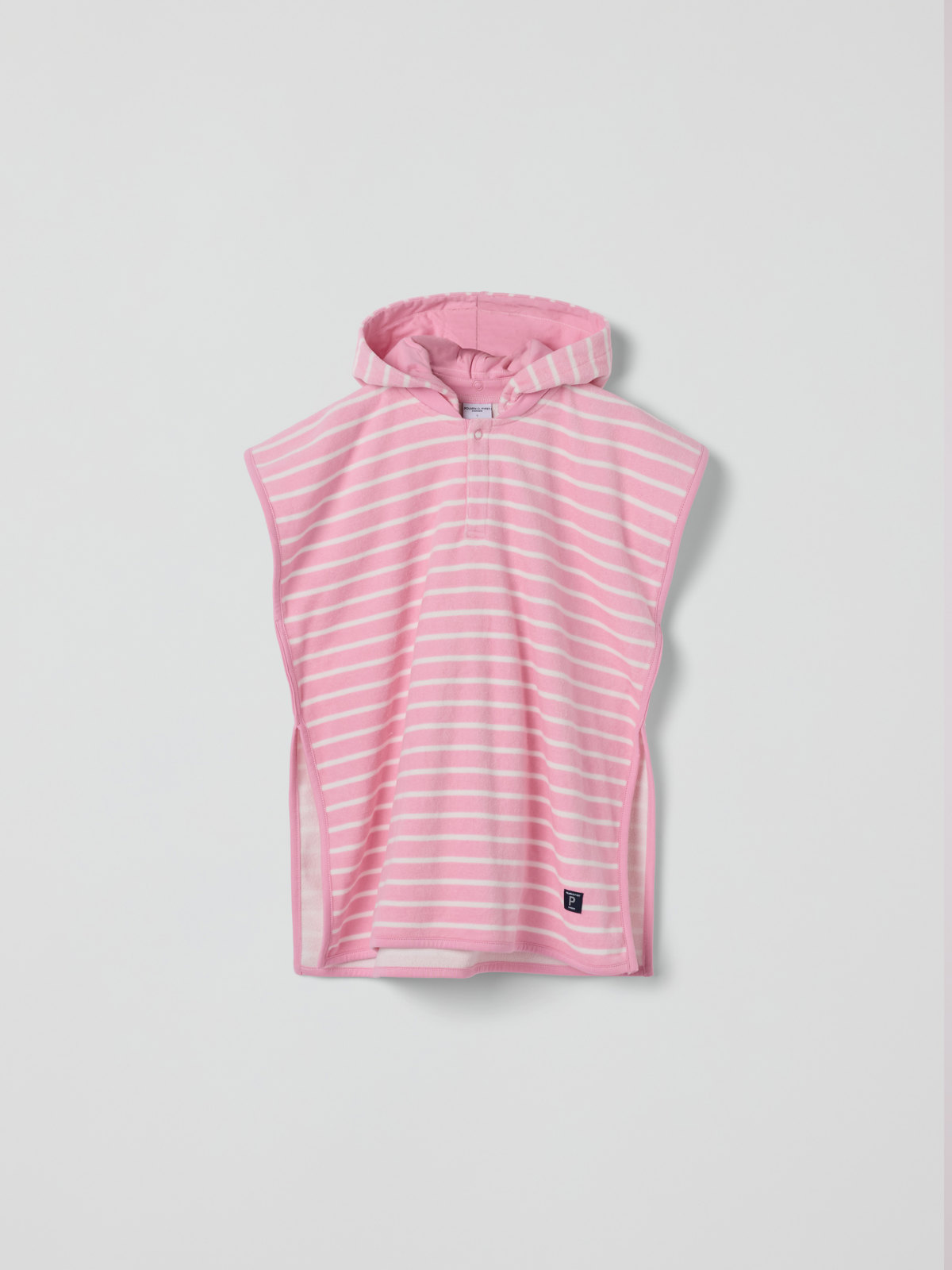 Striped towel poncho in soft cotton terry – perfect to wear after a swim! The poncho is made from organic cotton and recycled polyester, and fastens with a snap at the front. The detachable hood has a soft, solid color cotton lining.