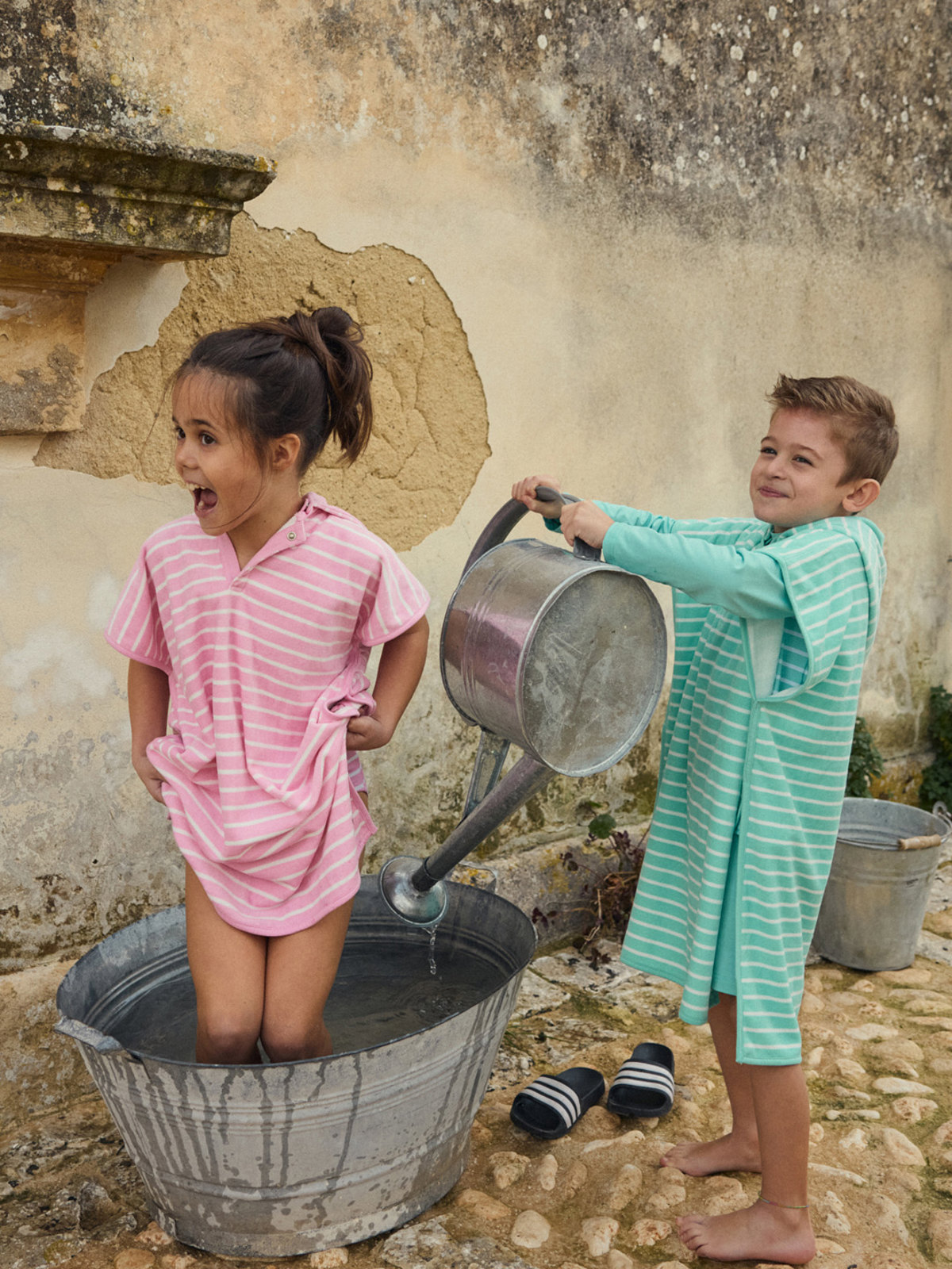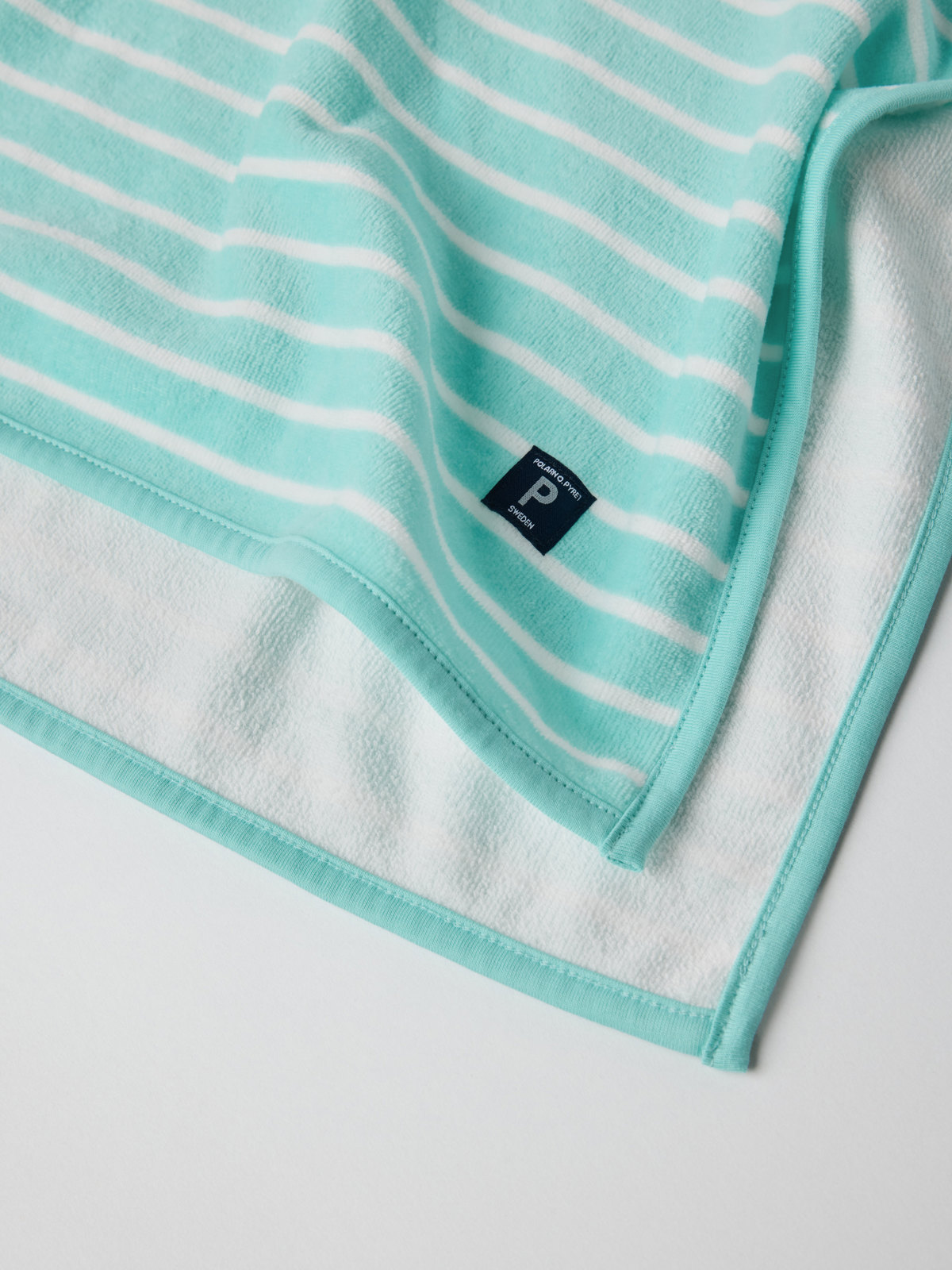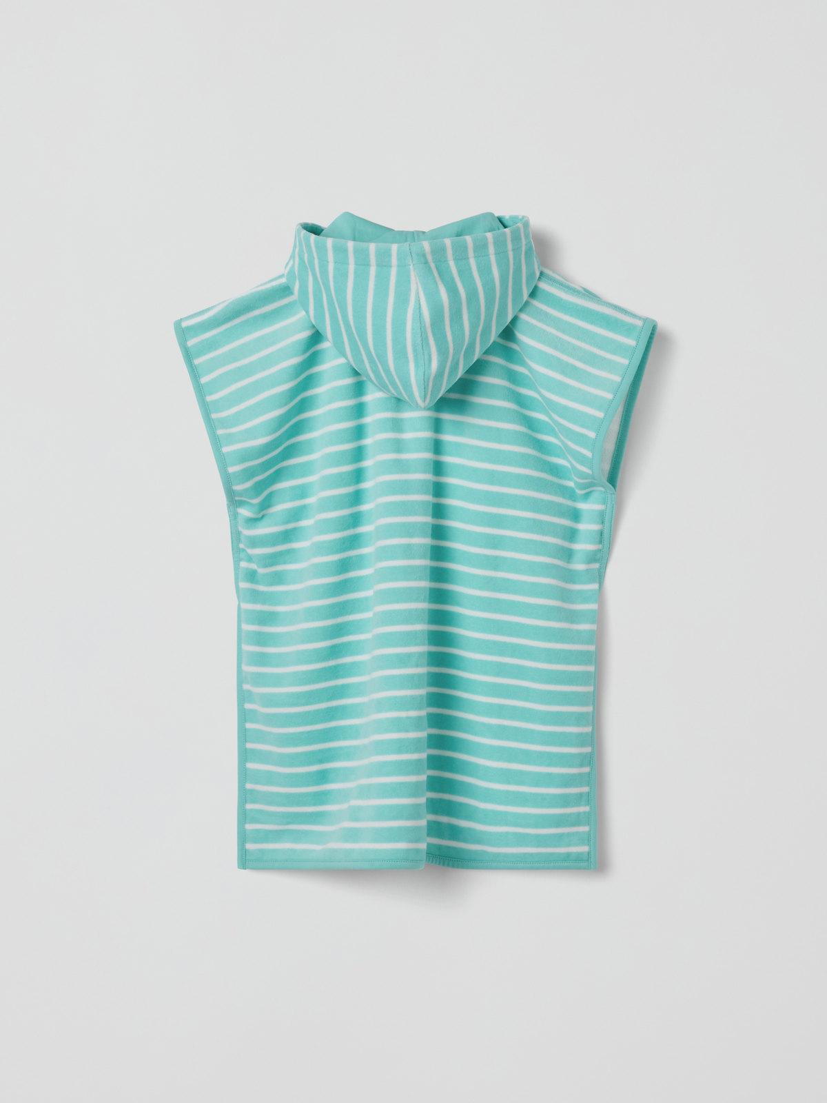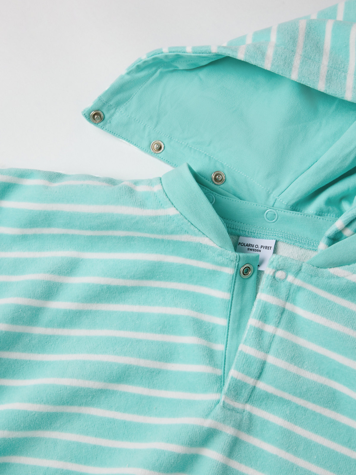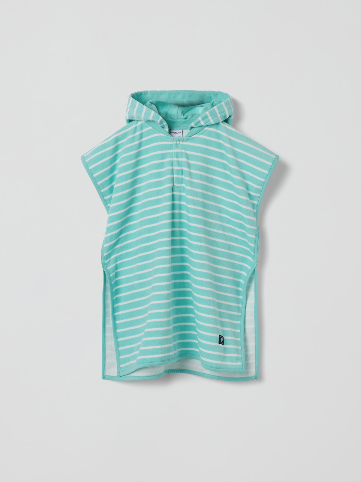 Striped towel poncho in soft cotton terry – perfect to wear after a swim! The poncho is made from organic cotton and recycled polyester, and fastens with a snap at the front. The detachable hood has a soft, solid color cotton lining.
