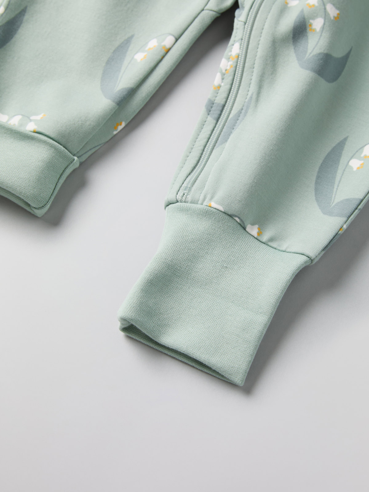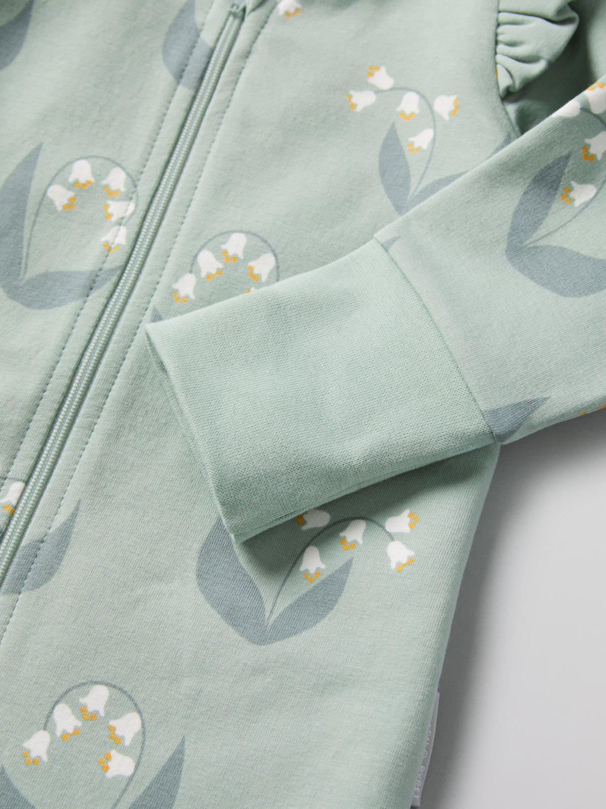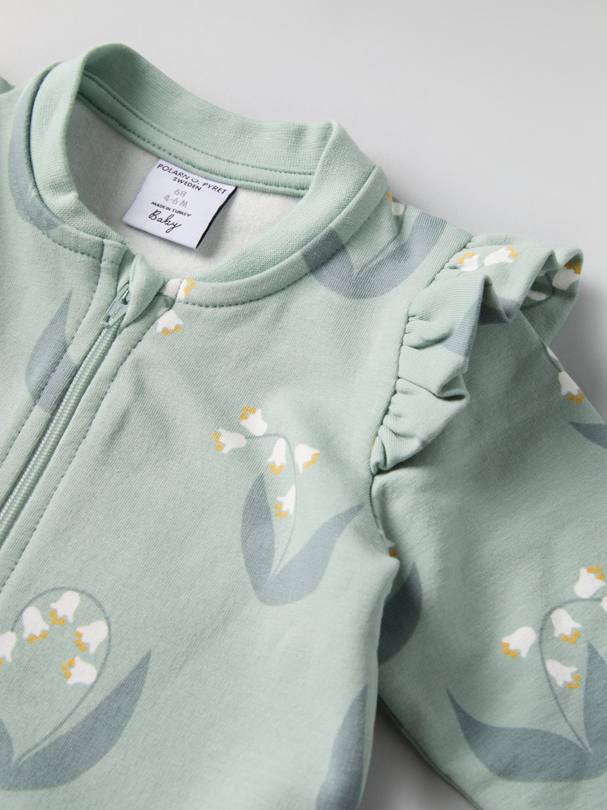 Soft all-in-one in organic cotton for baby, with a comfy sweatshirt quality and brushed inside. The all-in-one features an allover print of small flowers and fancy ruffles over the shoulders.