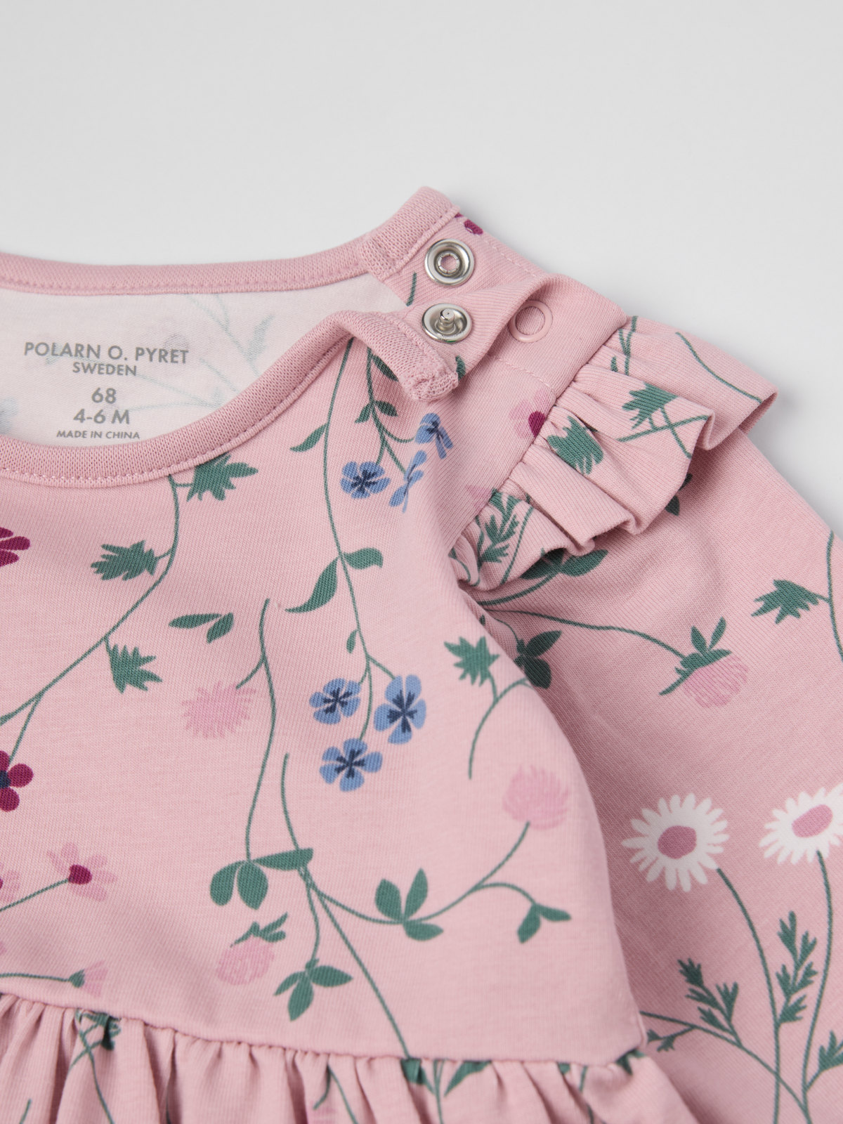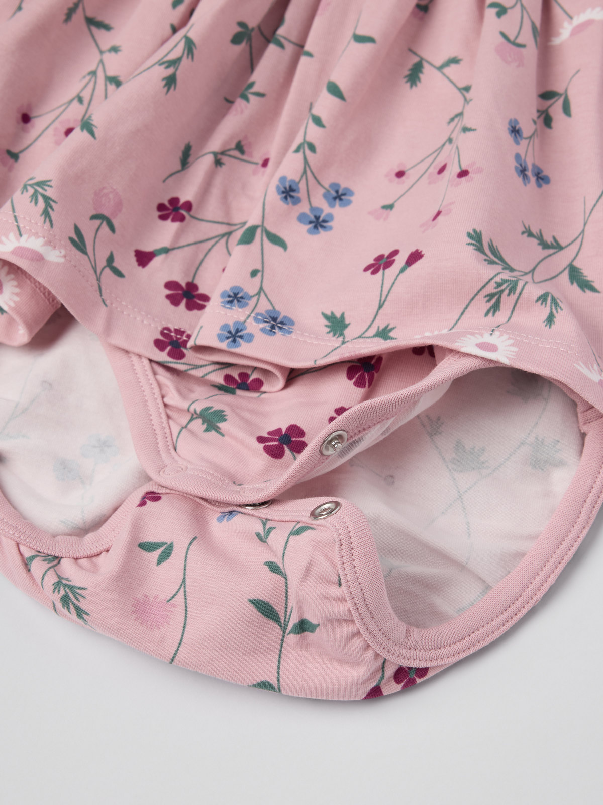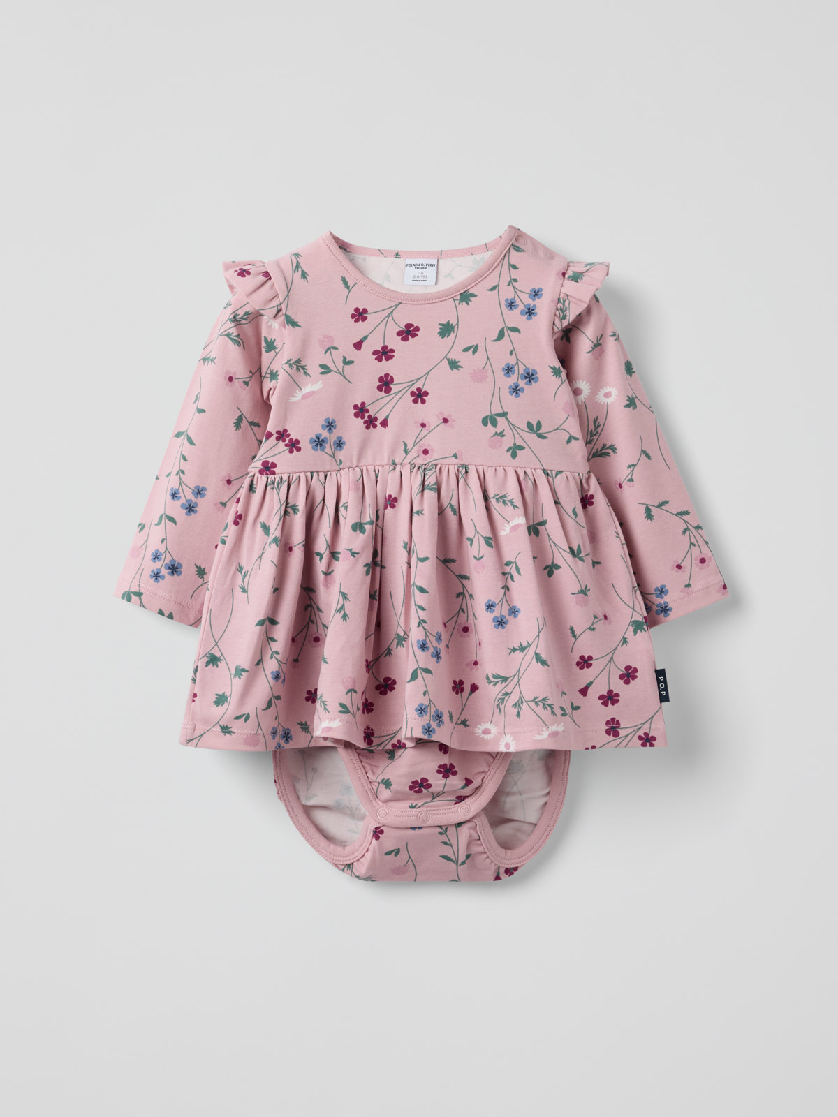 A practical combination of a dress and babygrow in soft, organic cotton. This dress features a floral print adorned with pretty ruffles over the shoulders. Snaps at the crotch and shoulder make dressing easy.