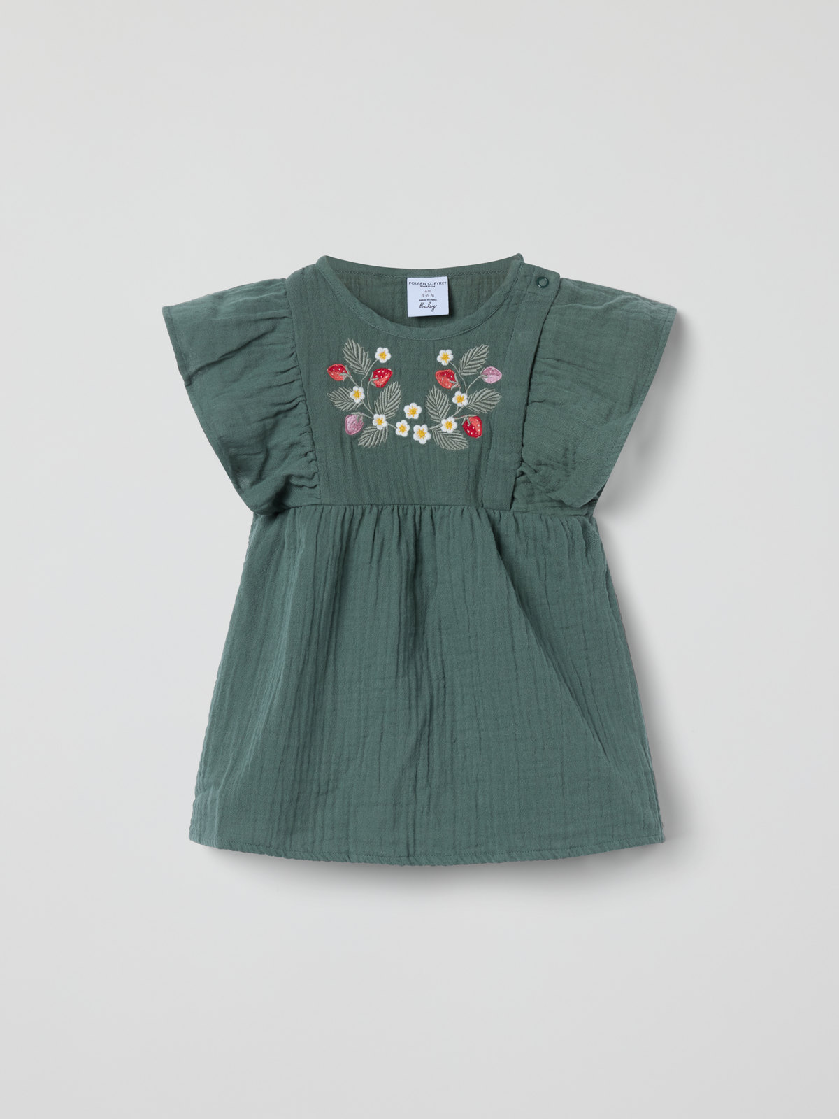 Cute dress in soft muslin made of 100% organic cotton for baby – a must-have for summer festivities! The dress has soft ruffles over the shoulders and pretty embroidery on the chest. Snaps on the shoulder for easy dressing.