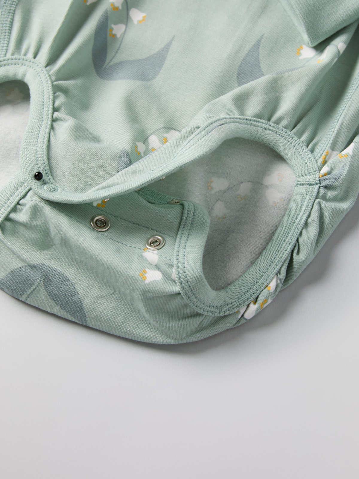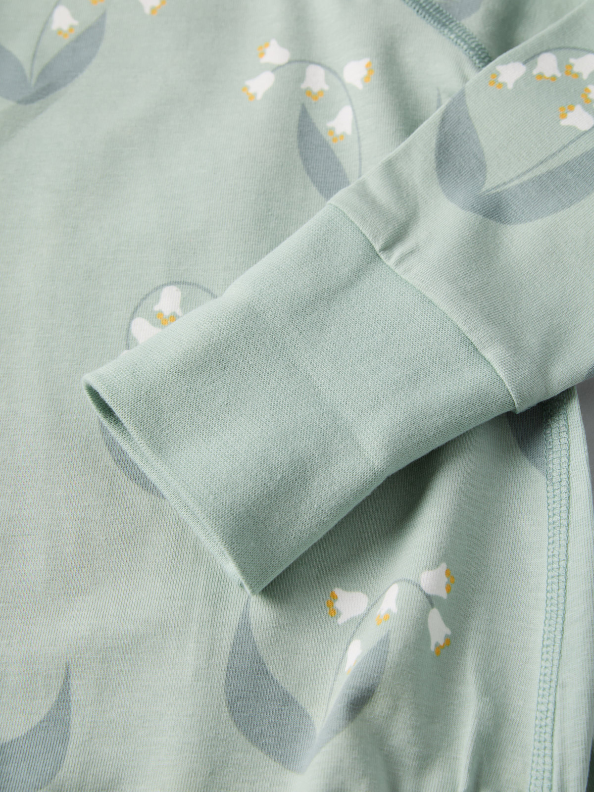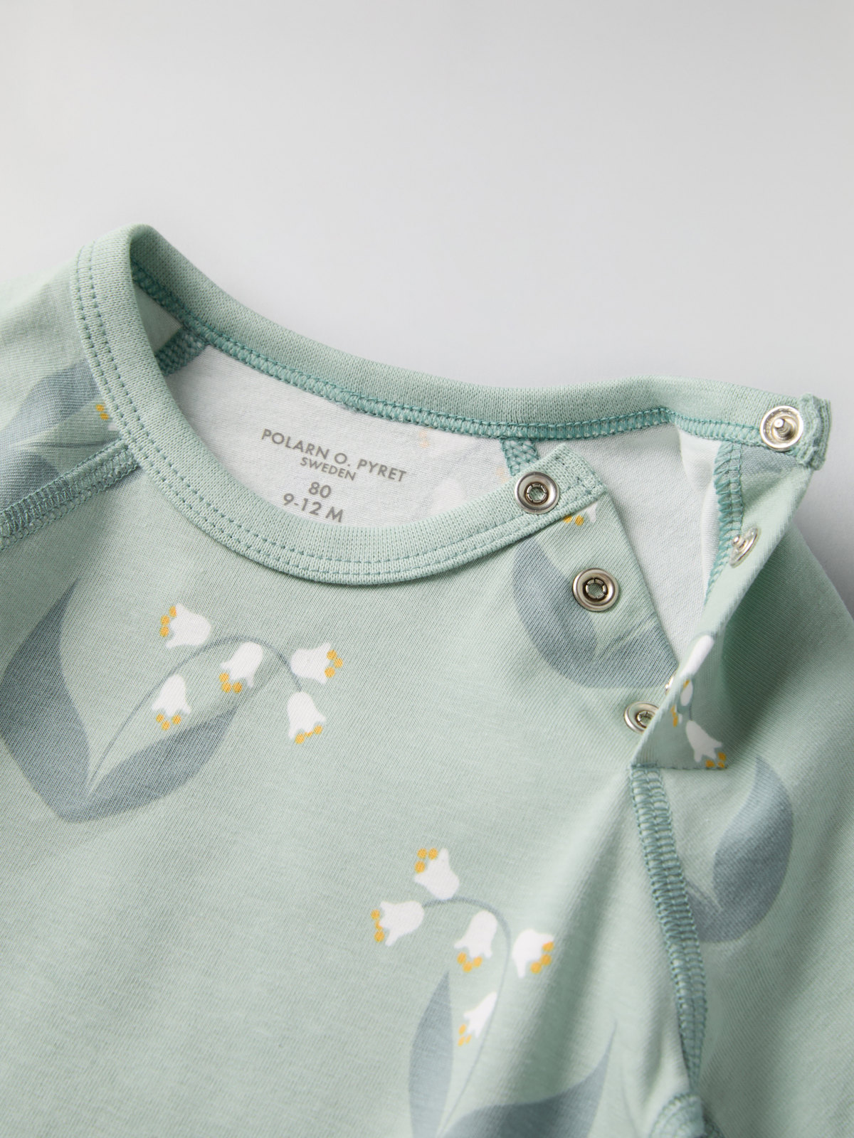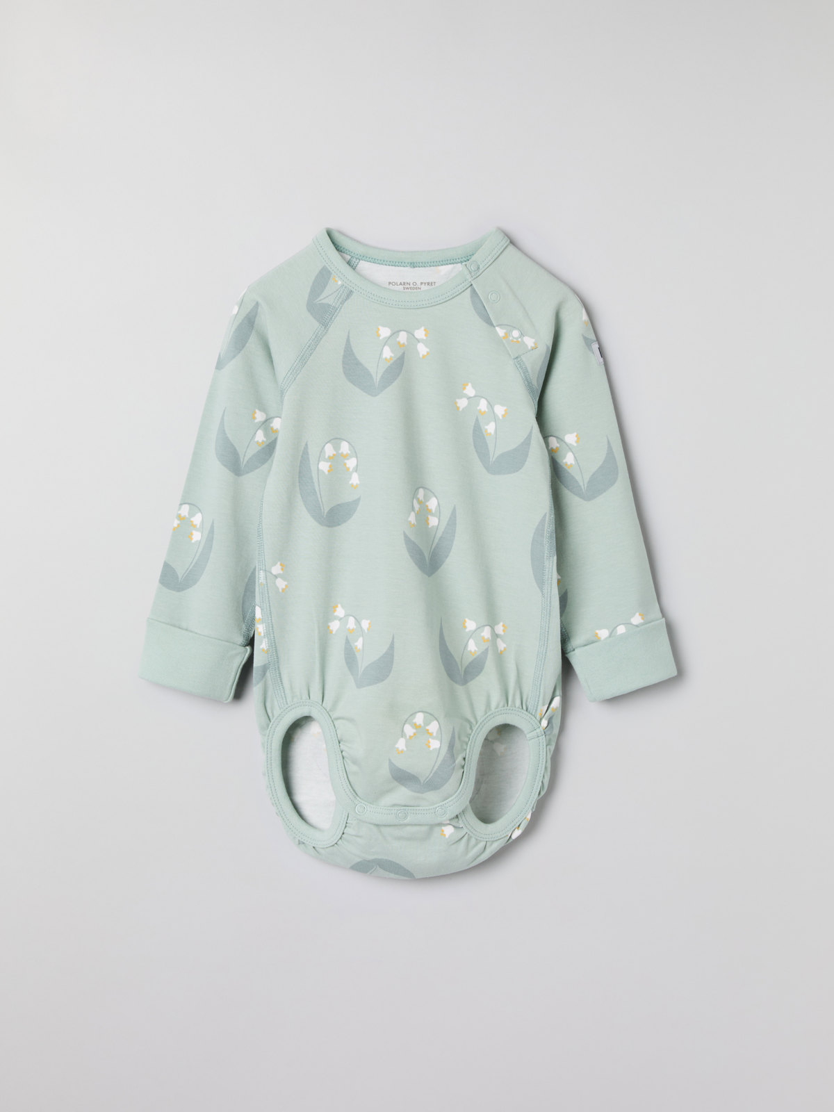 Babygrow in 100% organic cotton. Thanks to the clever solution with an extra row of snaps at the crotch and fold-down cuffs, the bodysuit can grow with the baby!