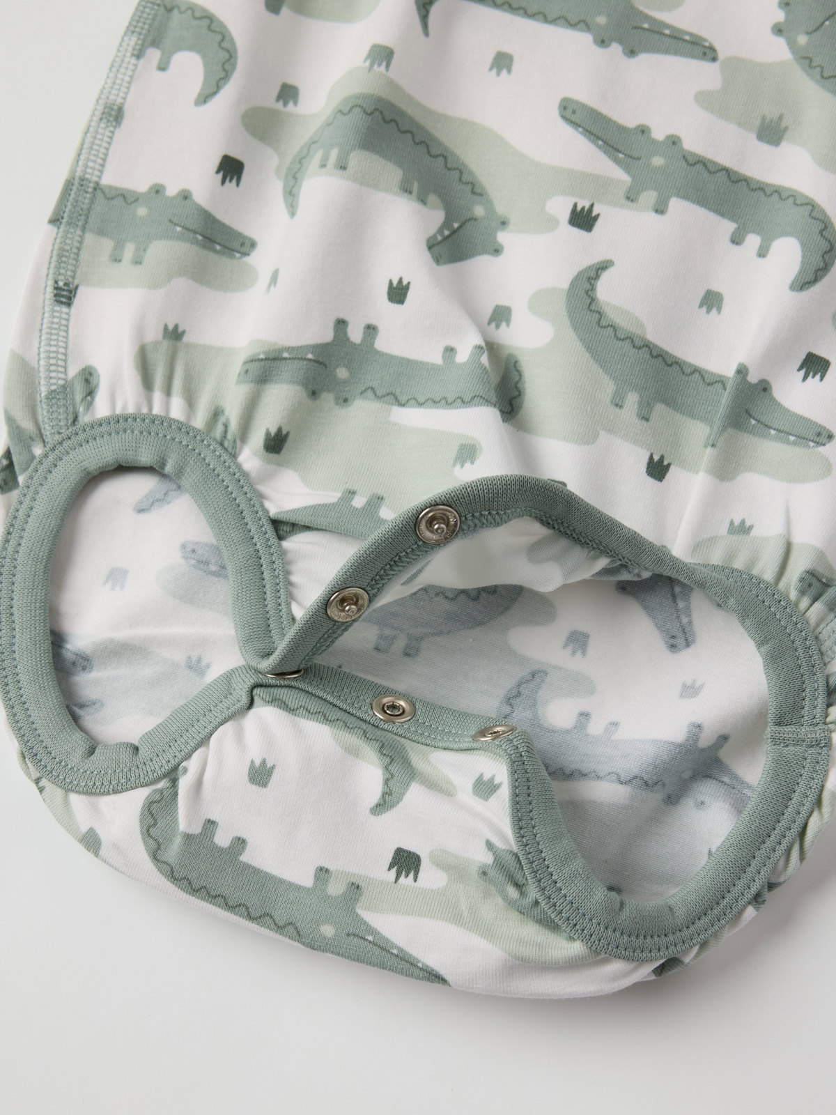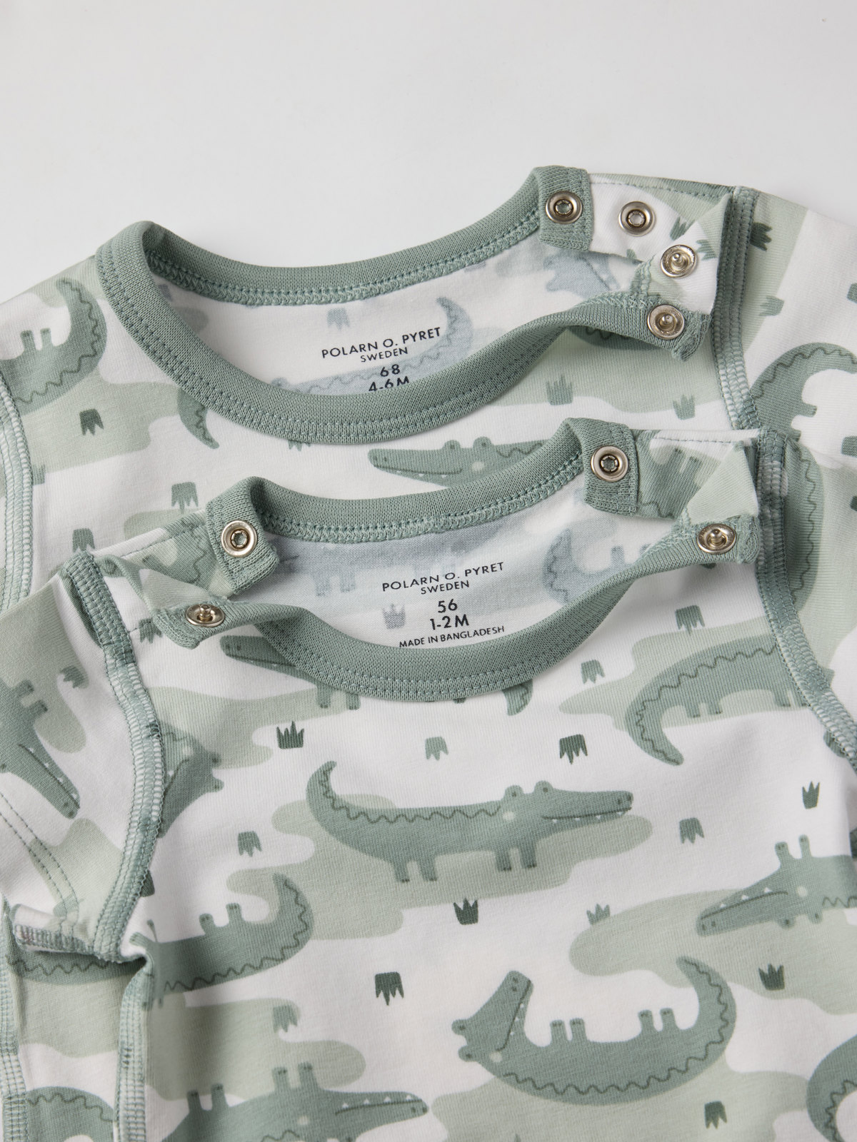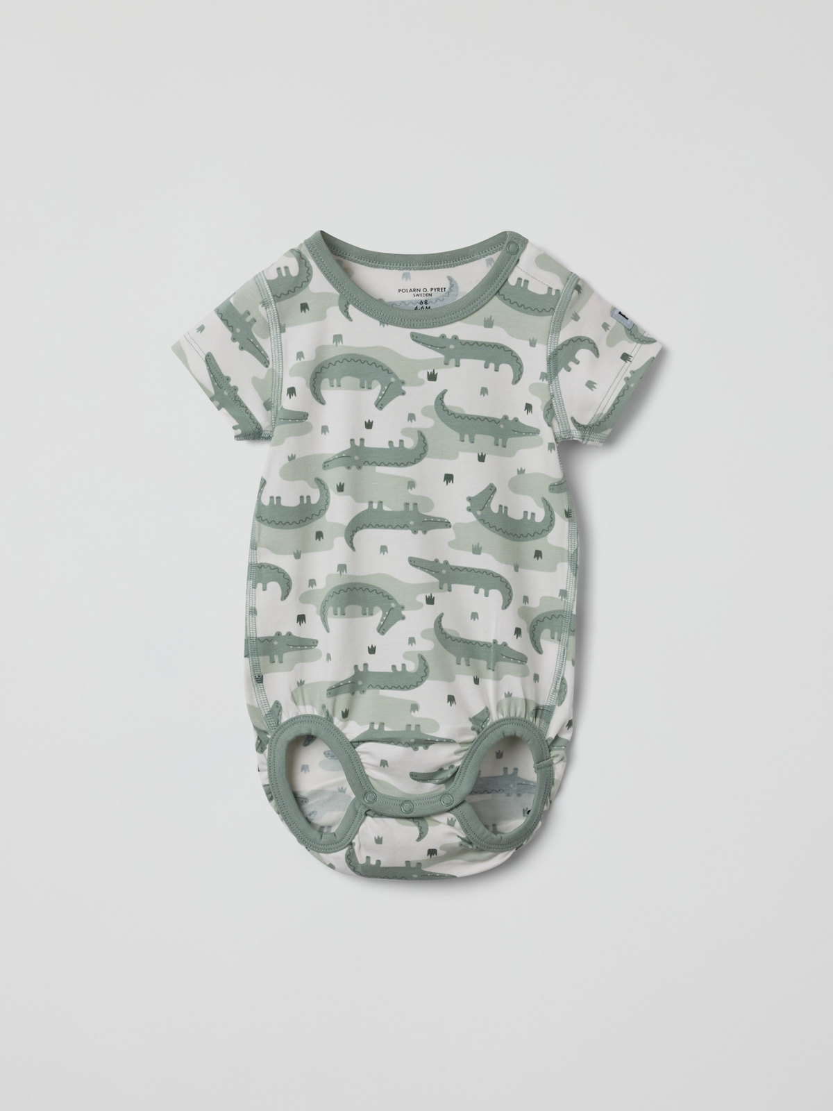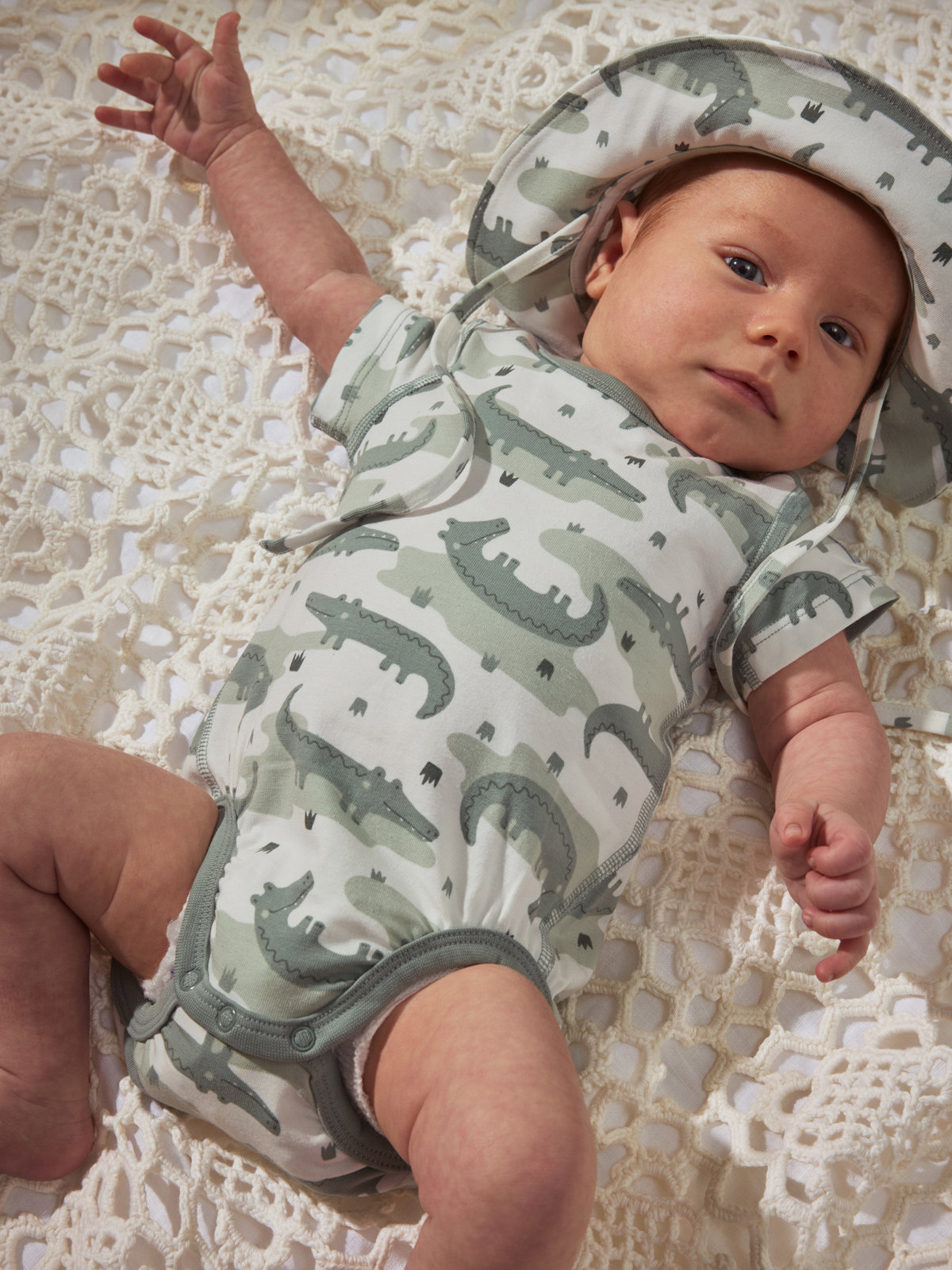 Short-sleeved bodysuit in soft organic cotton, with extra soft, flatlock seams that are gentle on sensitive skin. The bodysuit features an allover crocodile print – a real summer favorite! Snaps at the crotch and one shoulder make dressing easy.