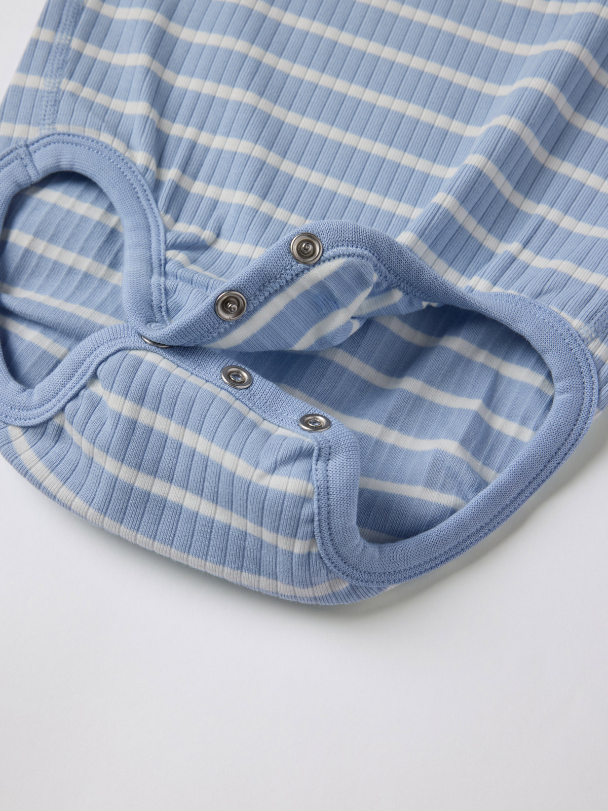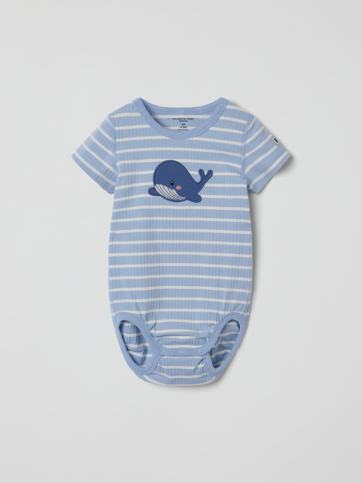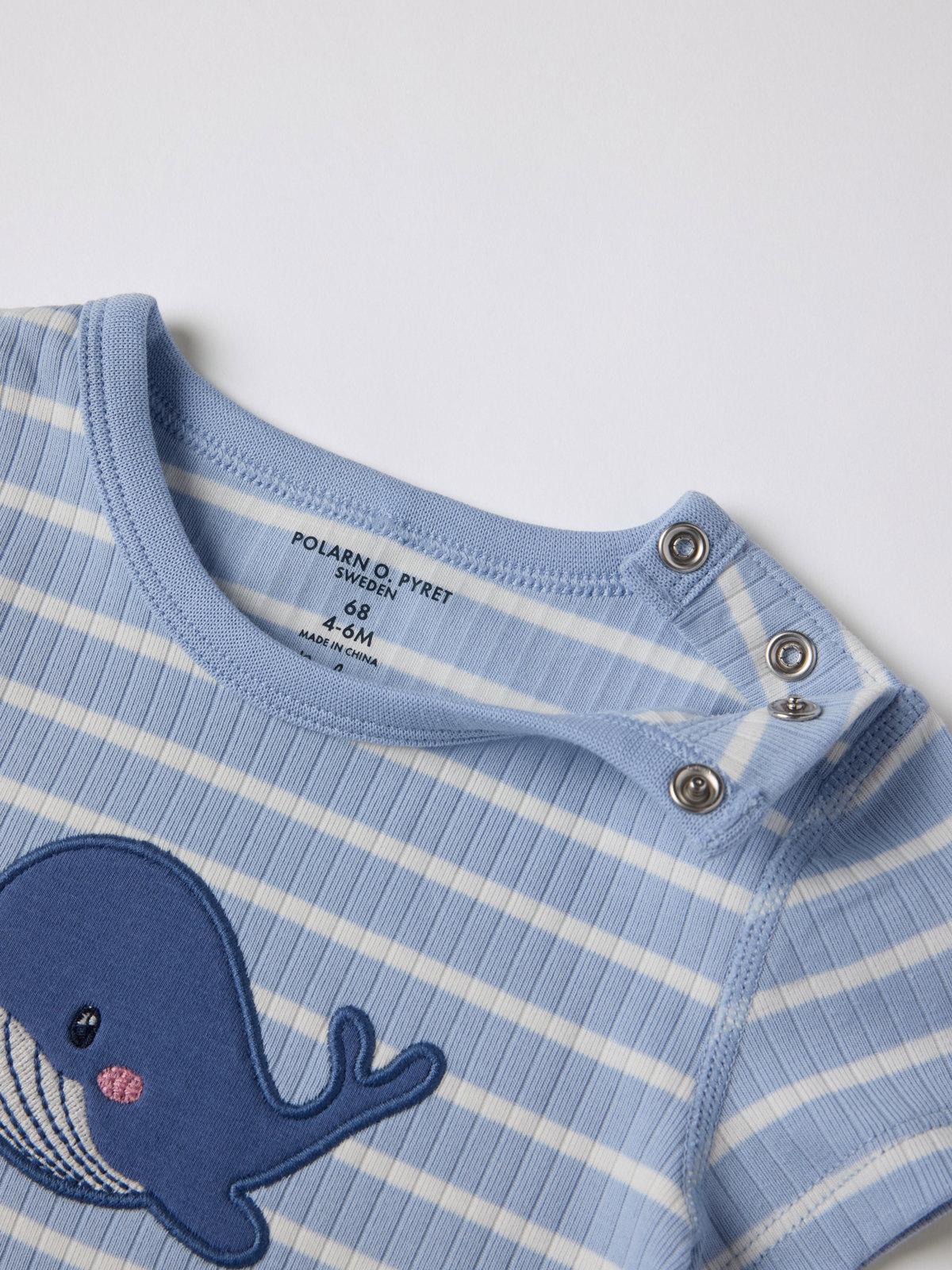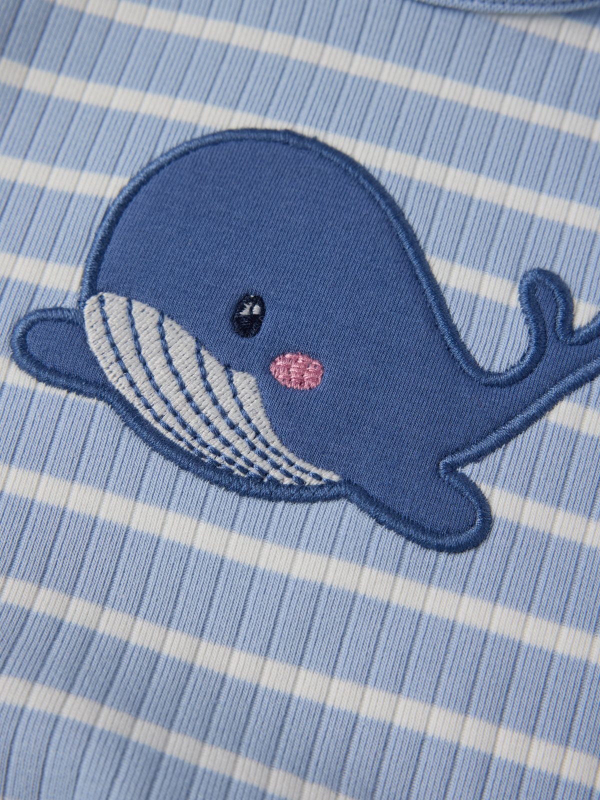 Short-sleeved ribbed bodysuit in organic cotton, with extra soft, flatlock seams that are gentle on sensitive skin. The bodysuit has a large whale print on the chest – a playful summer favorite! Snaps at the crotch and one shoulder make dressing easy.
