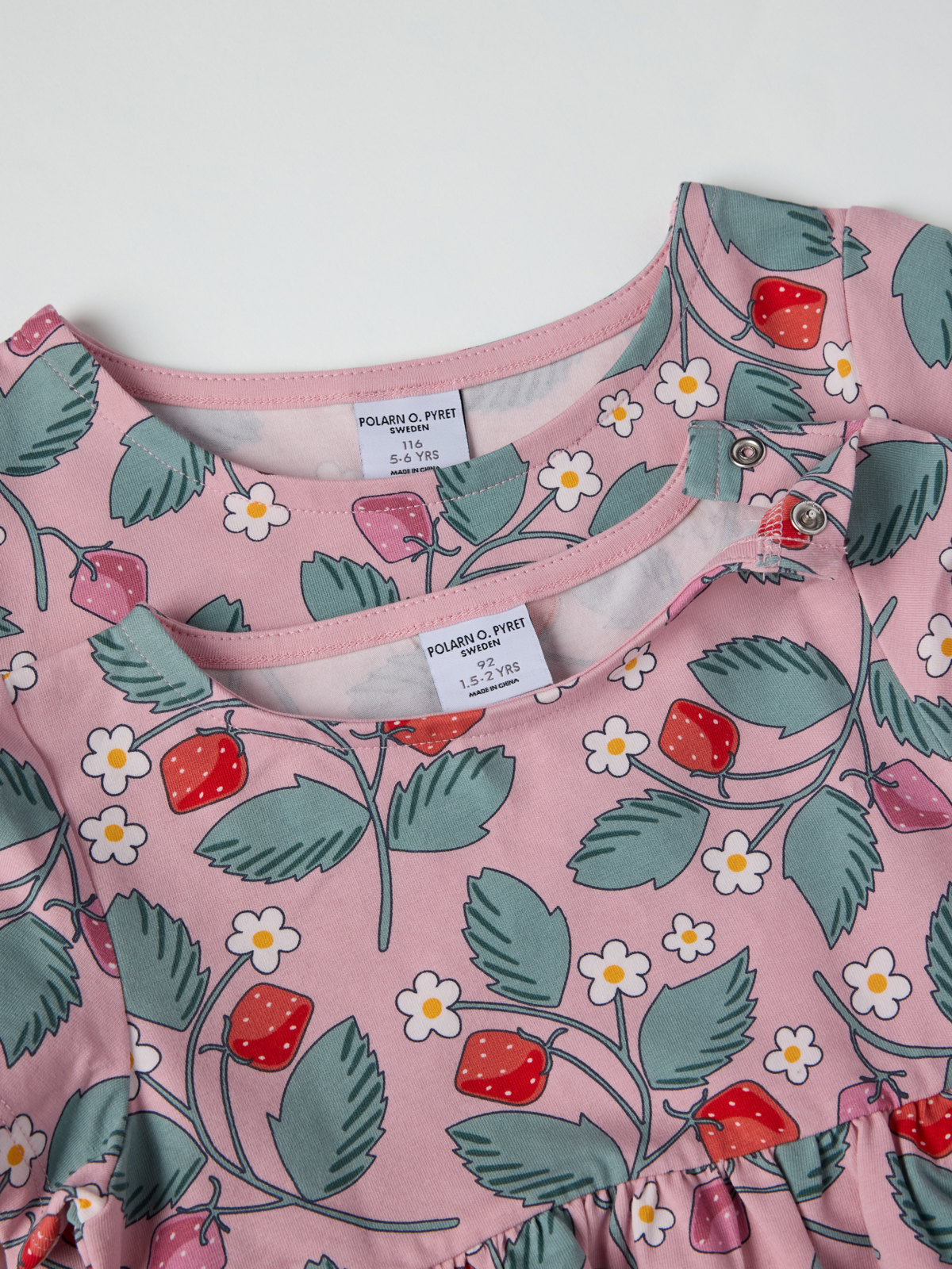 Size 86–92 has a higher waist, a gathered skirt, and a snap on the shoulder to facilitate dressing.