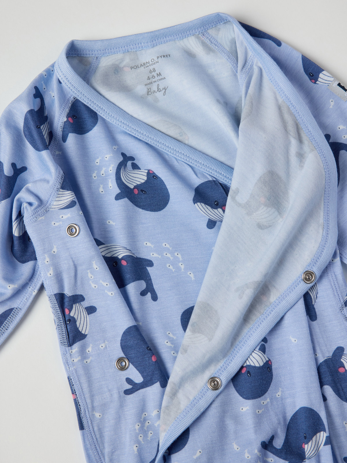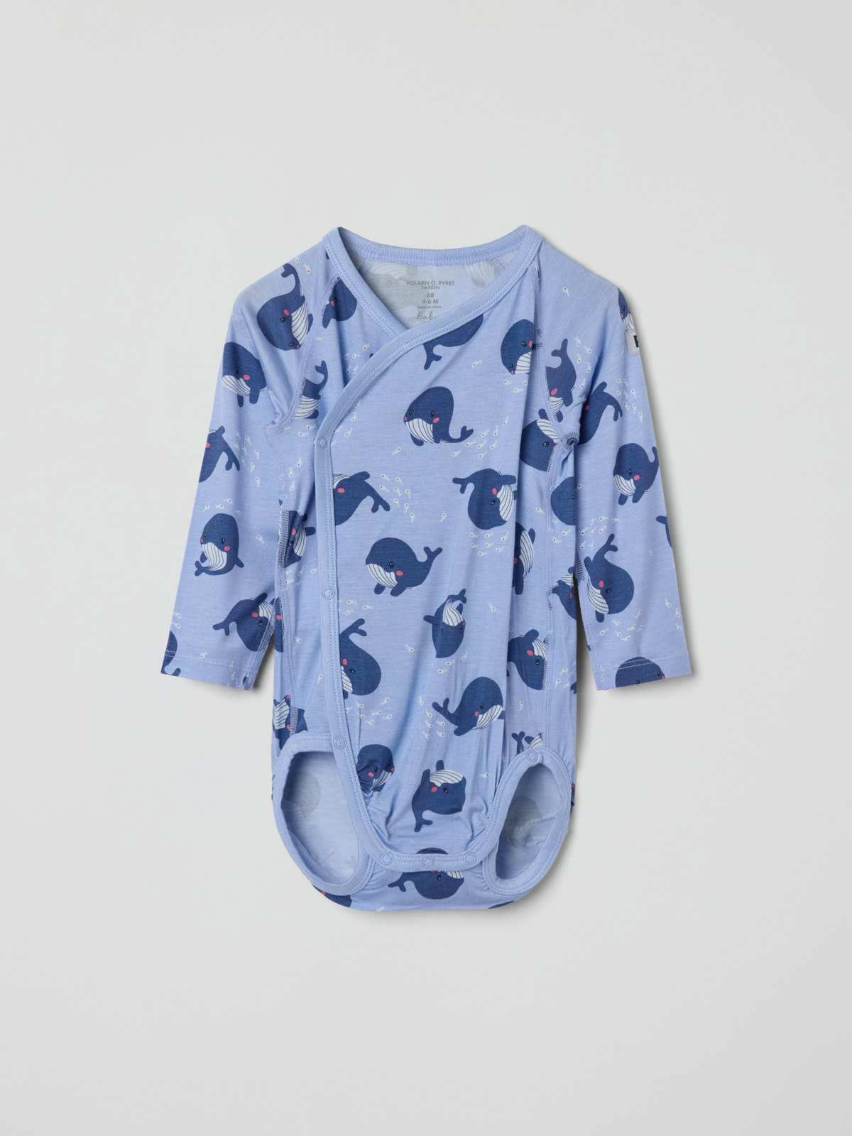 Wrap bodysuit made of thin and cool Ecovero™ Viscose jersey – perfect for warm summer days. The bodysuit has extra-soft, flatlock seams that are gentle on sensitive skin. It features an allover whale print and matches well with the entire collection. Snaps along the flap opening and at the crotch make changing clothes easier.
