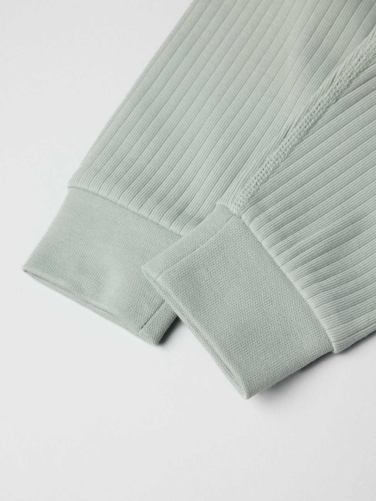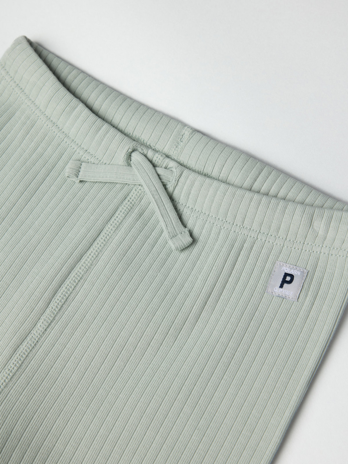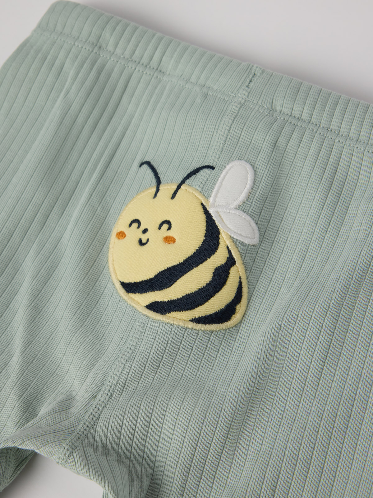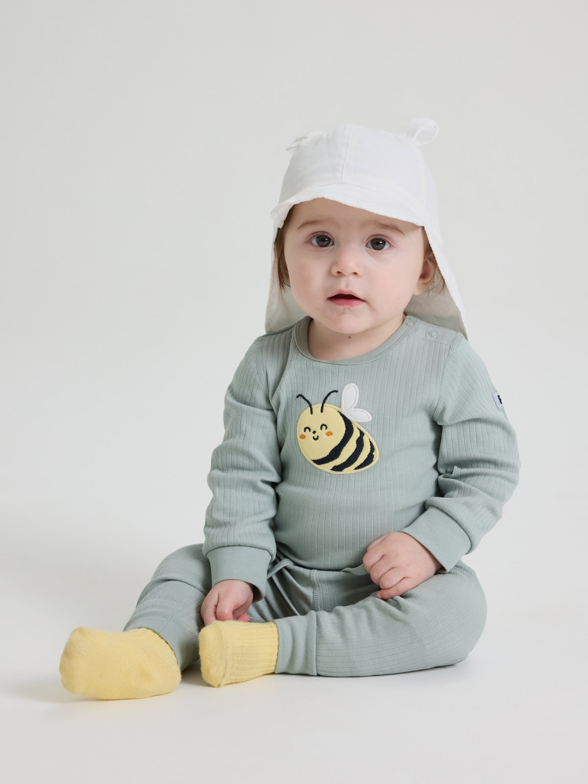 Ribbed pants in soft organic cotton for baby, with a delightful bee appliqué on the back. The pants have an elastic waist that can be adjusted with drawstring, and soft ankle cuffs for a good fit.